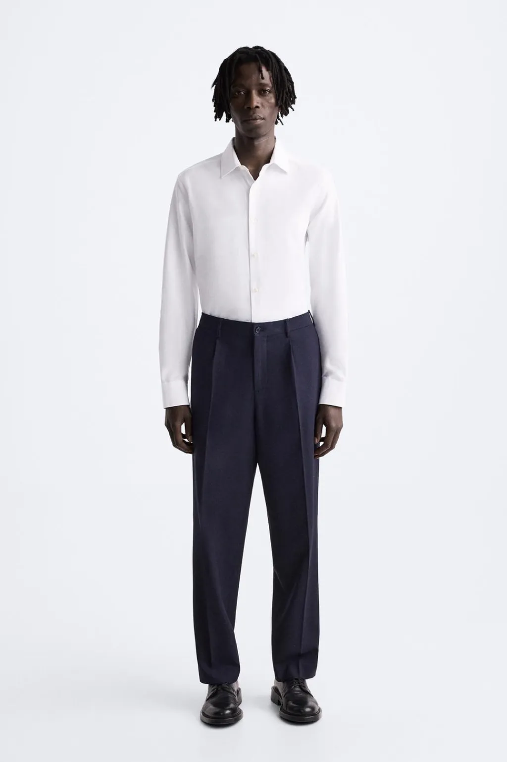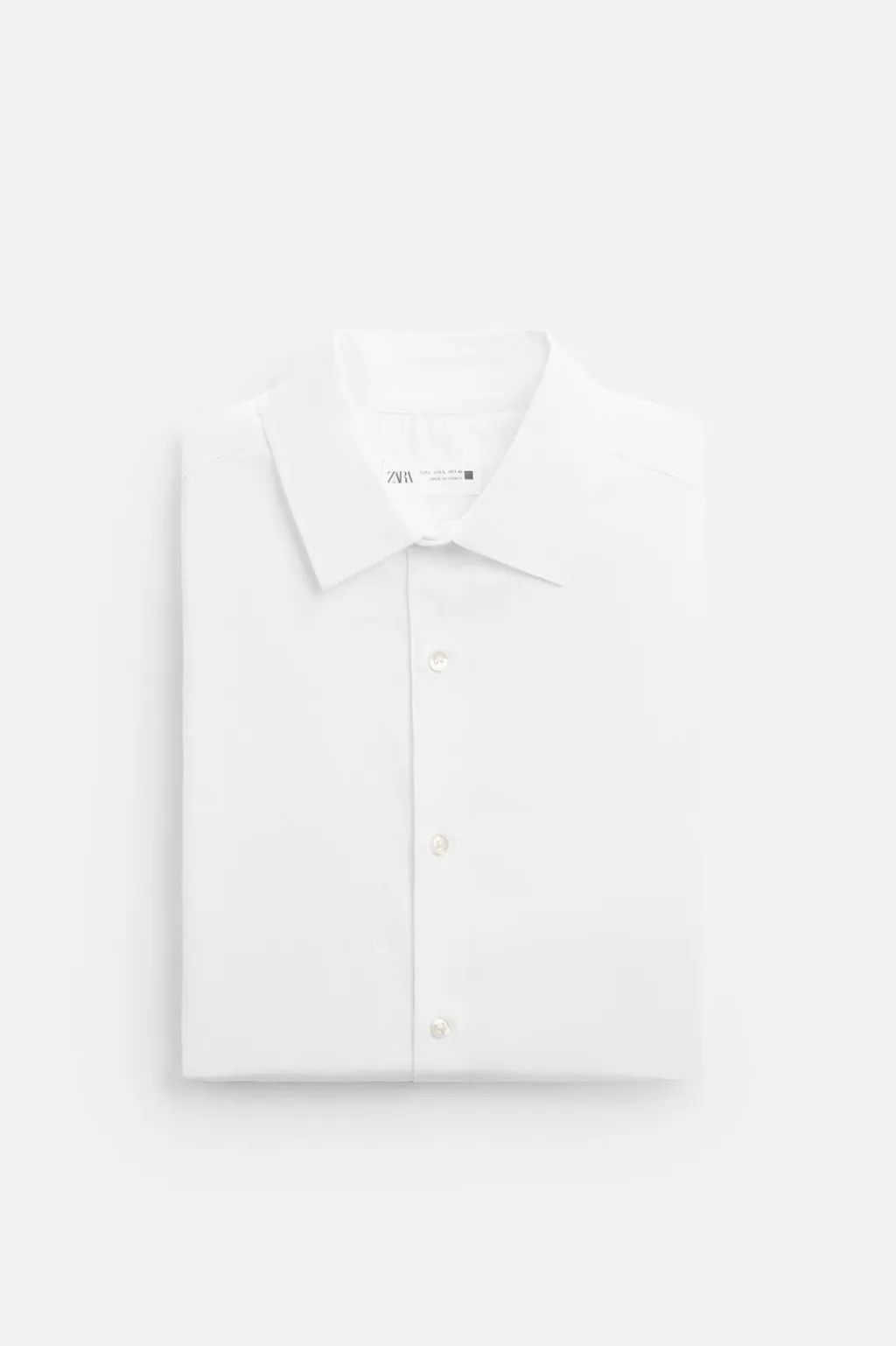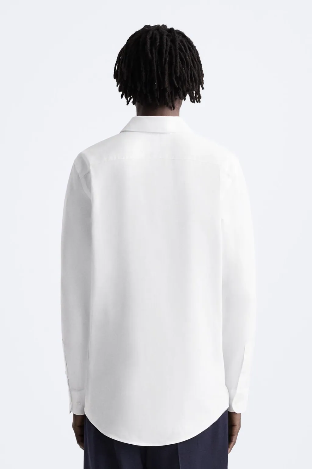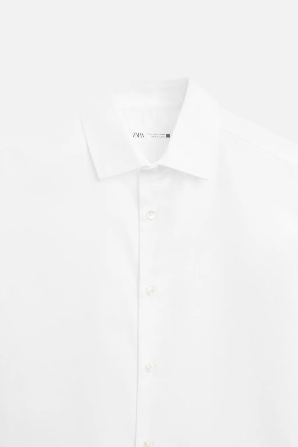 Camisa regular fit confeccionada en tejido de algodón. Cuello italiano y manga larga acabada en puño con botón.