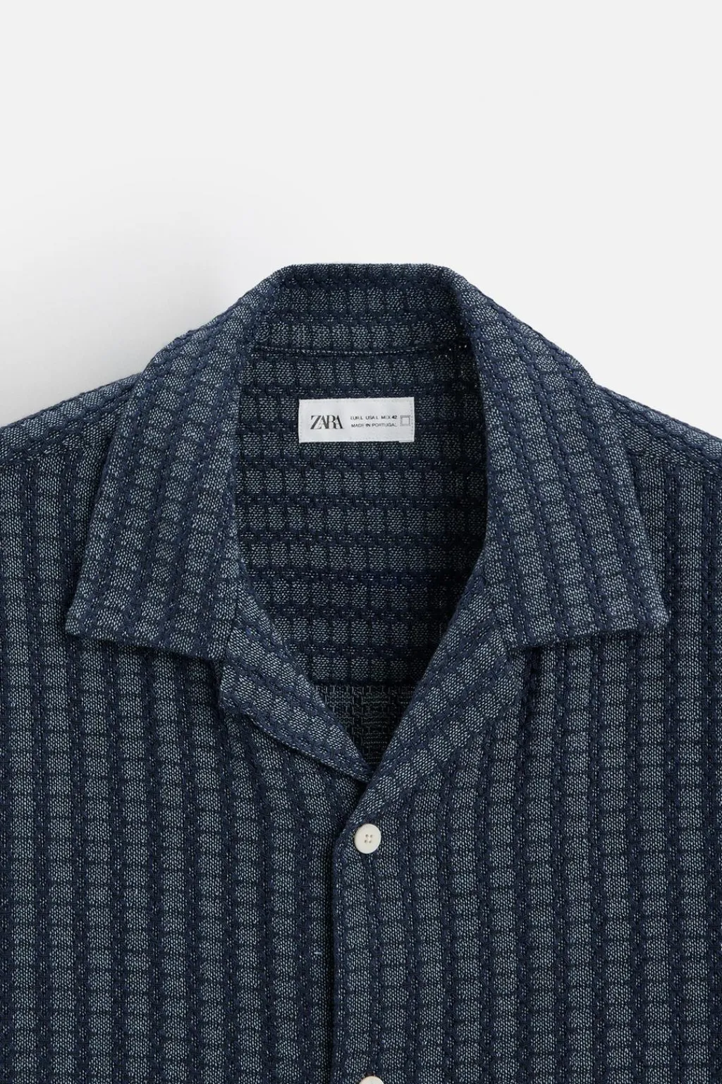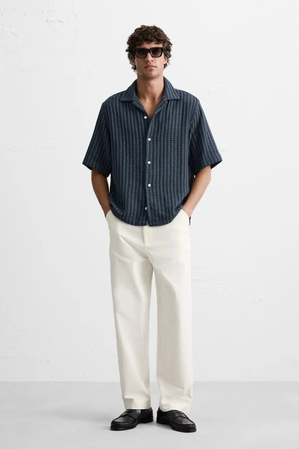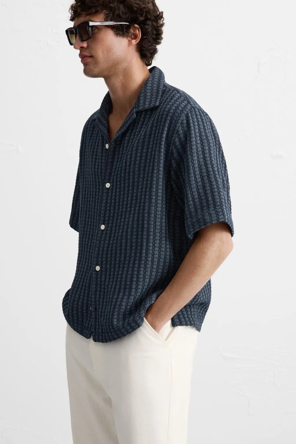 Camisa relaxed fit confeccionada en tejido con mezcla de algodón. Cuello bowling y manga corta. Cierre frontal de botonadura.