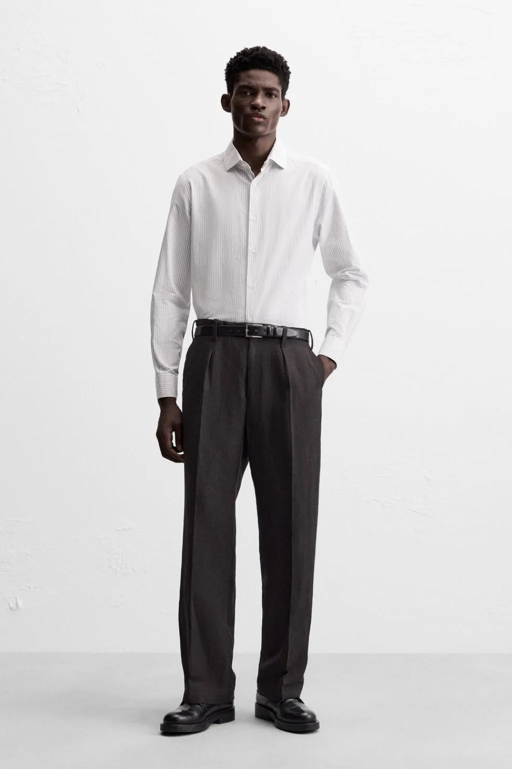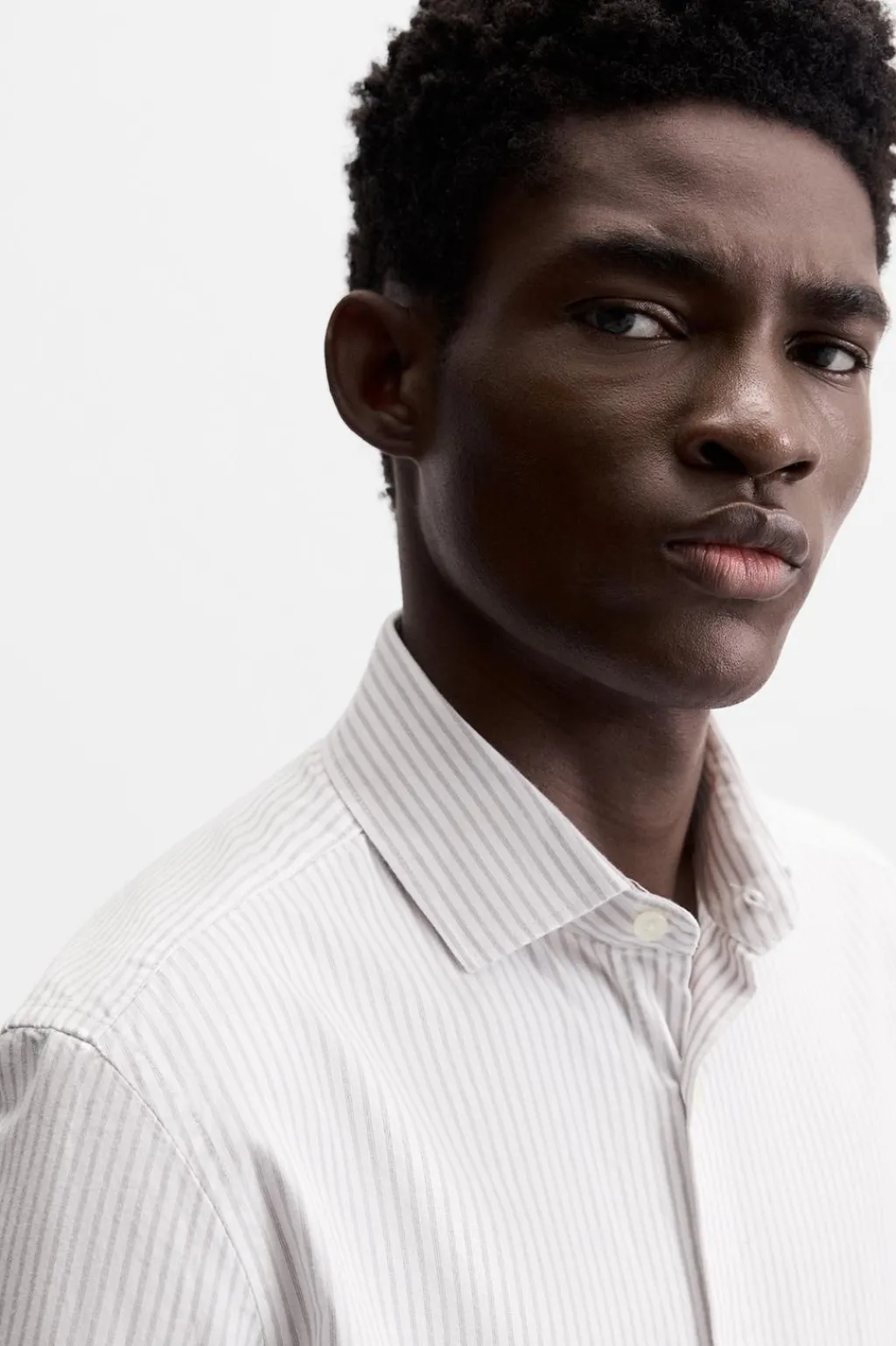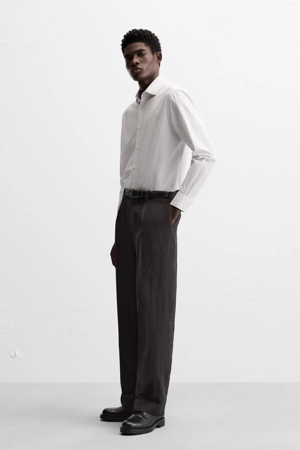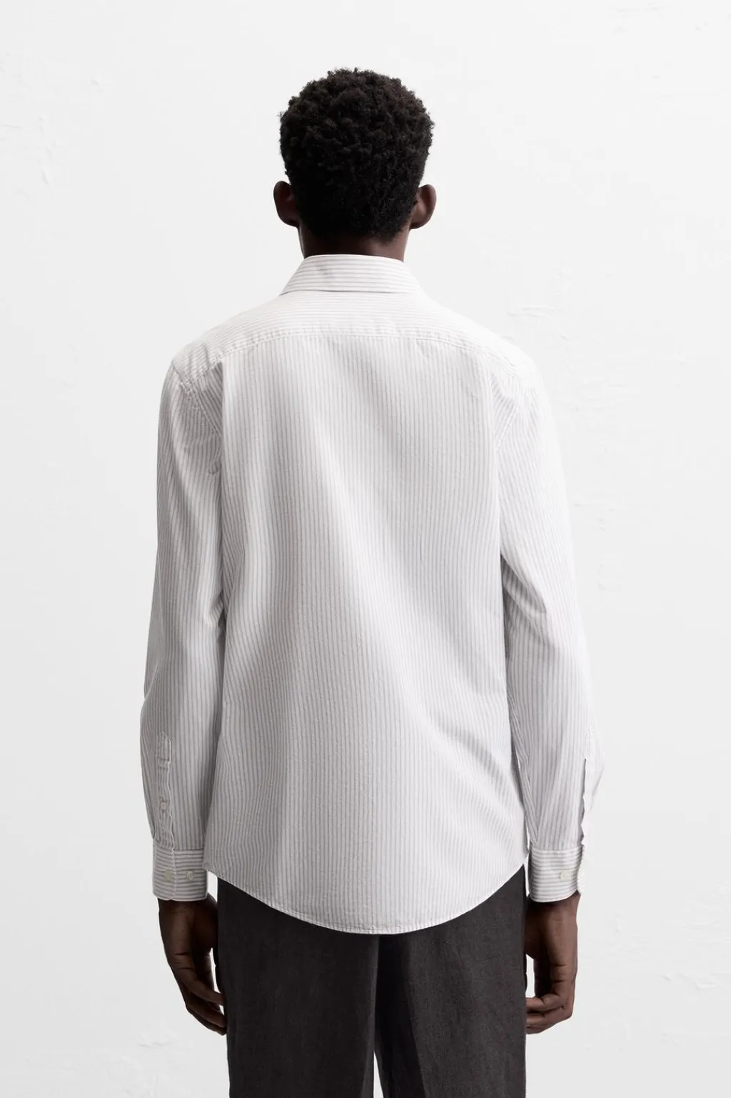 Camisa regular fit confeccionada en algodón con estructura diagonal. Cuello italiano y manga larga acabada en puño con botón. Cierre frontal de botonadura.
