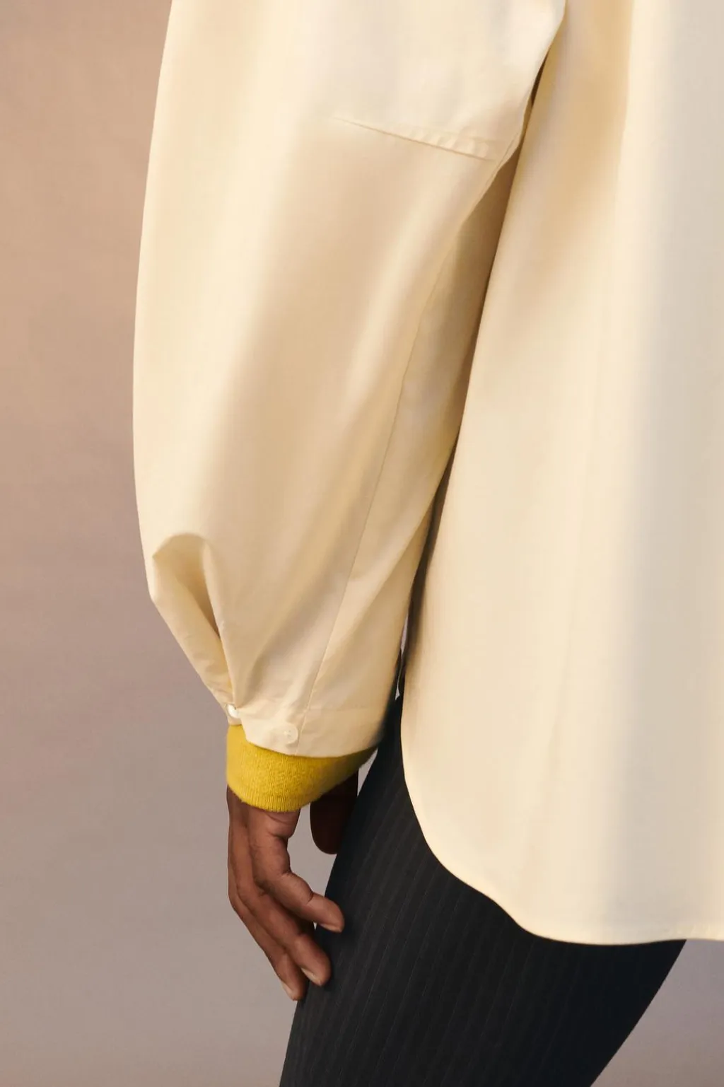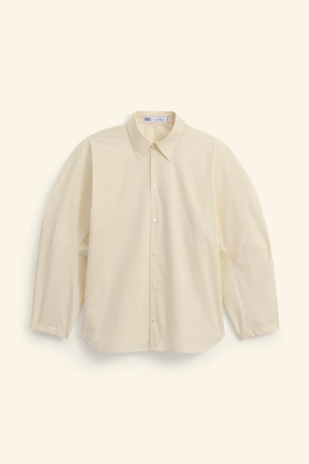 Camisa relaxed fit confeccionada en tejido de algodón con elasticidad. Cuello solapa y manga larga con volumen globo acabada en puño ajustable con botones. Cierre frontal de botonadura.