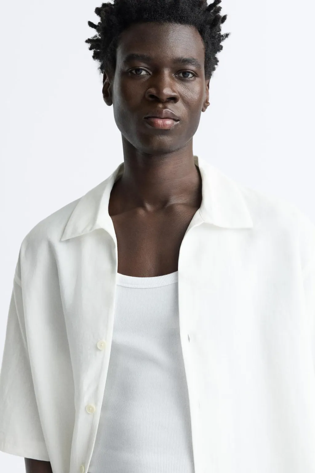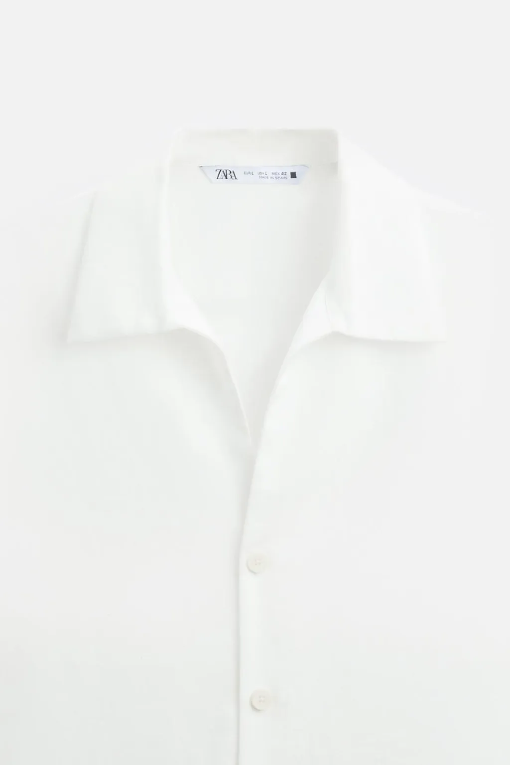 Camisa relaxed fit confeccionada en tejido con mezcla de lyocell. Cuello solapa con abertura frontal. Manga corta. Bajo con aberturas laterales. Cierre frontal de botonadura.