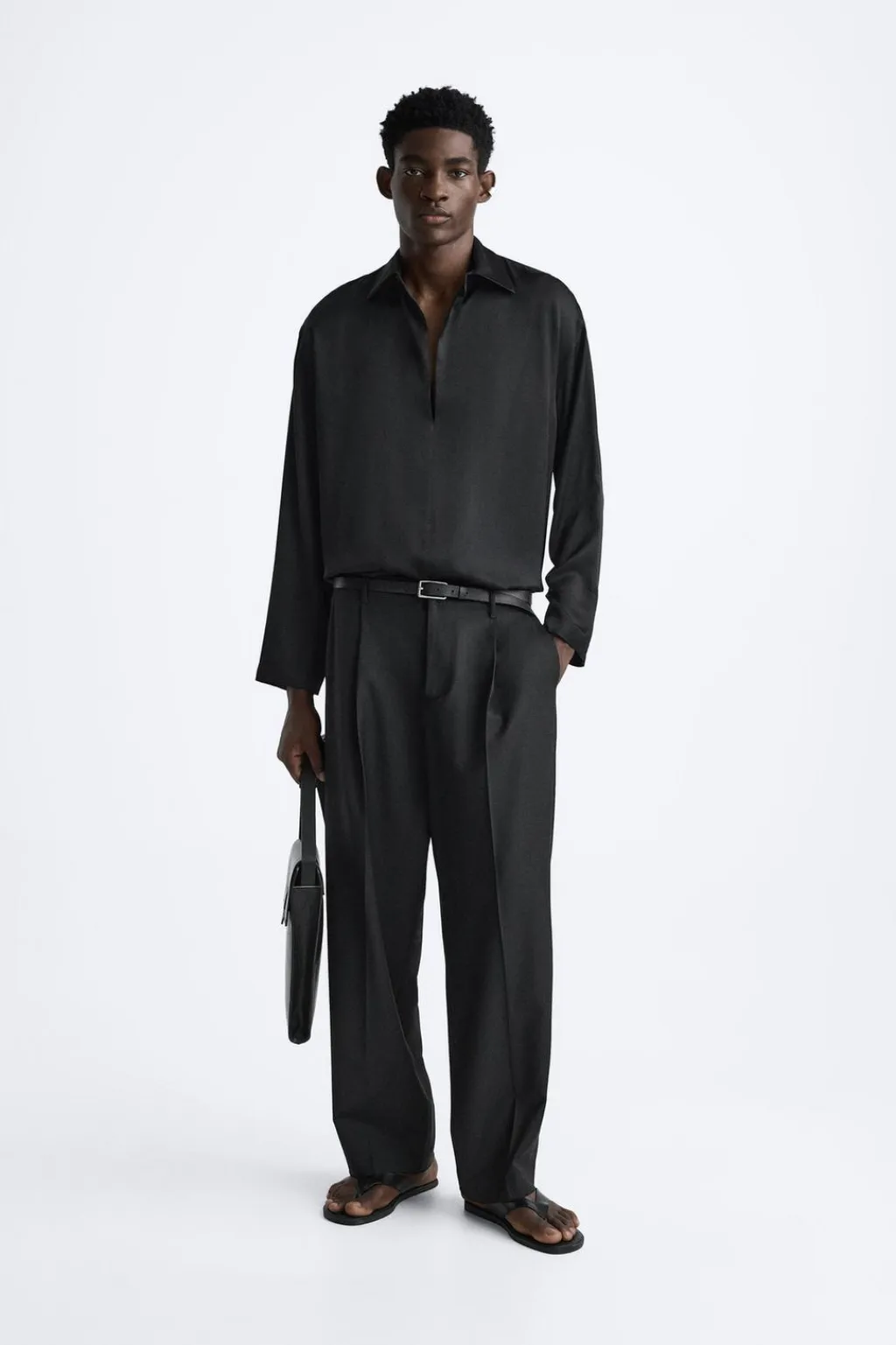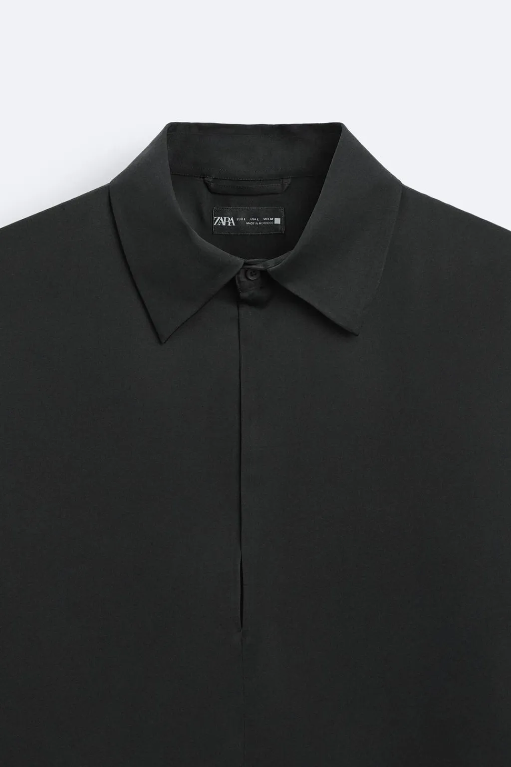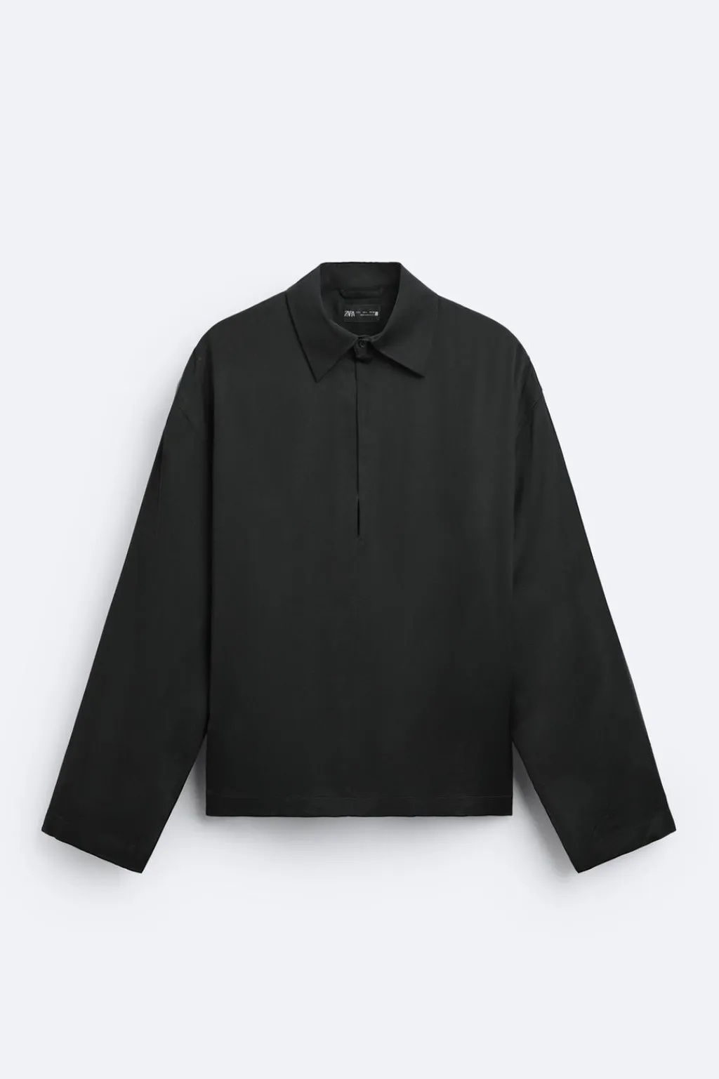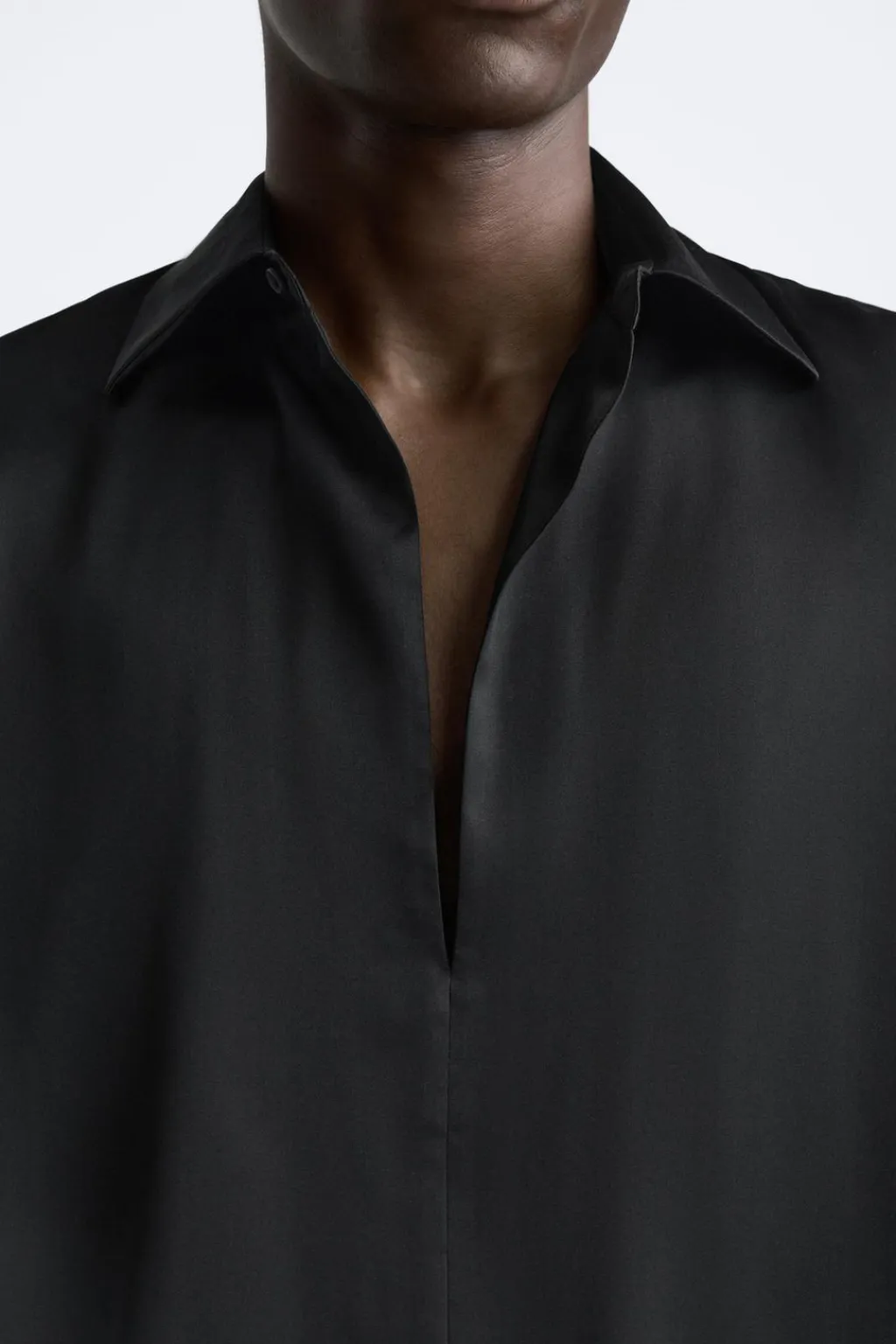 Camisa relaxed fit confeccionada en tejido de viscosa satinada. Cuello solapa con abertura frontal y cierre de botoón. Manga larga.