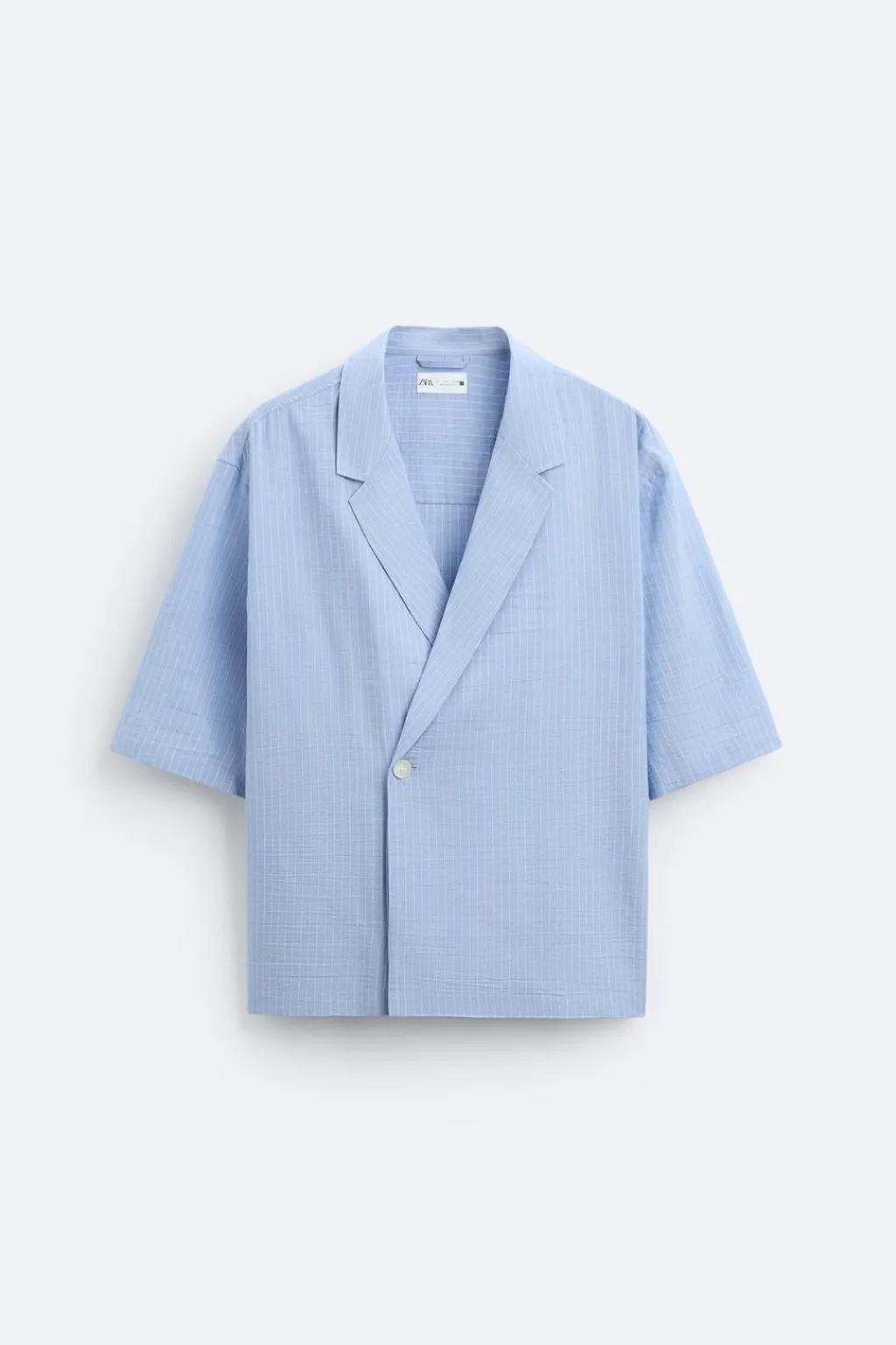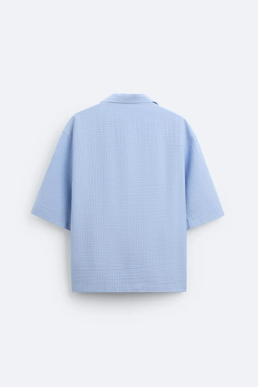 Camisa relaxed fit confeccionada en tejido con viscosa. Cuello son solapas de muesca y manga corta. Bajo con aberturas laterales. Cierre frontal de botonadura cruzada.