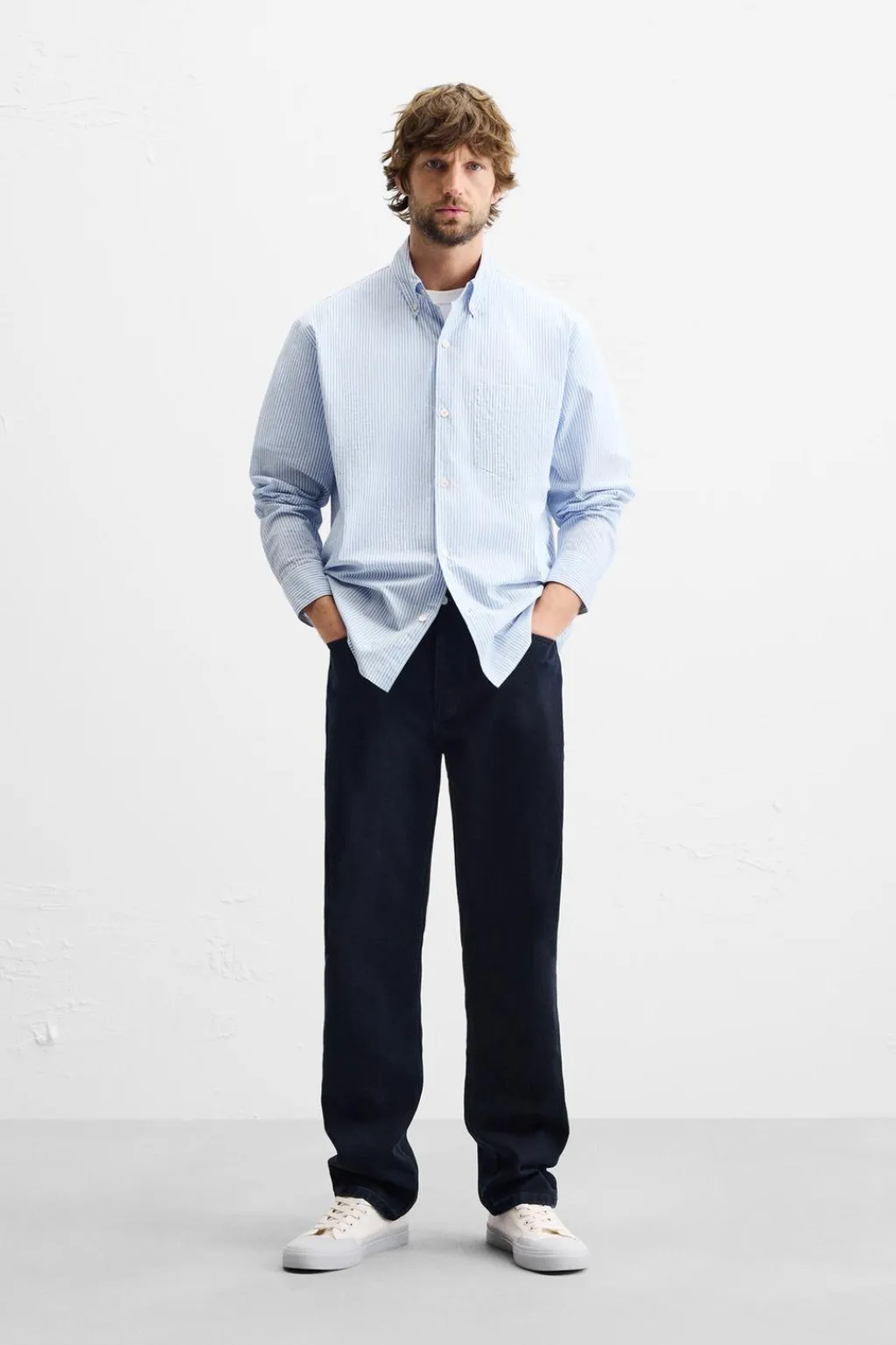 Camisa regular fit confeccionada en tejido con origen italiano de algodón acabado efecto arrugado. Cuello abotonado y manga larga acabada en puño con botón. Bolsillo plastrón en pecho. Cierre frontal de botonadura.