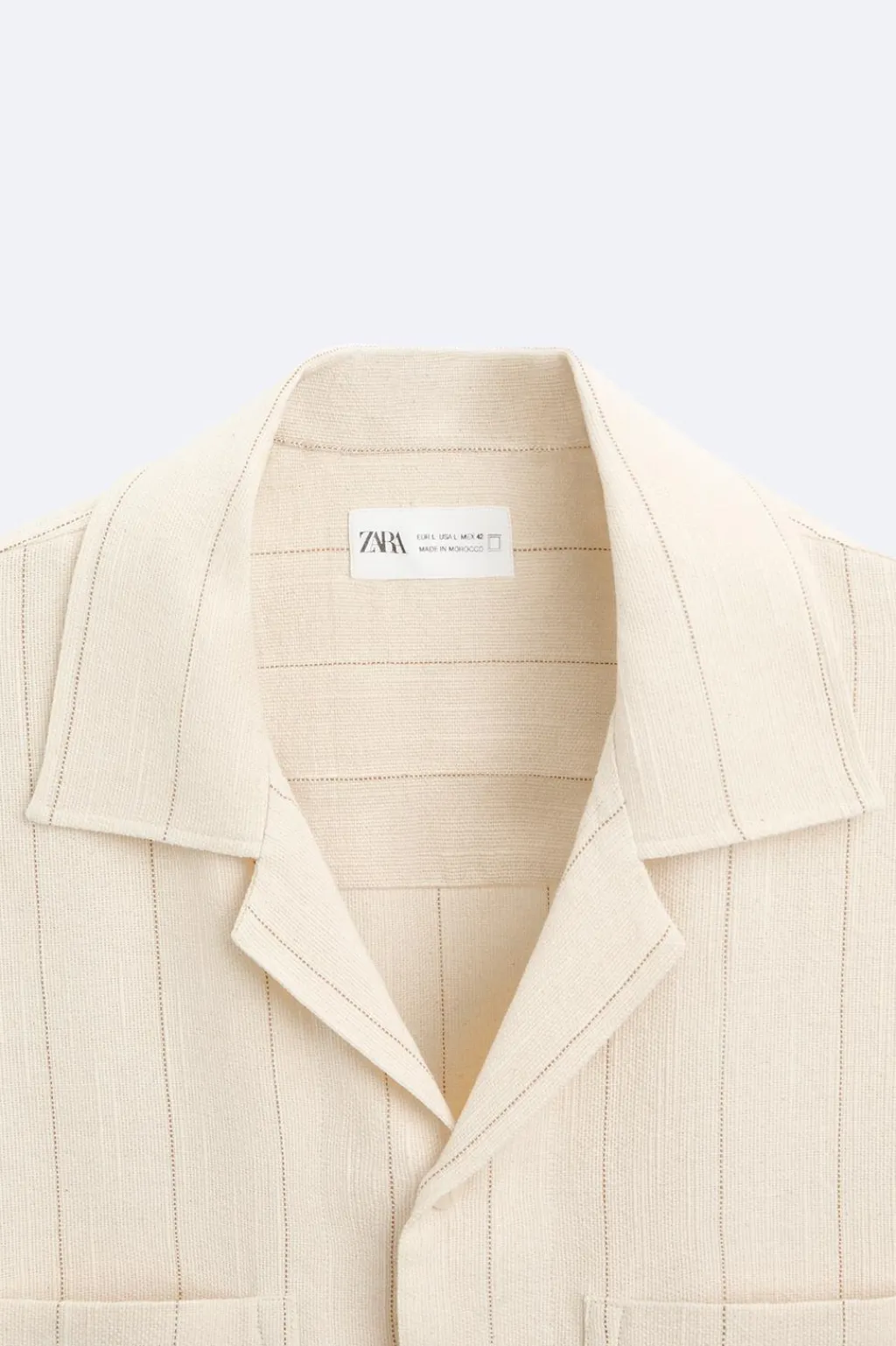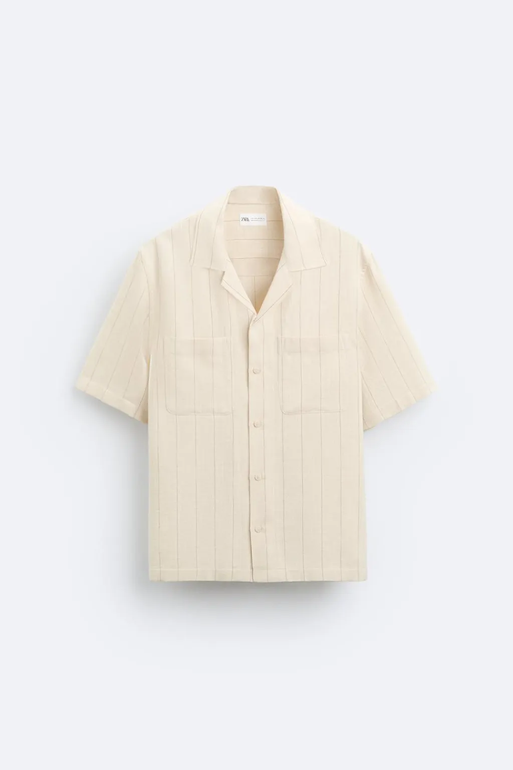Camisa relaxed fit confeccionada en tejido con mezcla de algodón. Cuello bowling y manga corta. Bolsillo plastrón en pecho. Bajo con aberturas laterales. Cierre frontal de botonadura.