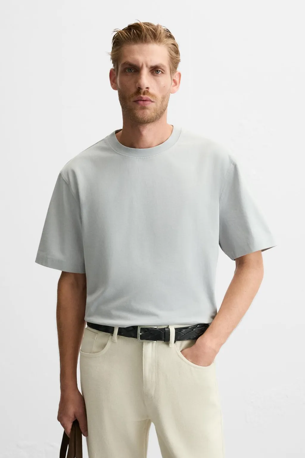 Camiseta relaxed fit confeccionada en tejido de algodón compacto. Cuello redondo y manga corta. Efecto lavado.