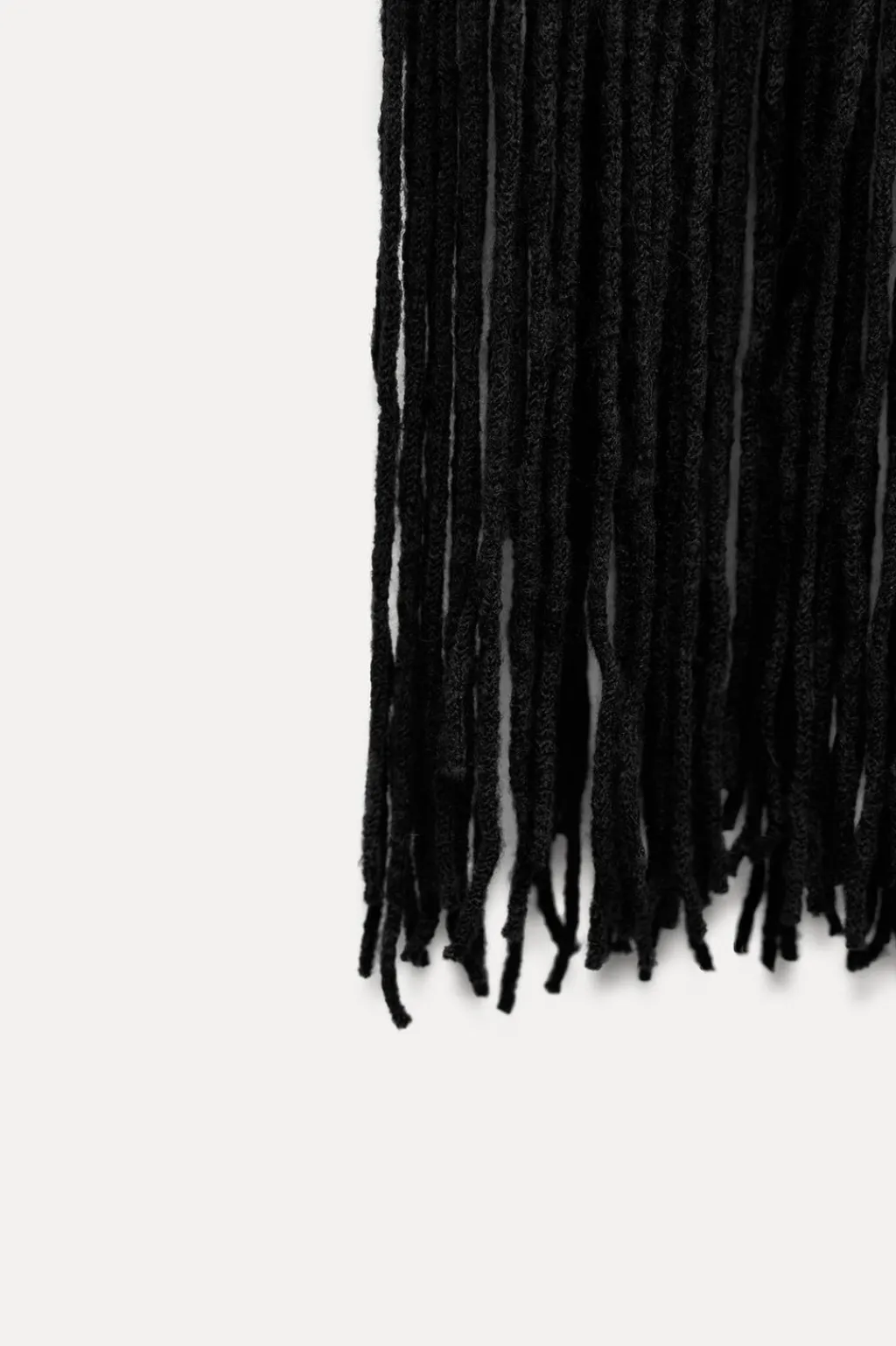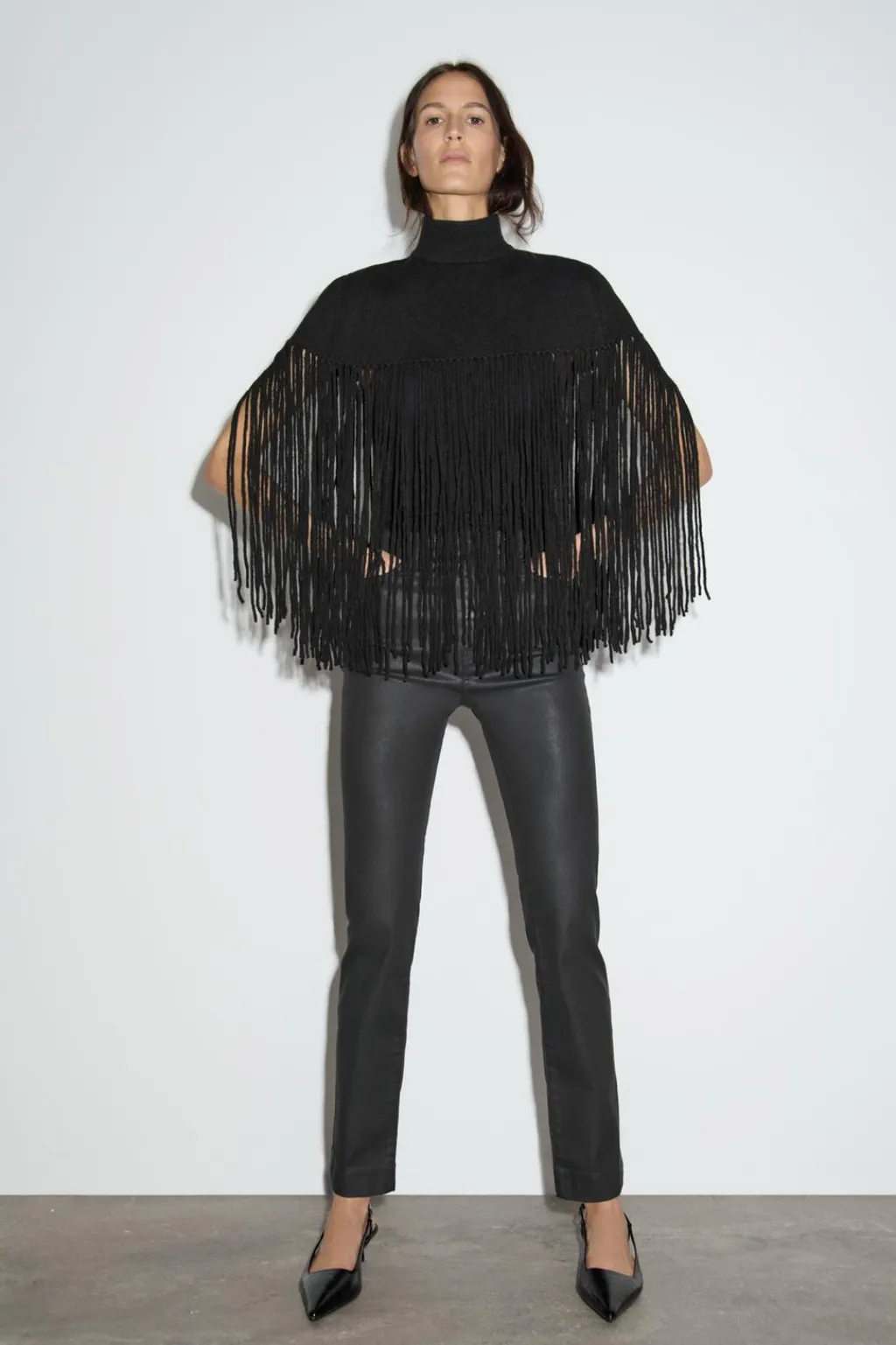 Capa corta confeccionada en mezcla de tejidos. Cuello alto. Detalle de flecos largos combinados a tono.
