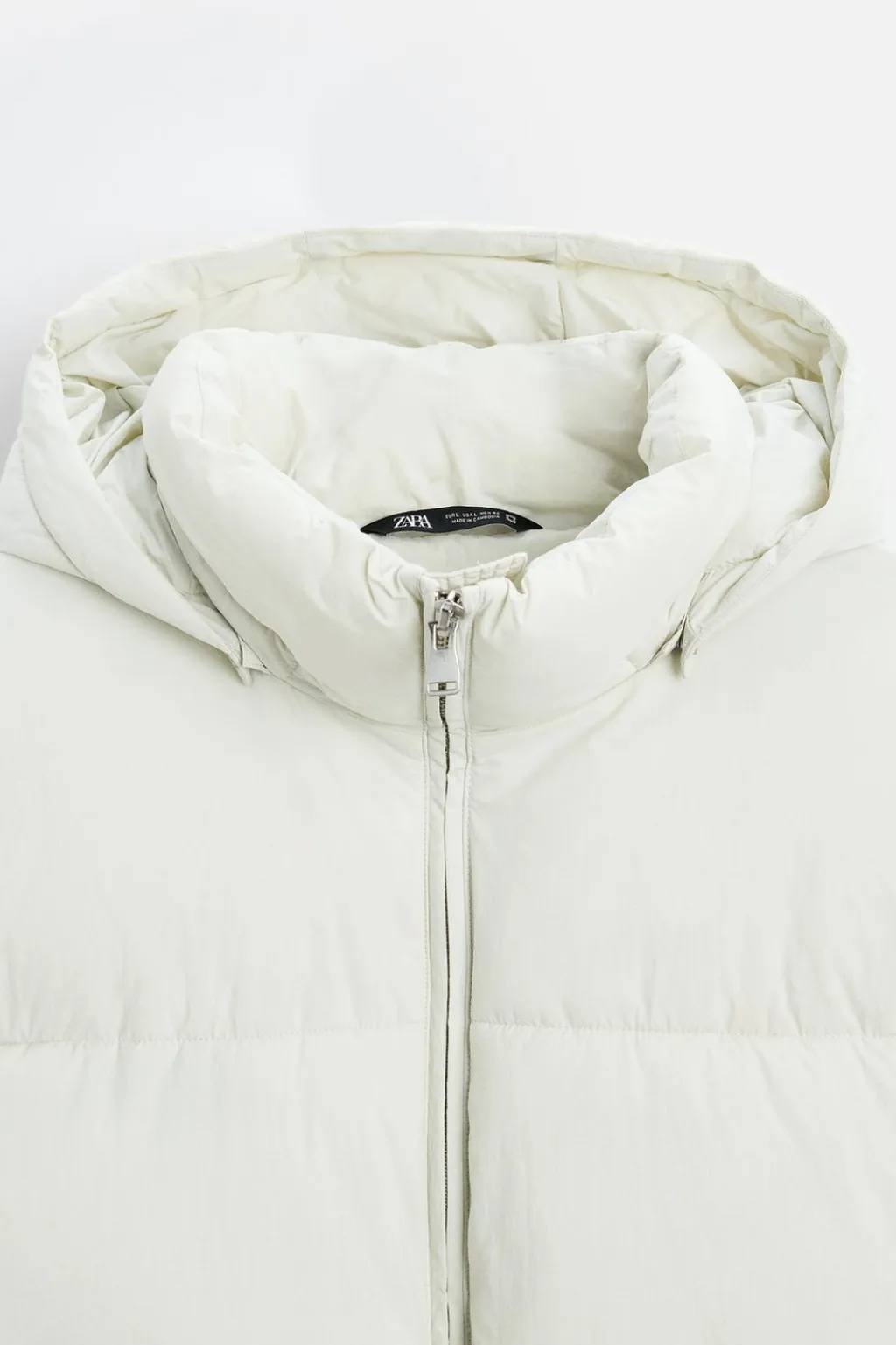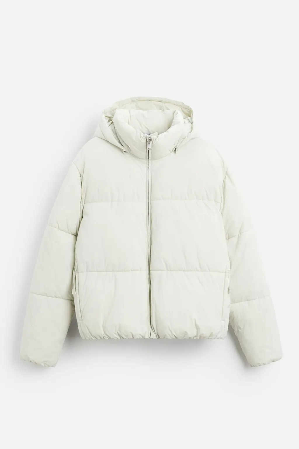 Cazadora acolchada confeccionada en tejido técnico con estructura ripstop, resistente a desgarros. Cuello subido con capucha desmontable mediante botones a presión. Manga larga. Bolsillos de vivo laterales y detalle de bolsillo interior. Acabados con elástico. Cierre frontal de cremallera.