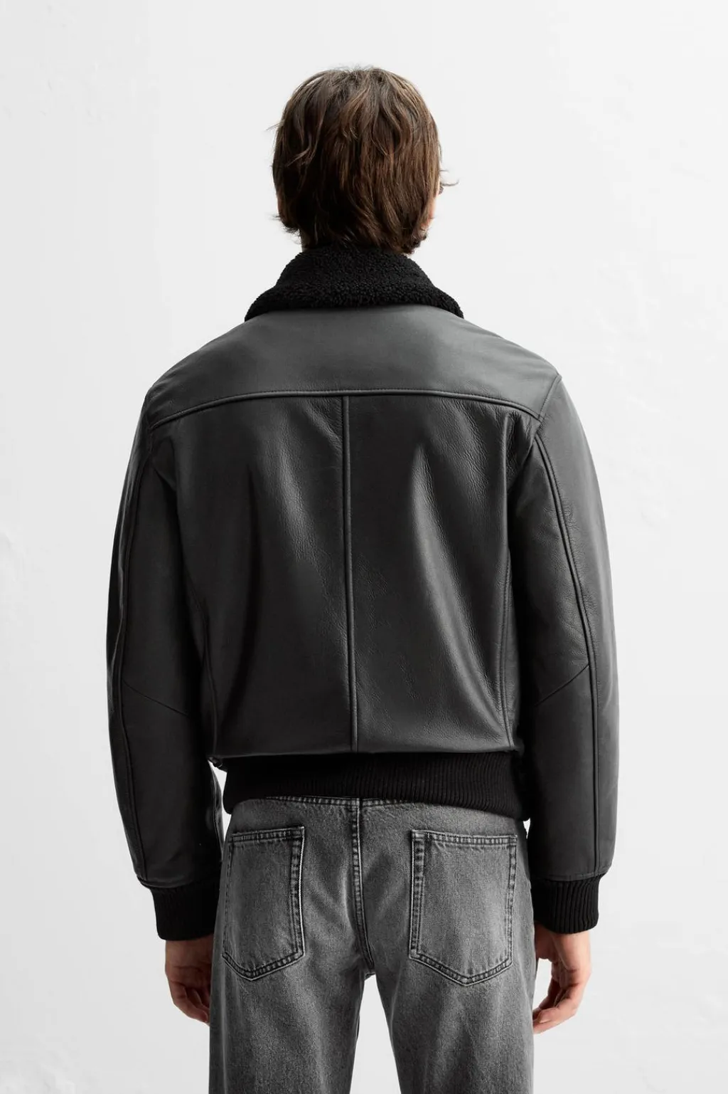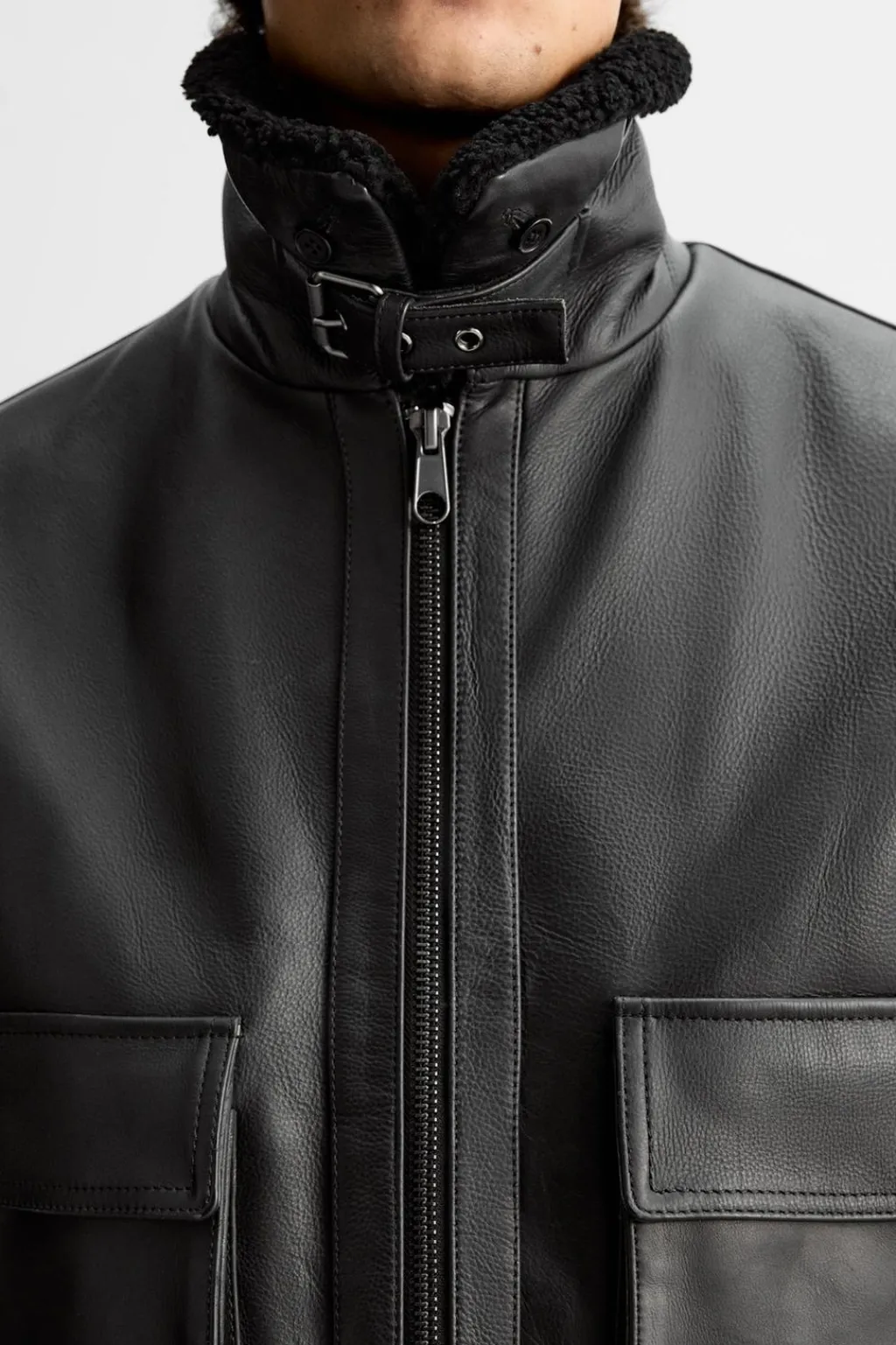 Cazadora relaxed fit confeccionada en piel. Cuello solapa con detalle de cuello efecto pelo desmontable. Manga larga. Bolsillos plastrón con solapa en cadera. Detalle de bolsillo en interior. Acabados en rib. Cierre frontal con cremallera oculta por solapa con botones a presión.