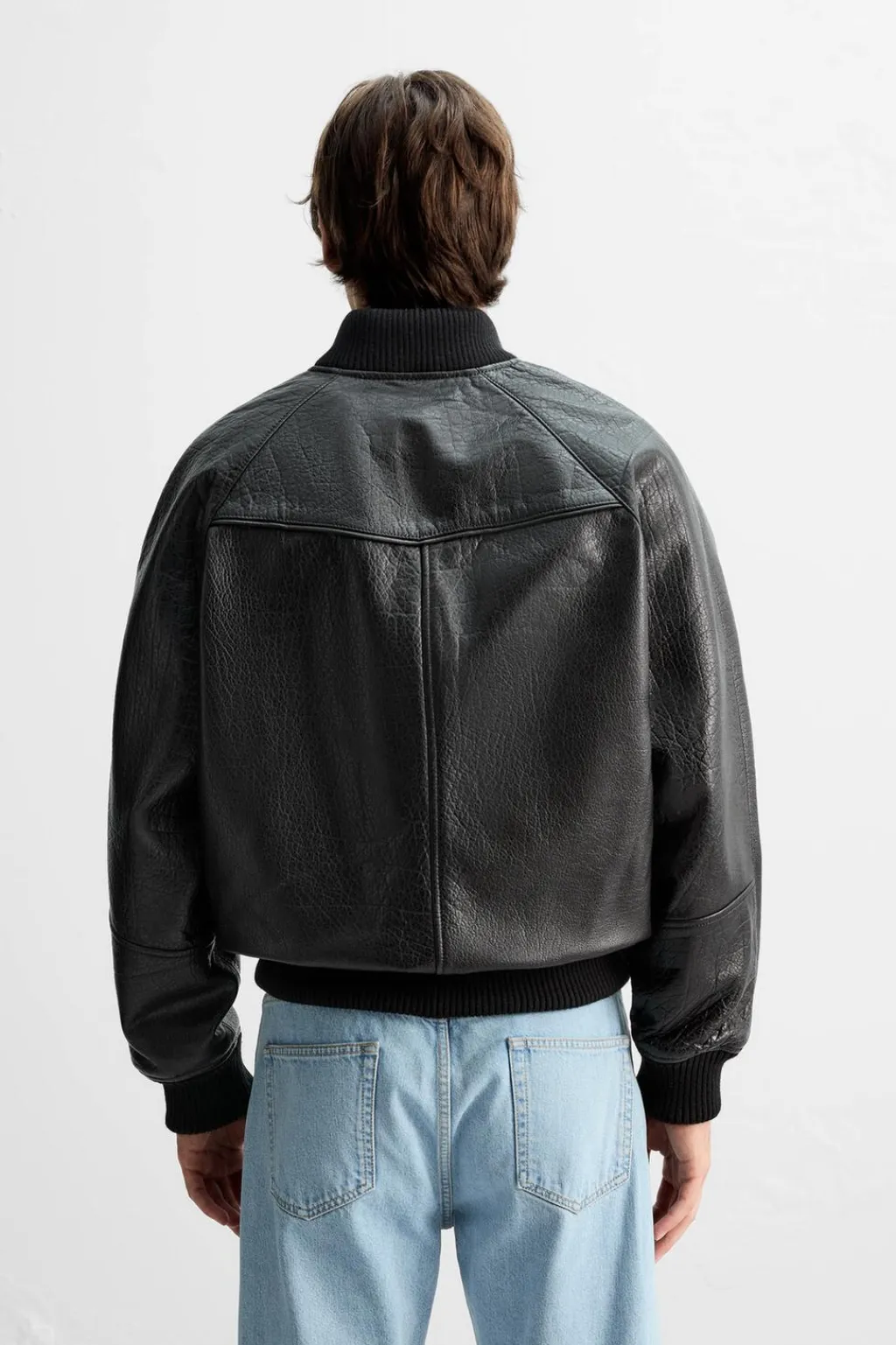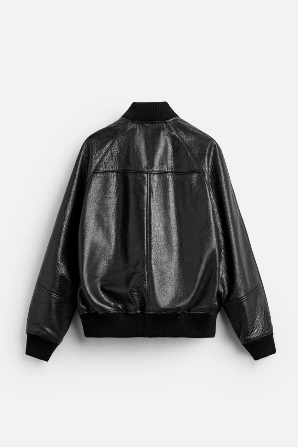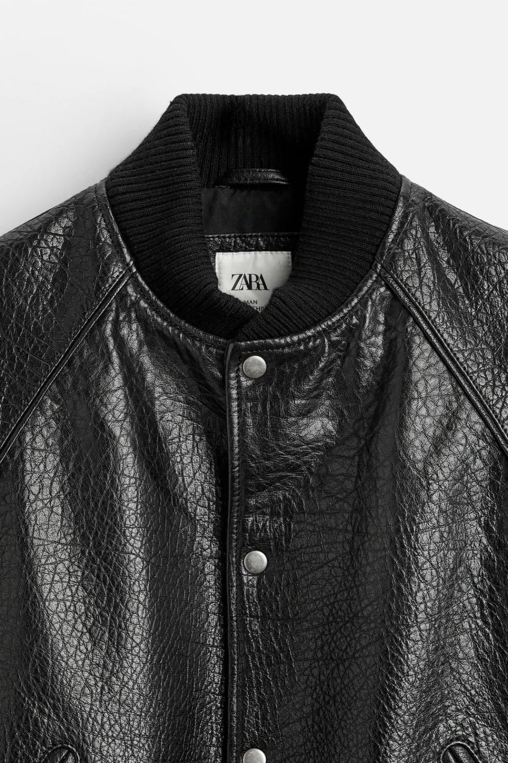Cazadora varsity confeccionada en piel con textura. Cuello acabado con elástico y manga larga. Bolsillos de doble vivo en cadera y detalle de bolsillo interior. Acabados en rib. Cierre frontal con botones a presión.
