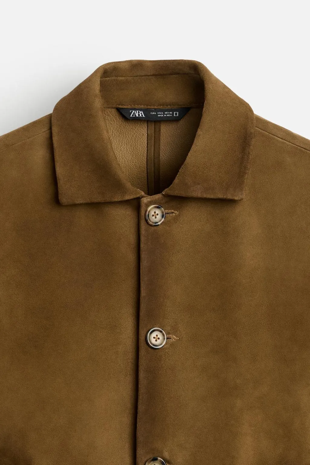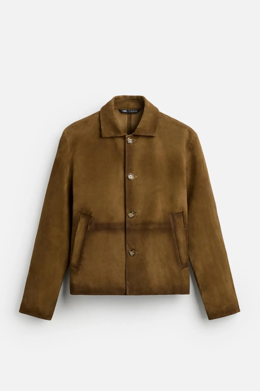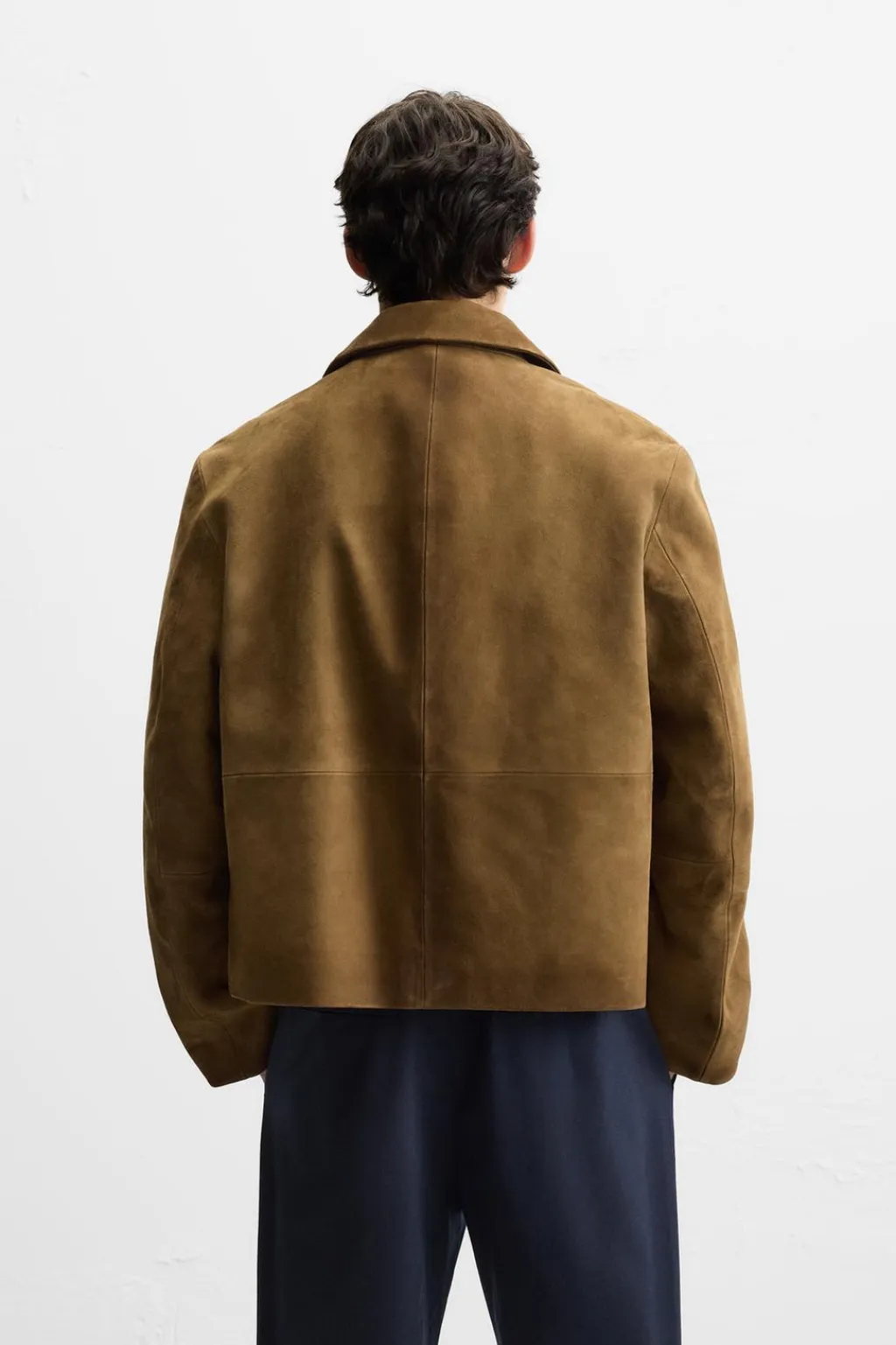 Cazadora cropped fit confeccionada en piel con acabado ante. Cuello solapa y manga larga. Bolsillos de vivo en cadera y detalle de bolsillo interior. Costuras con efecto envejecido. Cierre frontal con botones.