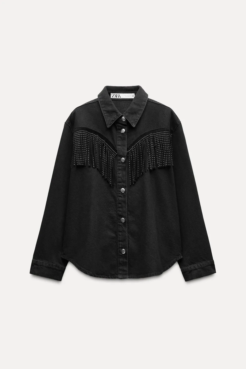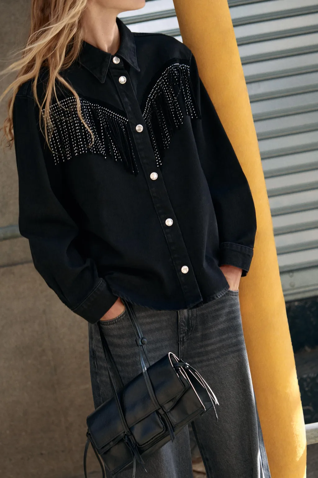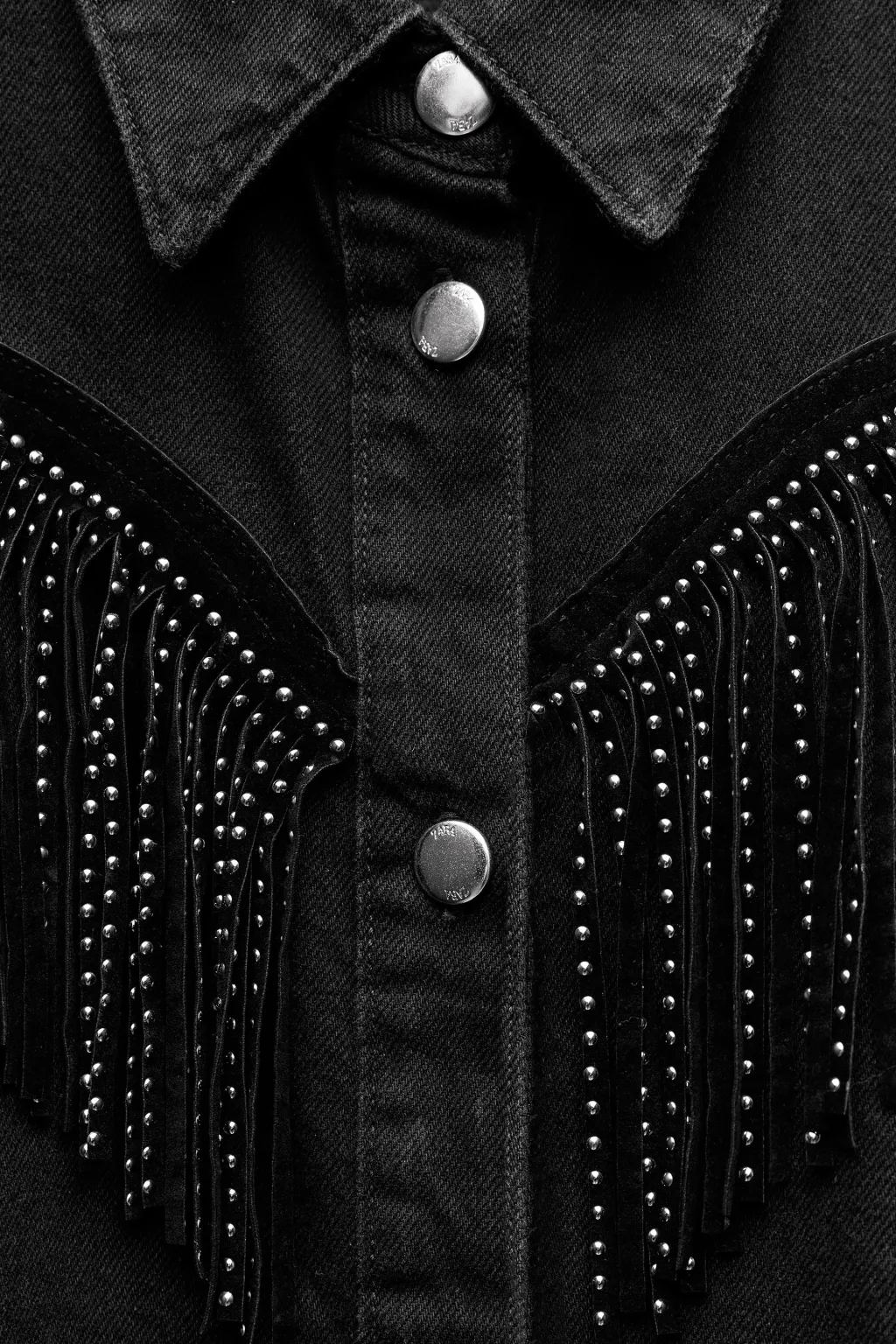 Cazadora de cuello solapa y manga larga. Detalle frontal de flecos con tachas. Cierre delantero con botones a presión.