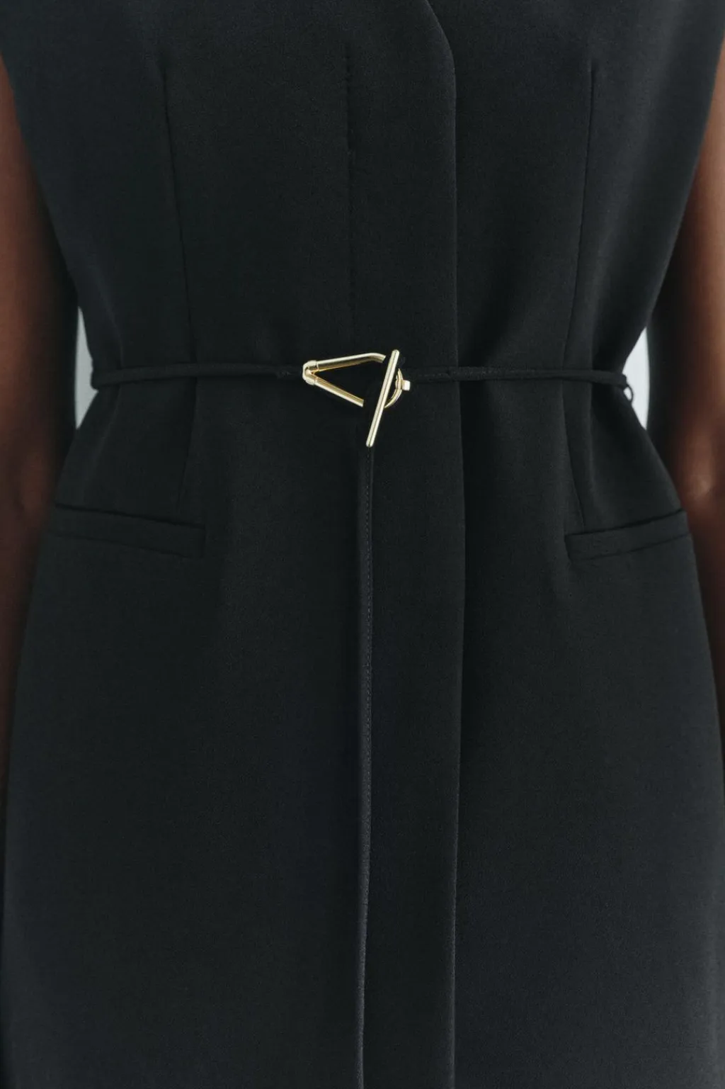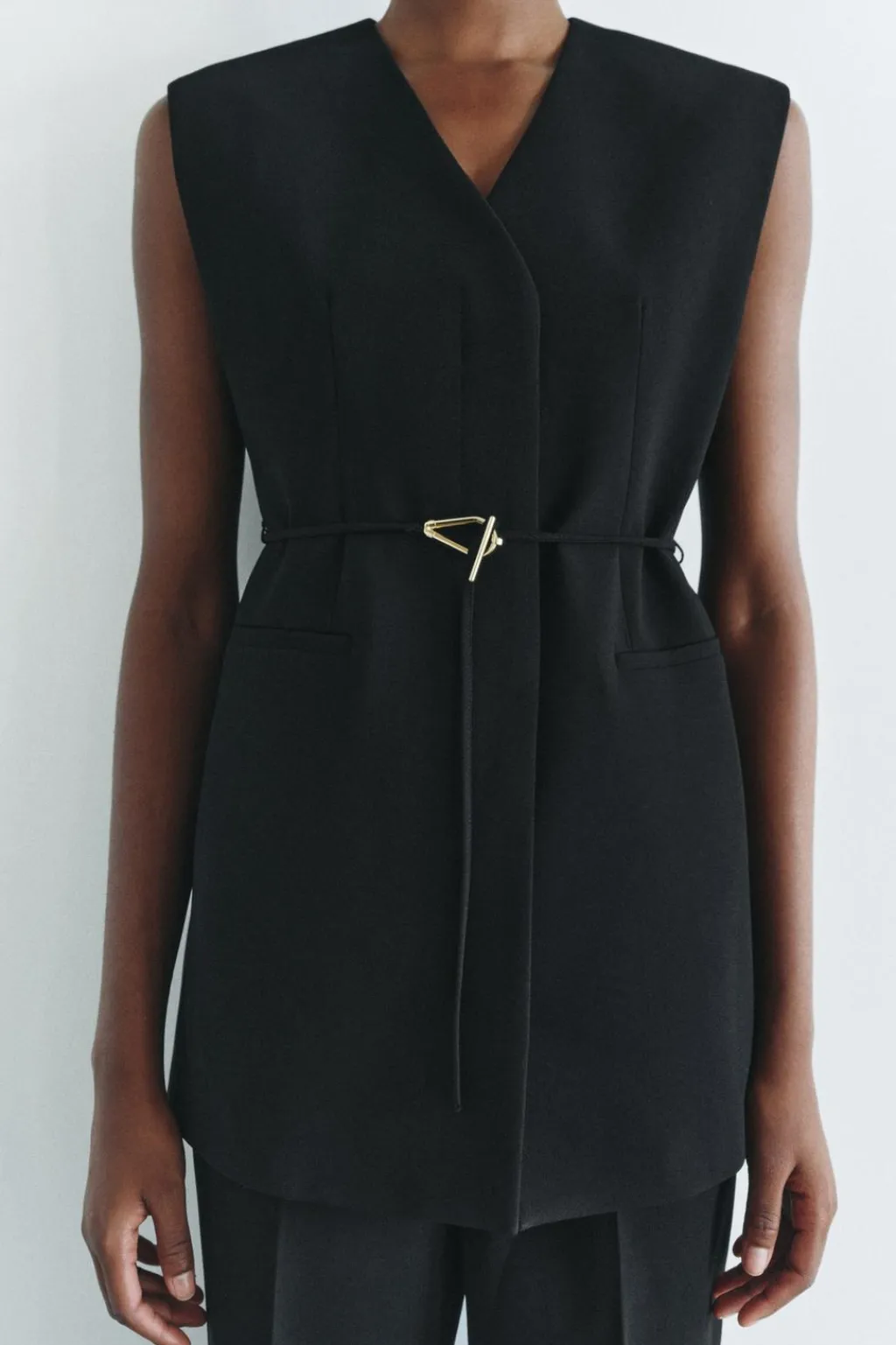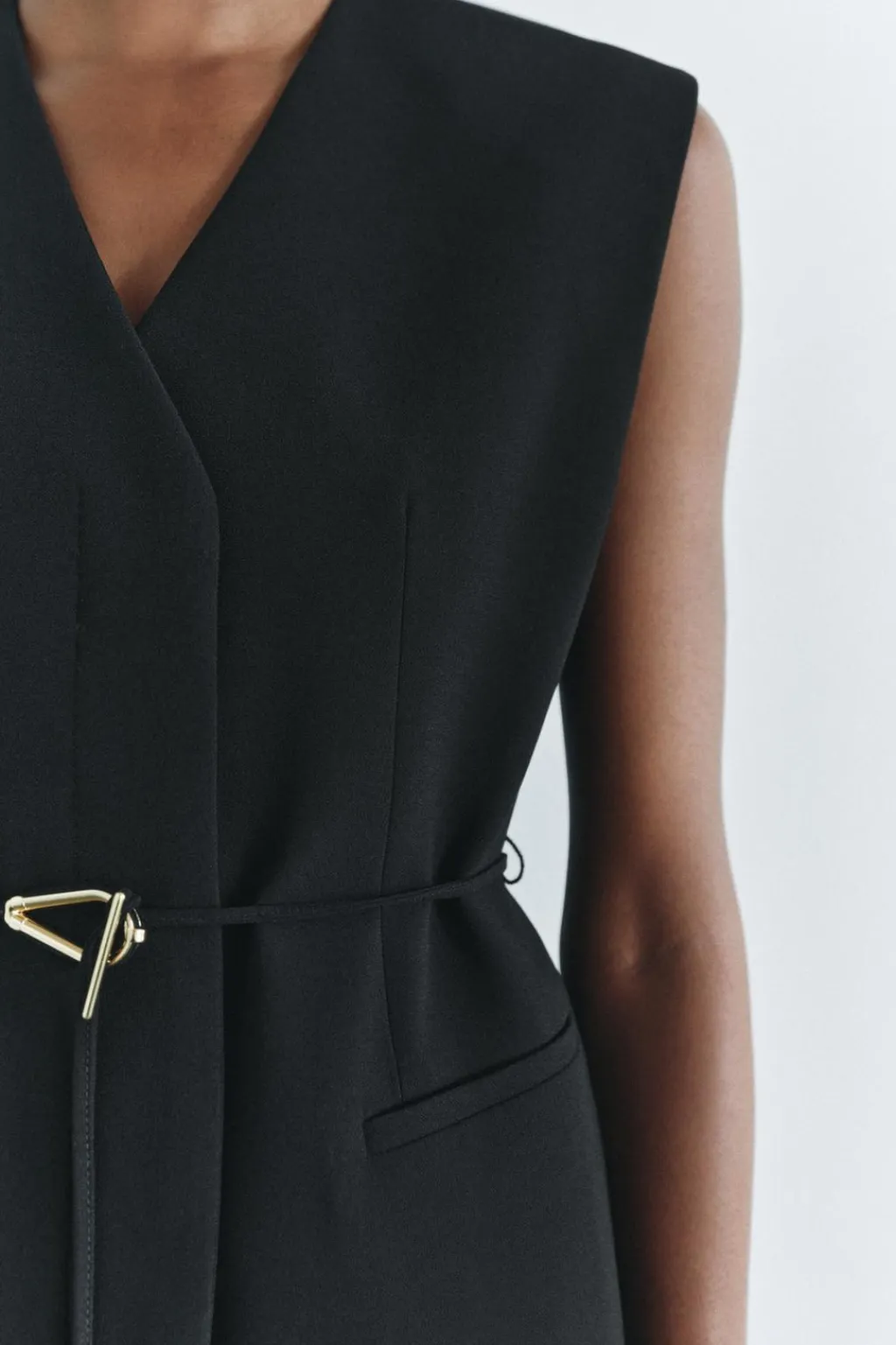 Chaleco de escote pico y manga sisa. Falsos bolsillos de vivo en delantero. Cinturón en mismo tejido ajustable con hebilla metálica. Bajo acabado en aberturas laterales. Forro interior. Cierre frontal con botones ocultos.