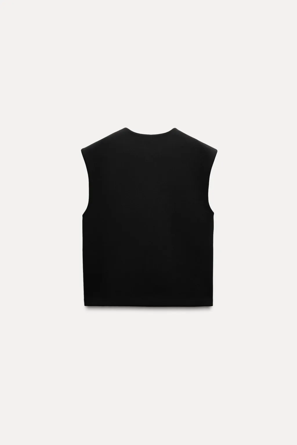 Chaleco amplio de escote pico y manga sisa. Bajo asimétrico. Cierre frontal con botones a tono.