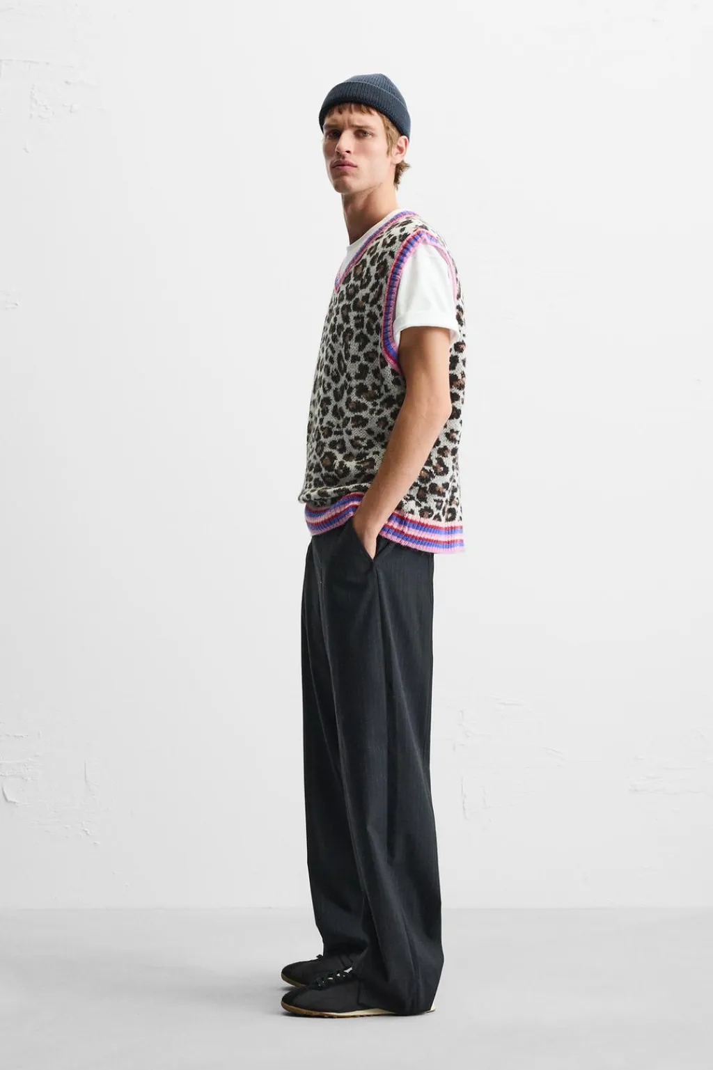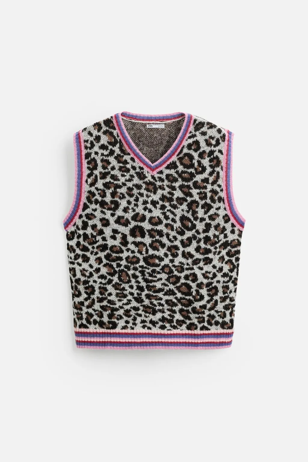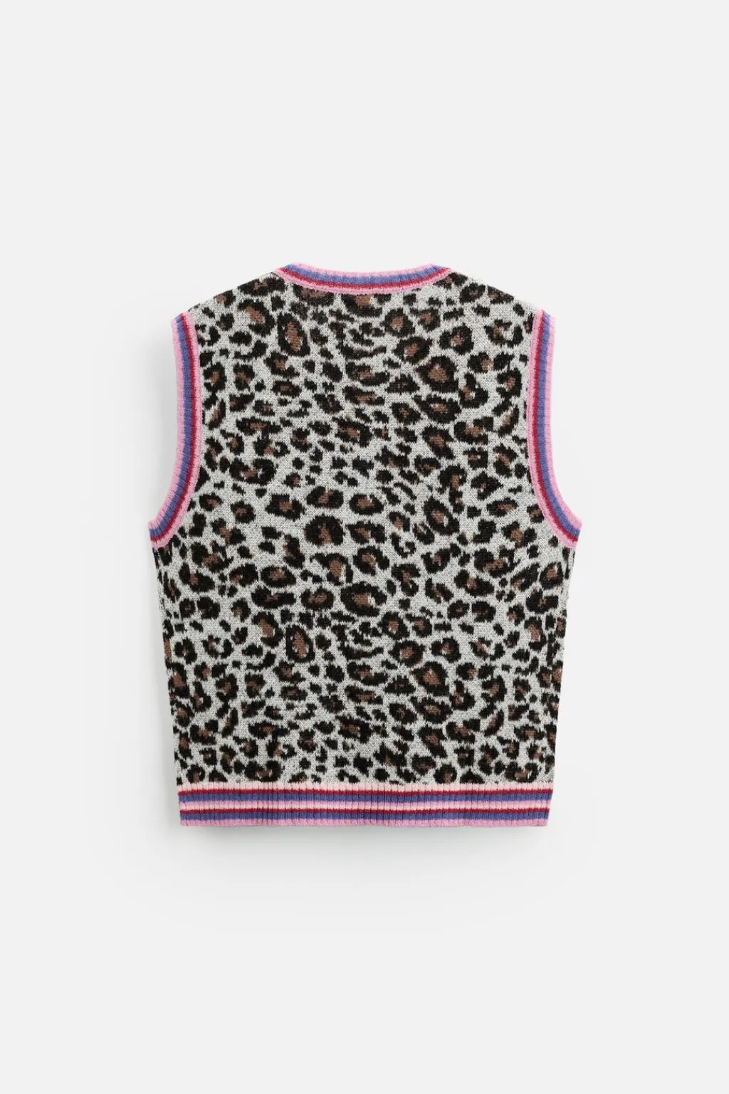Chaleco de punto relaxed fit. Cuello pico y manga sisa. Acabados en rib combinados a contraste.