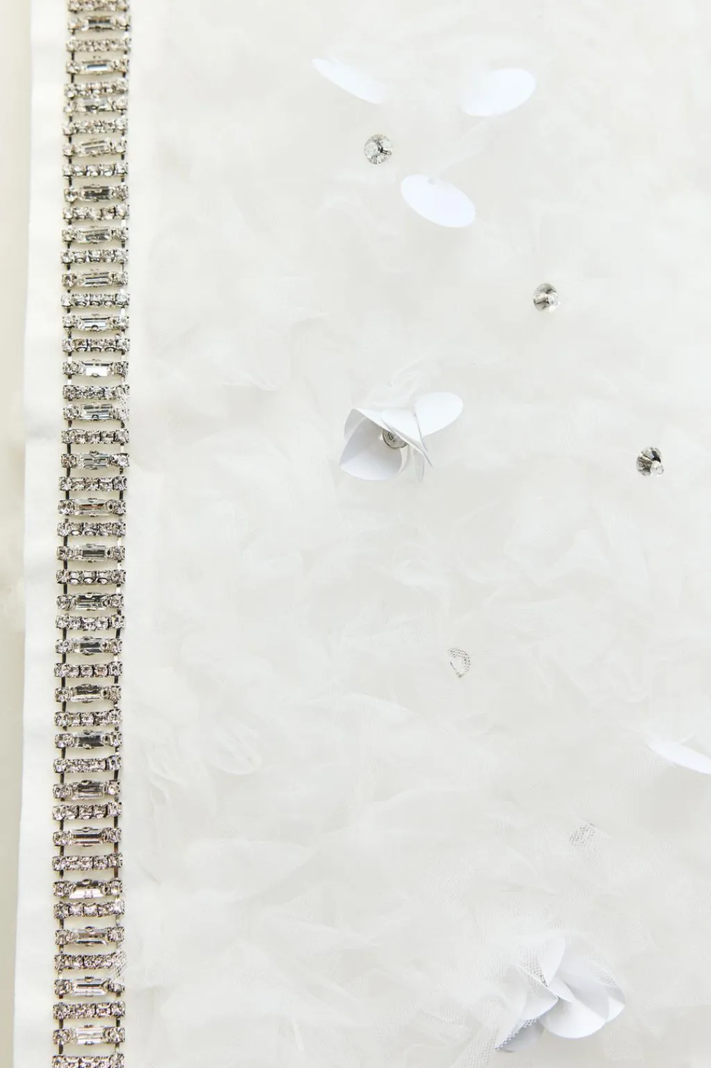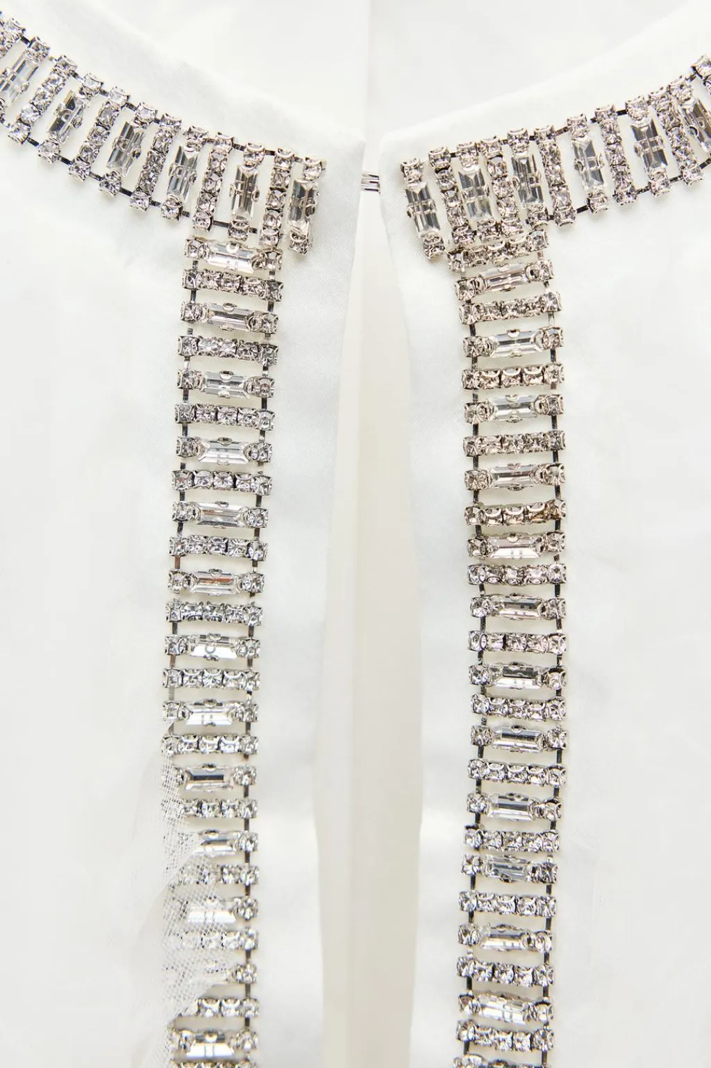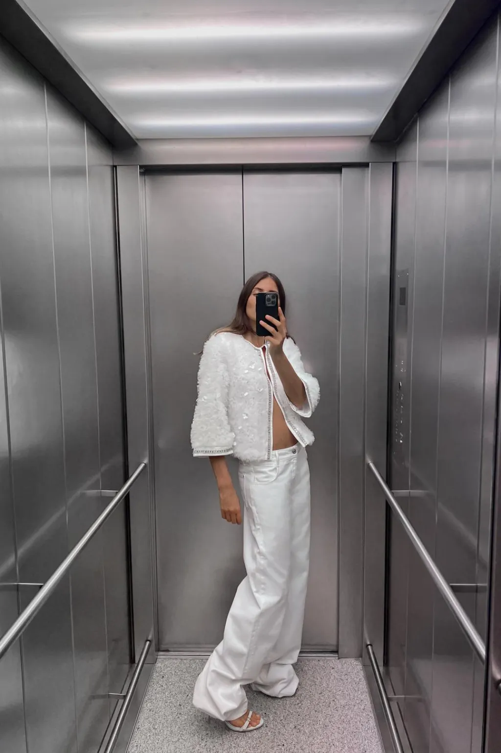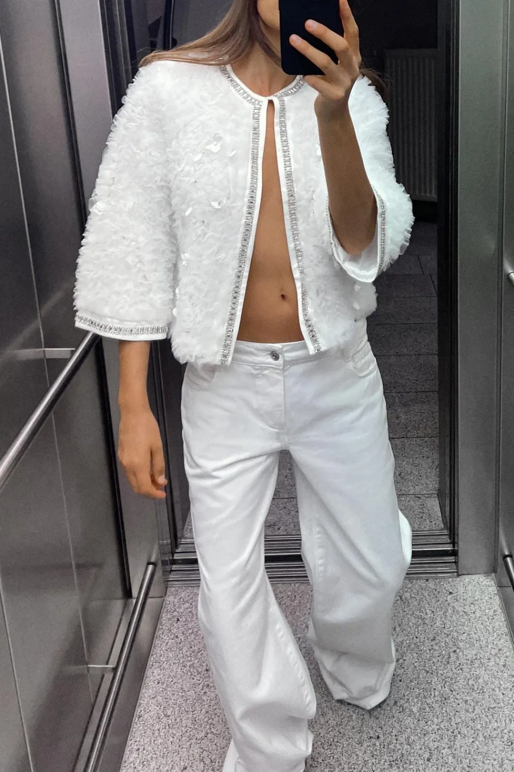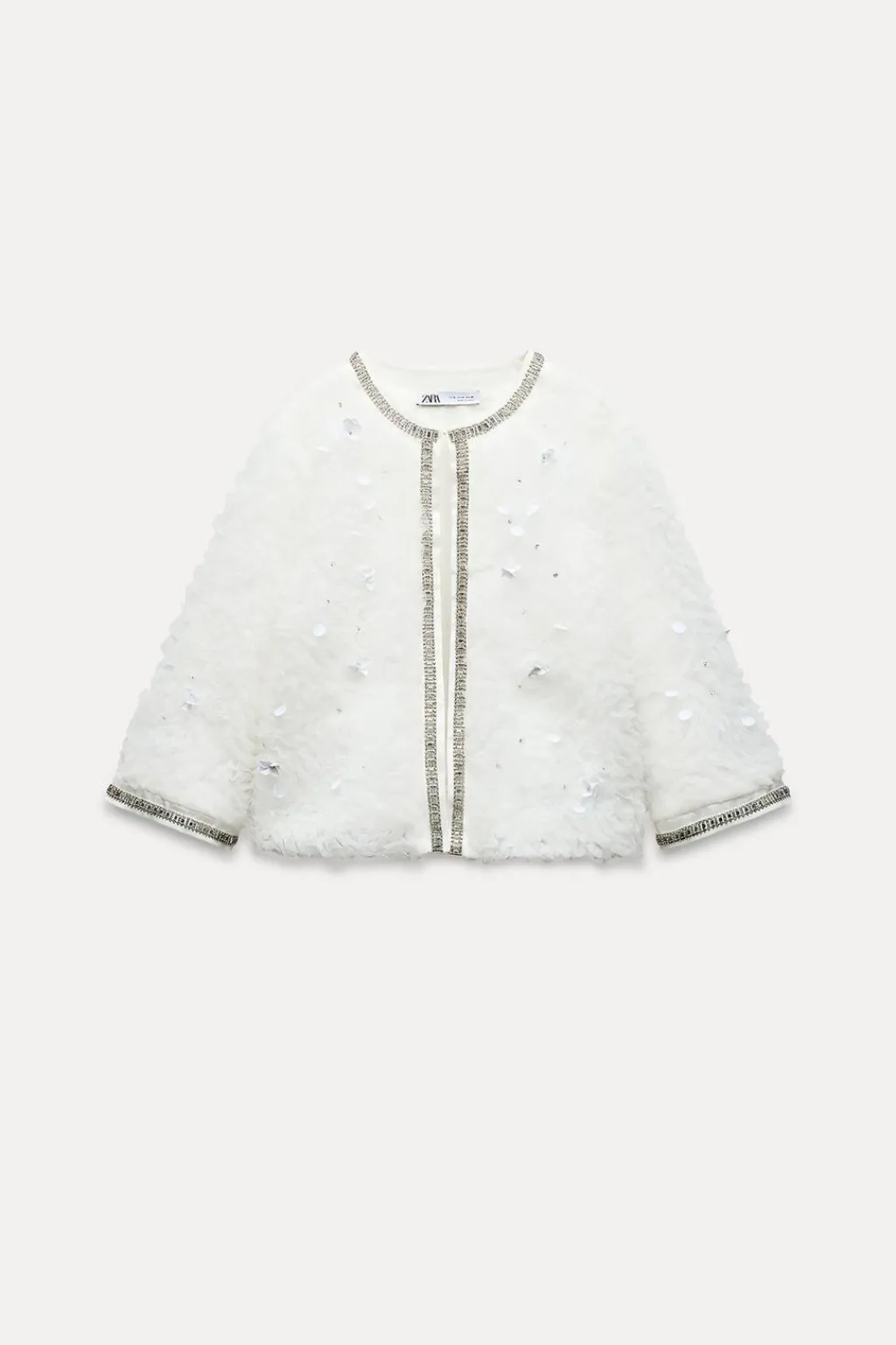 Chaqueta de cuello redondo y manga ancha por debajo del codo. Detalle de tejido en estructura y aplicación de abalorios joya. Cierre frontal con corchete oculto.