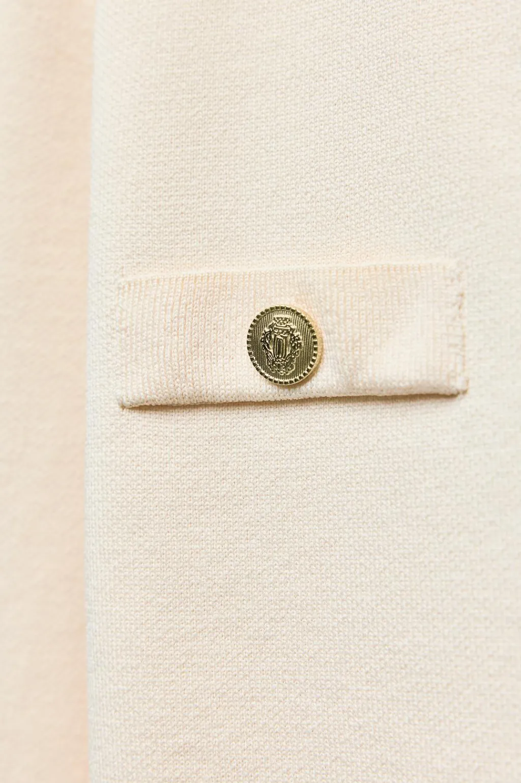 Chaqueta de cuello redondo y manga larga. Detalle de falsos bolsillos de vivo delanteros. Cierre frontal con botones dorados con relieve.