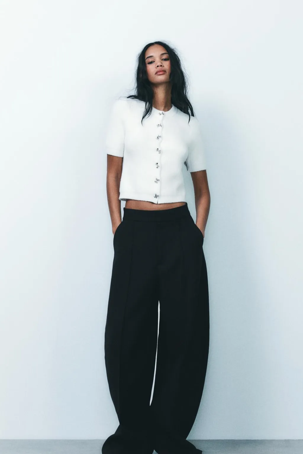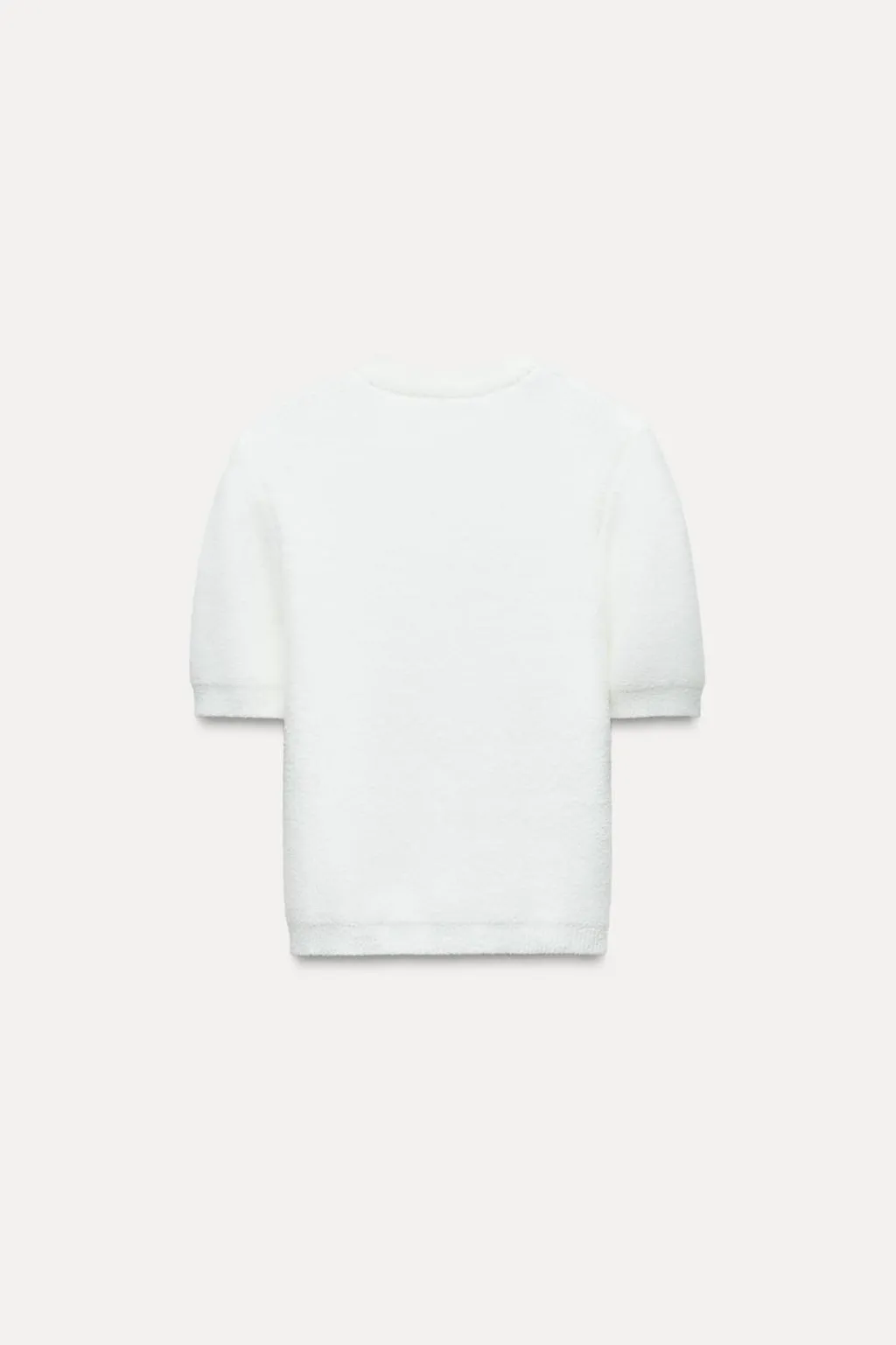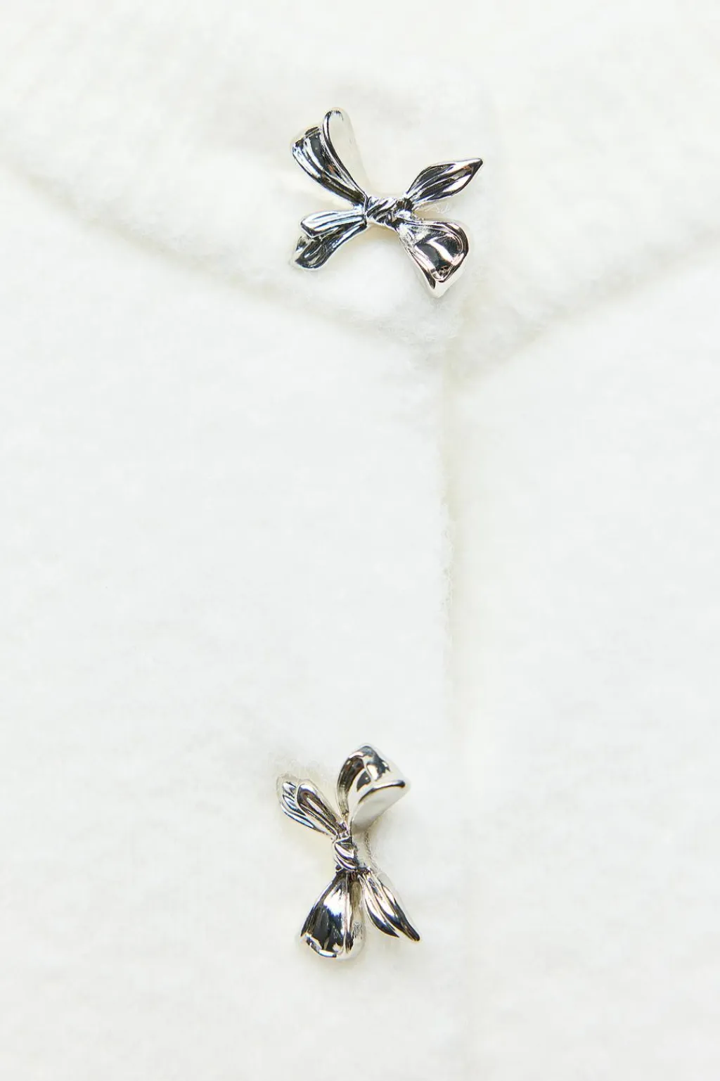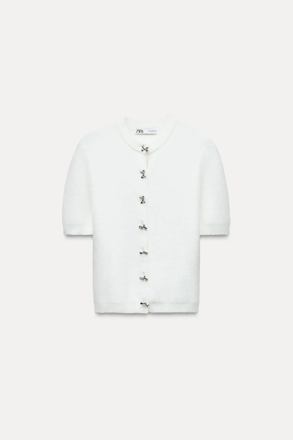 Chaqueta de cuello redondo y manga corta. Cierre frontal con botones metálicos con forma de lazos.