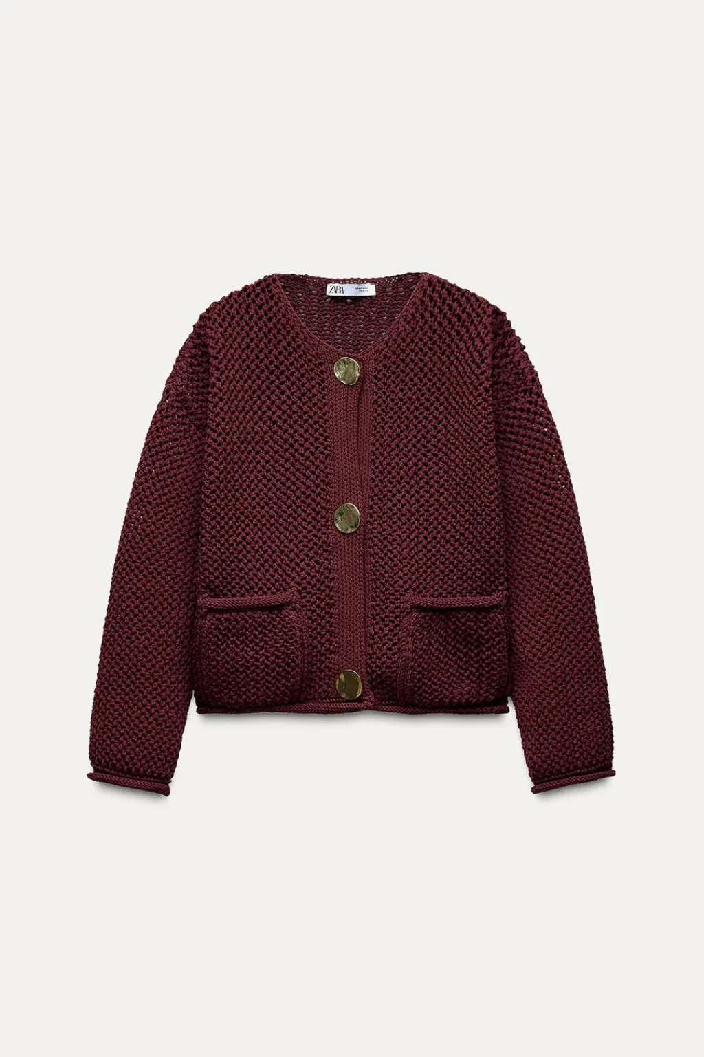 Chaqueta de cuello redondo y manga larga. Bolsillos delanteros de plastrón. Cierre frontal con botones dorados.