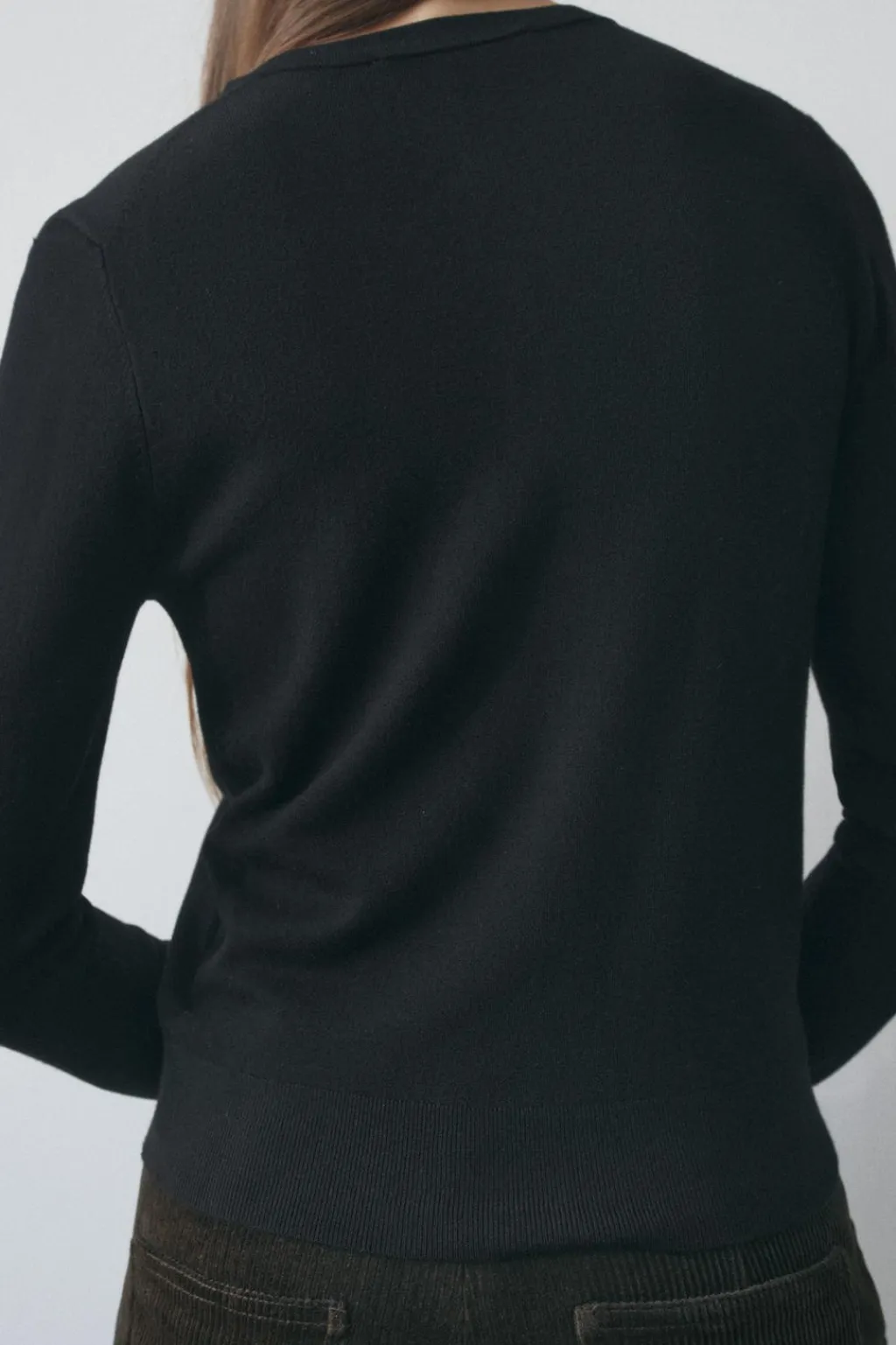 Chaqueta de cuello redondo y manga larga. Cierre frontal con botones dorados.