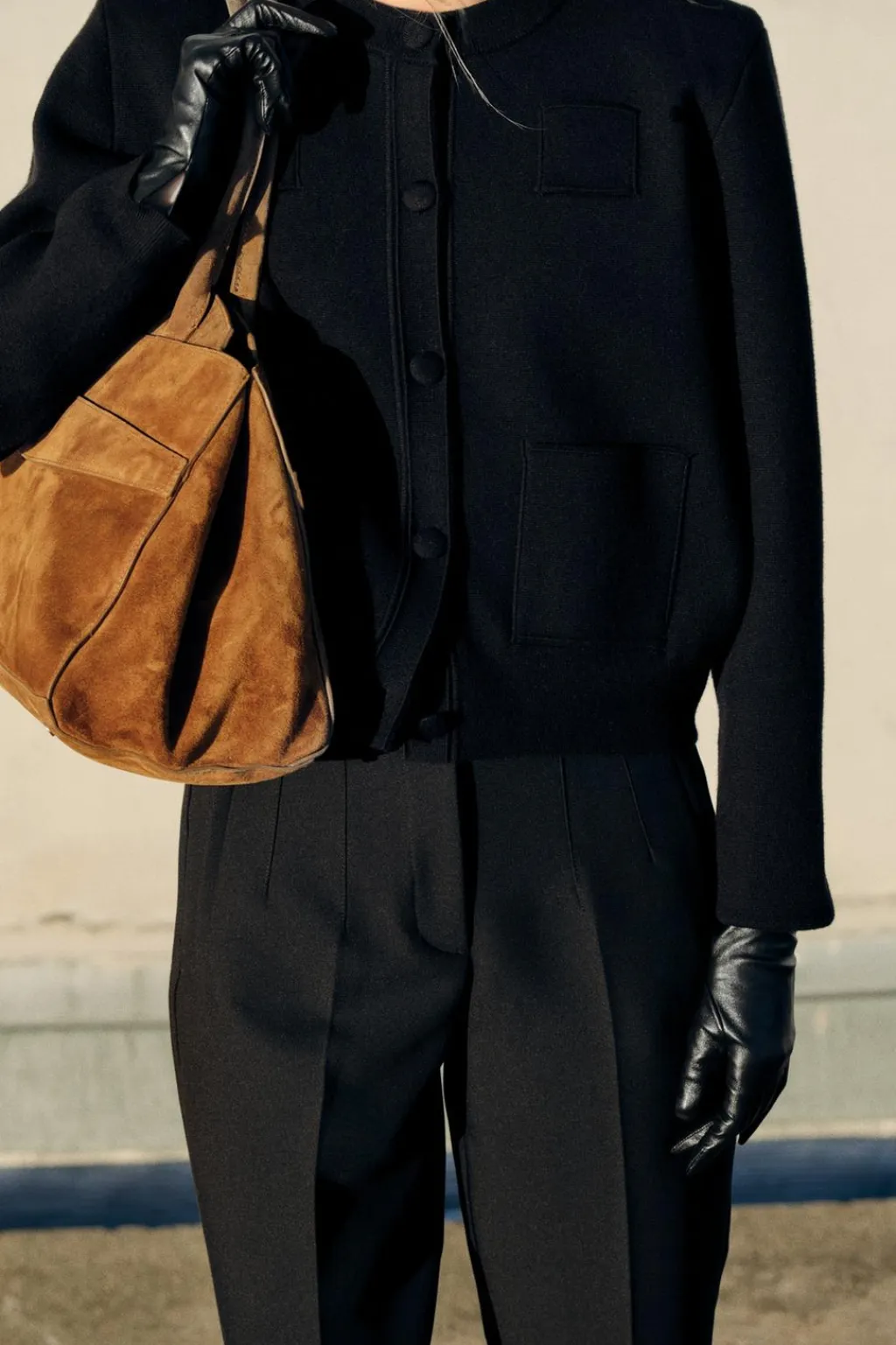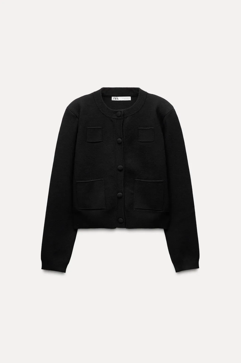 Chaqueta estilo bomber de cuello redondo y manga larga con hombreras. Bolsillos delanteros de plastrón. Cierre frontal con botones forrados a tono.