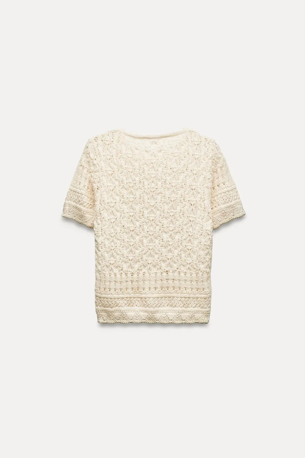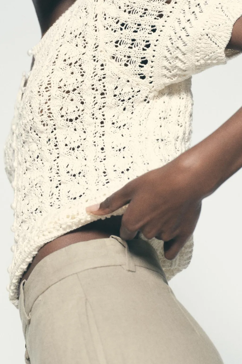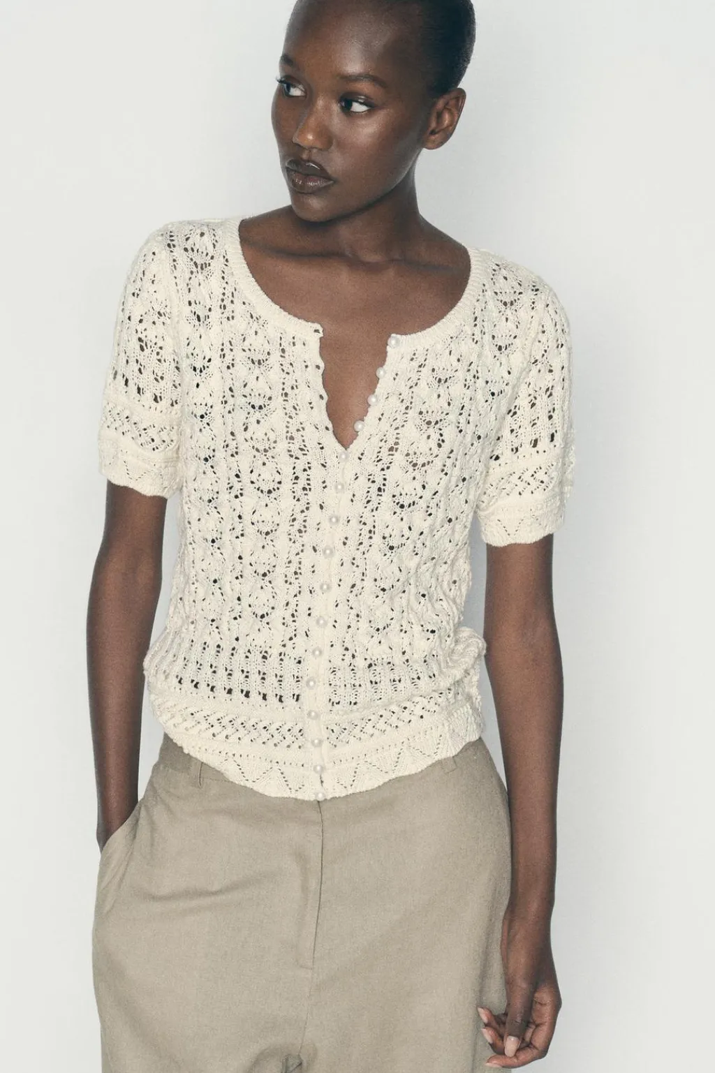 Chaqueta de cuello redondo y manga corta. Tejido en punto con aberturas. Cierre frontal con botones perla.
