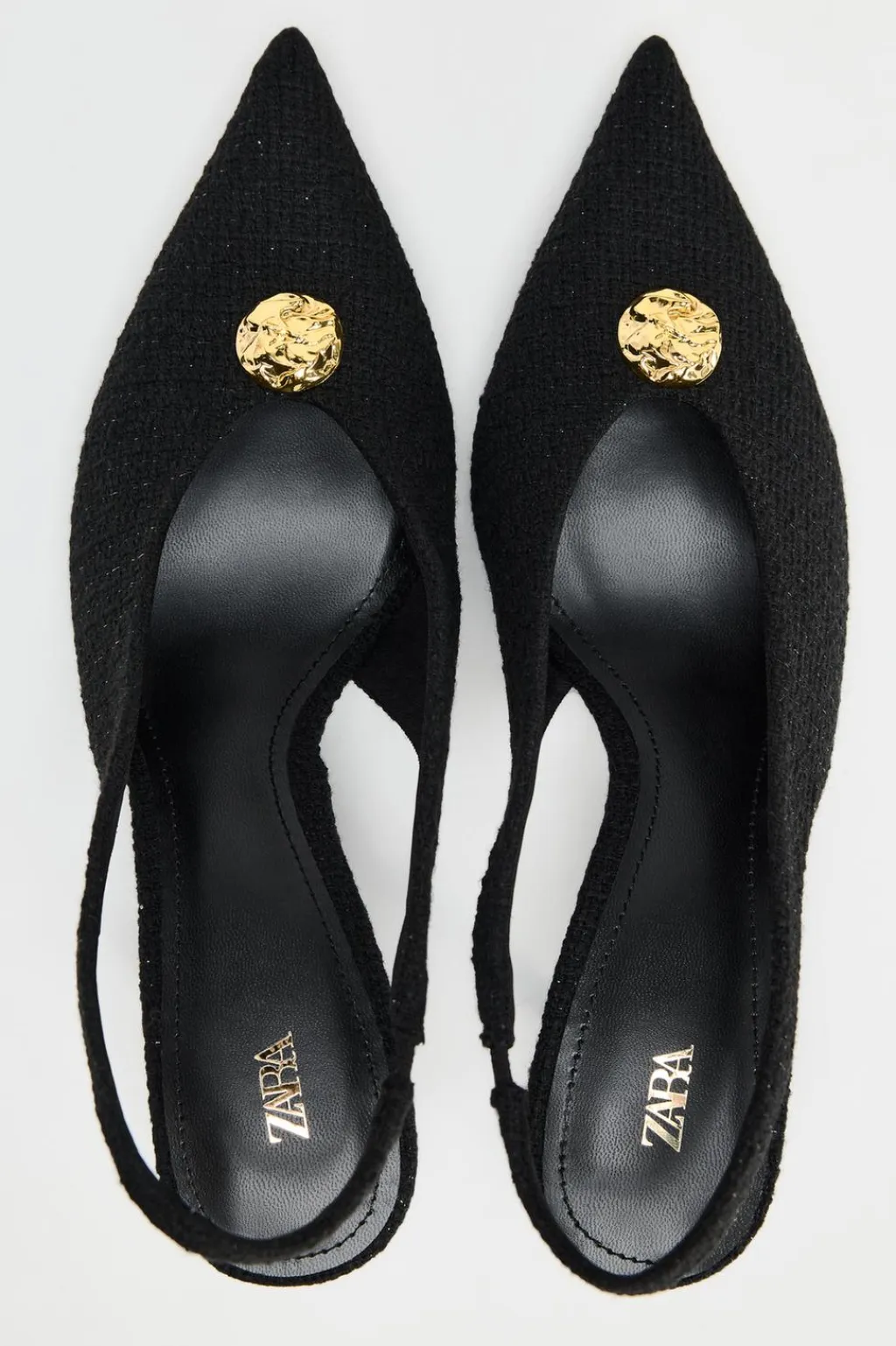 Zapato tipo destalonado en tejido. Detalle de aplique metálico en la parte delantera. Tira trasera con pieza elástica. Acabado en punta con tacón kitten.