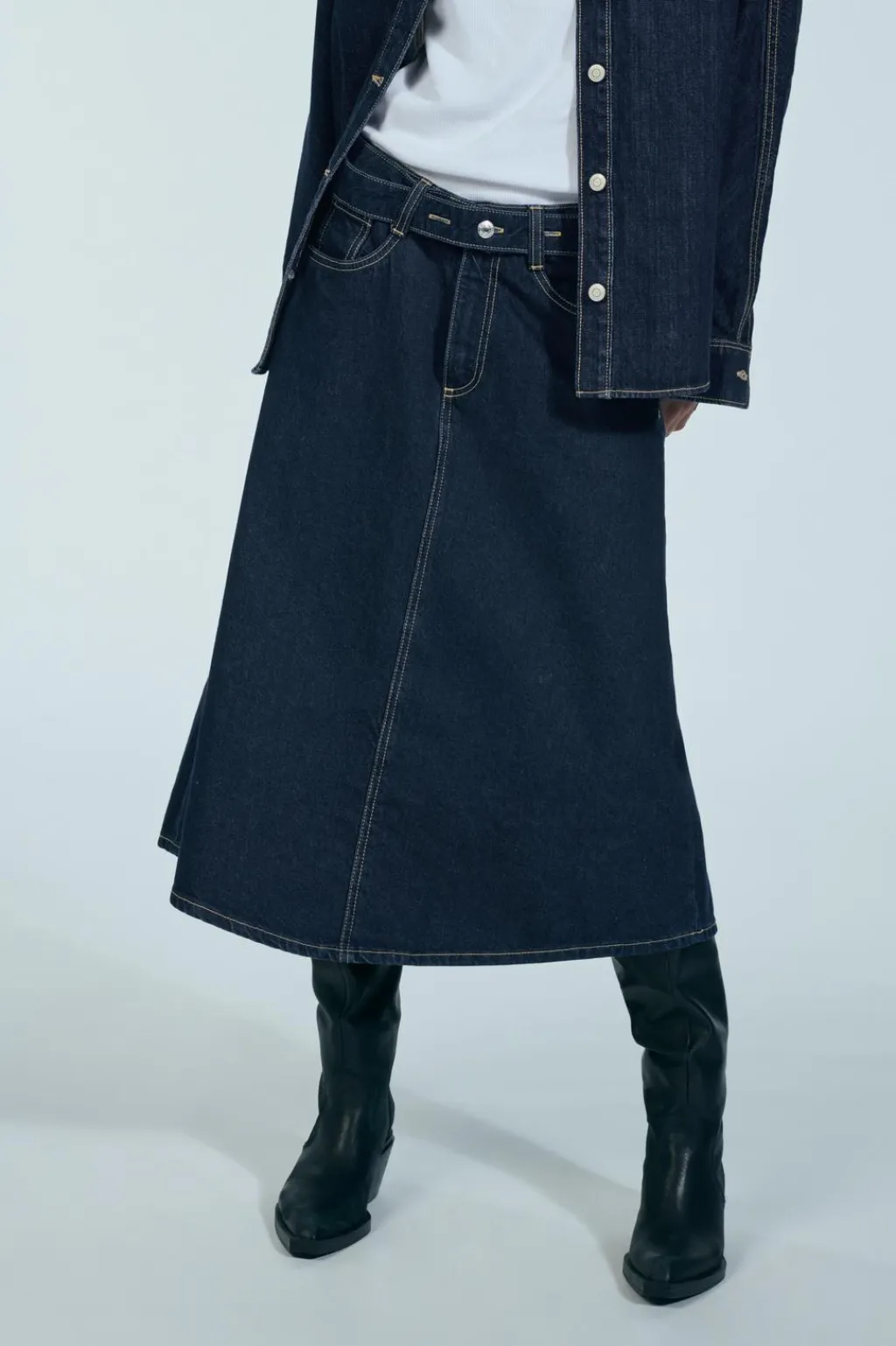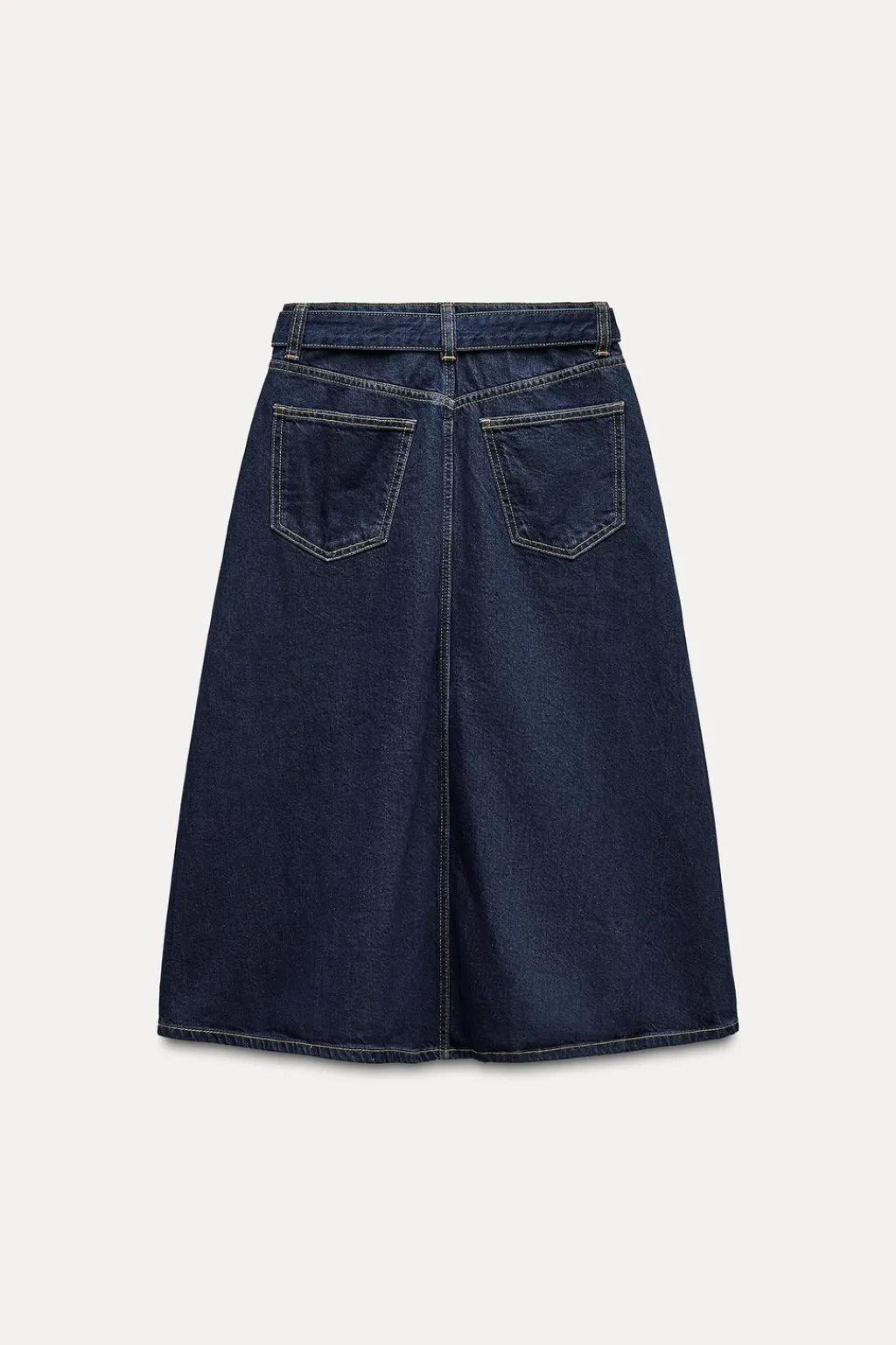 Falda midi de tiro medio con trabillas y cinco bolsillos. Cinturón en mismo tejido. Detalle de costuras a contraste. Cierre frontal con cremallera y botón metálico.