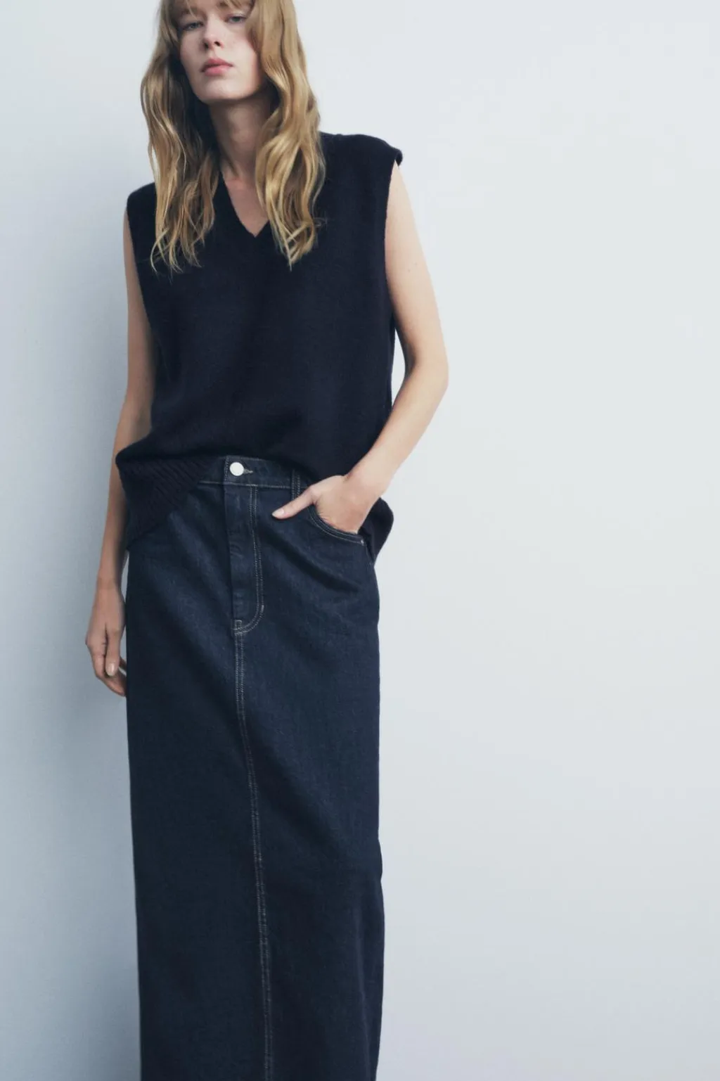 Falda larga de tiro alto y cintura con trabillas. Cinco bolsillos. Detalle de pespuntes marcados a contraste. Bajo acabado con abertura en espalda. Cierre frontal con cremallera y botón metálico.
