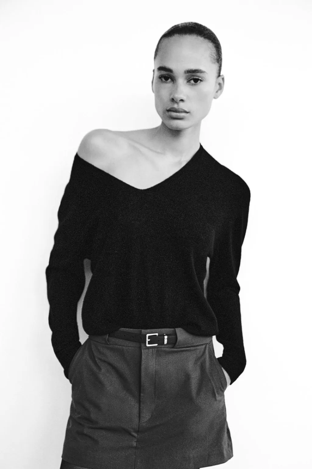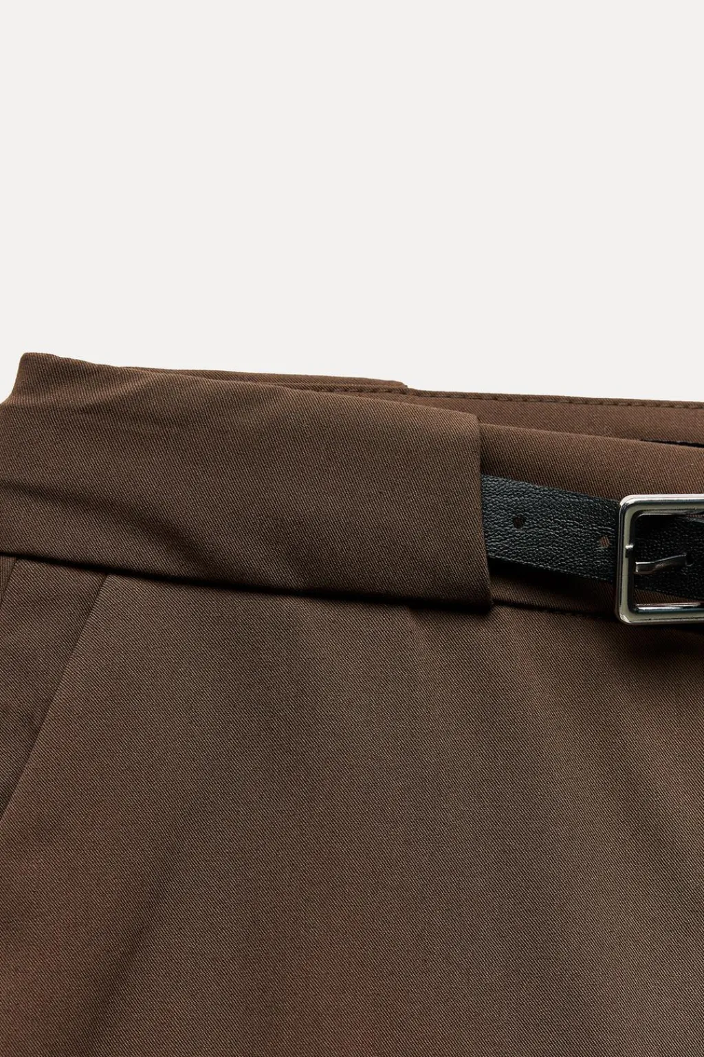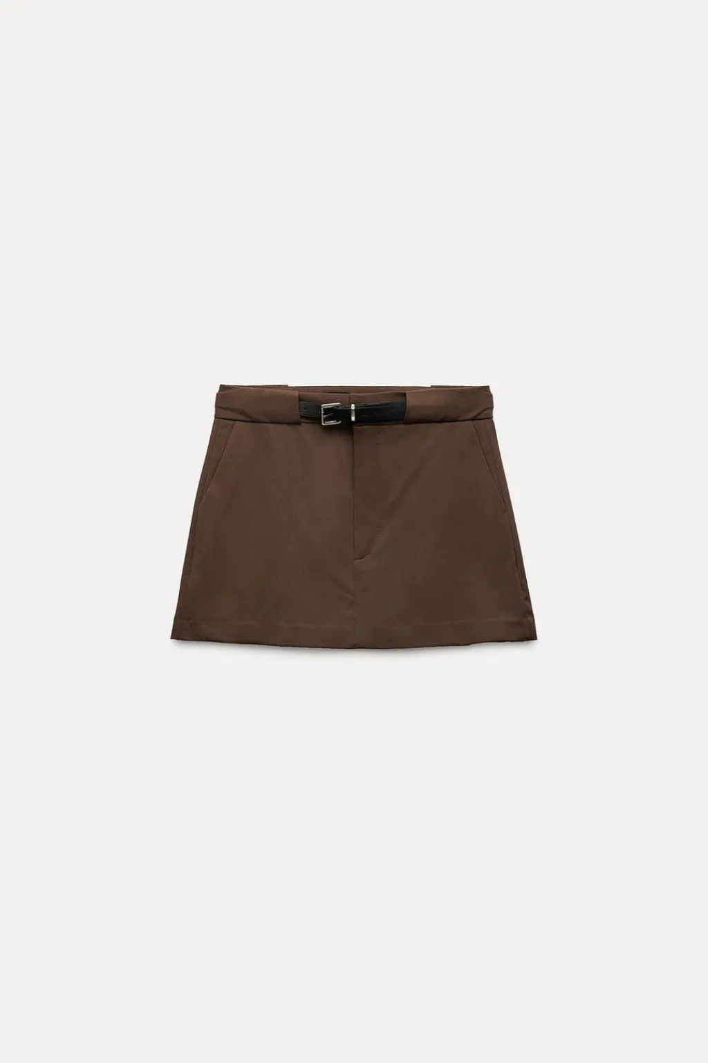 Falda pantalón de tiro medio. Bolsillos laterales y falsos bolsillos de vivo en espalda. Cinturón combinado a contraste con hebilla metálica. Cierre frontal con cremallera, botón interior y ganchos metálicos.