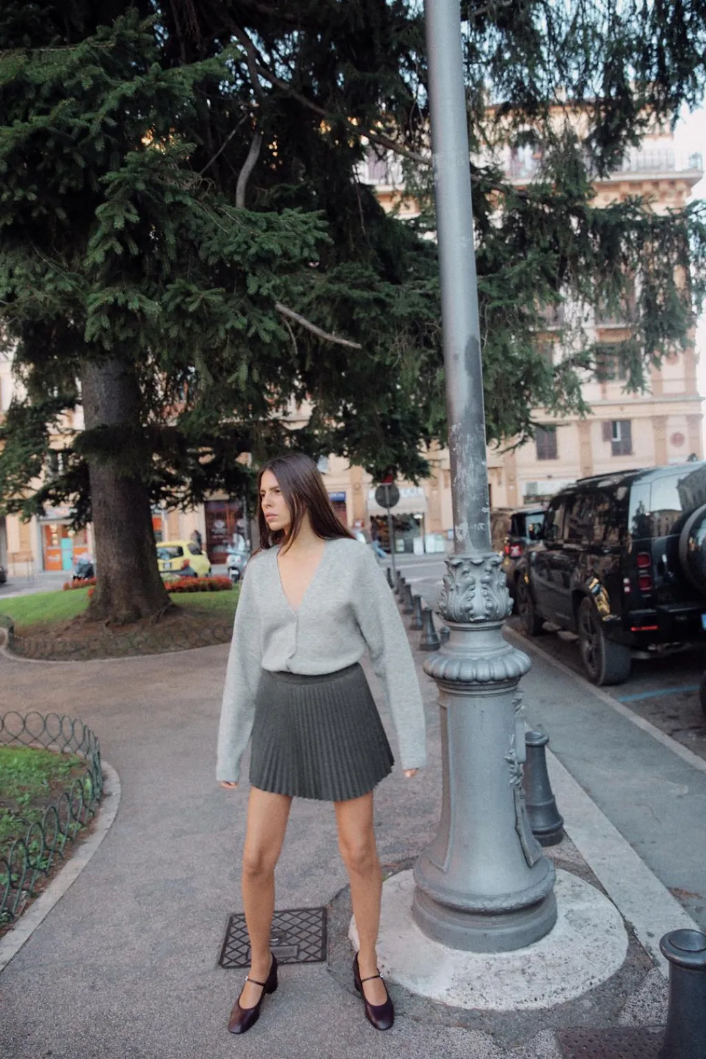 Falda pantalón de tiro alto con pliegues. Cierre lateral con cremallera oculta en costura.