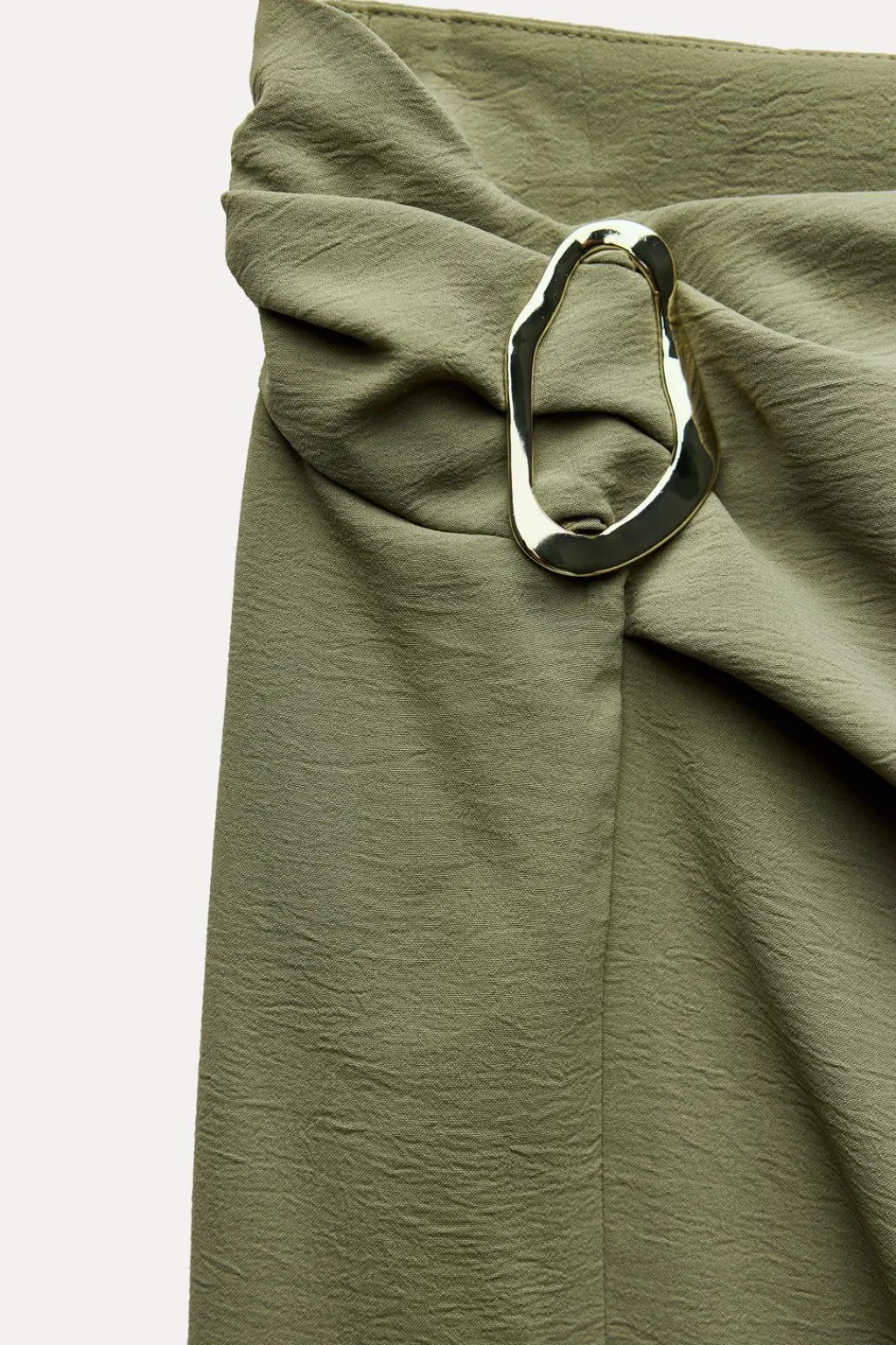Falda midi de tiro alto. Detalle de hebilla metálica y frunces. Bajo con abertura. Cierre lateral con cremallera oculta en costura.