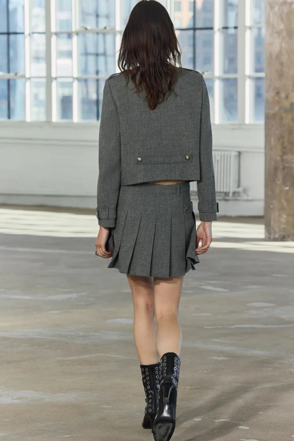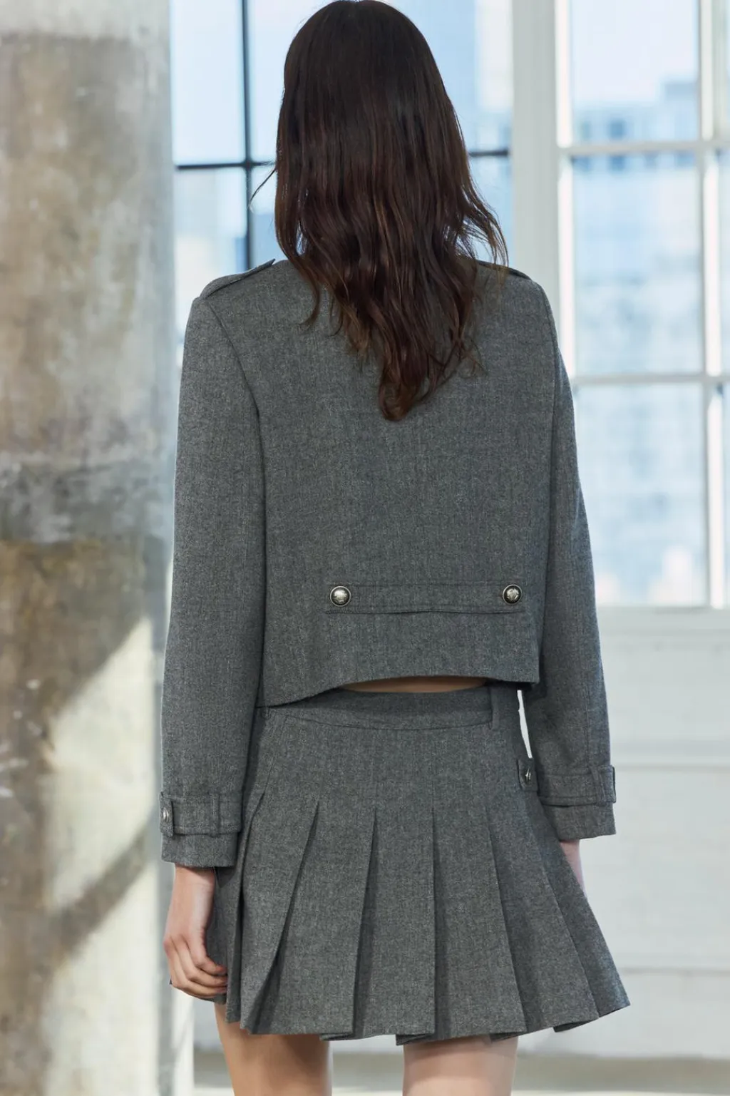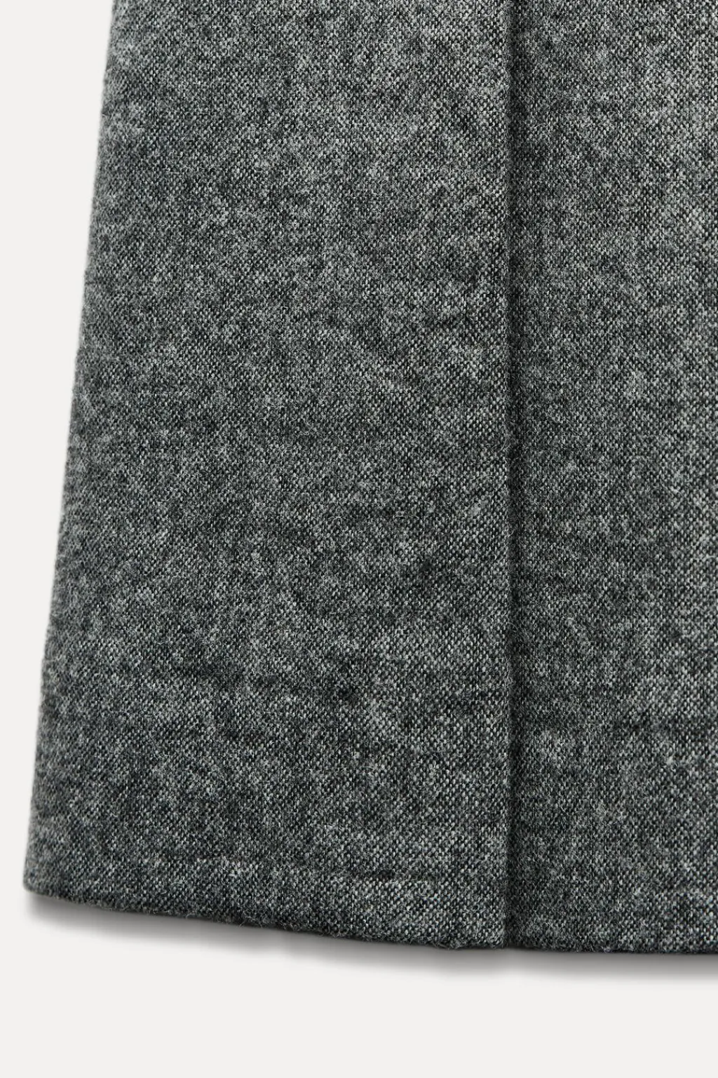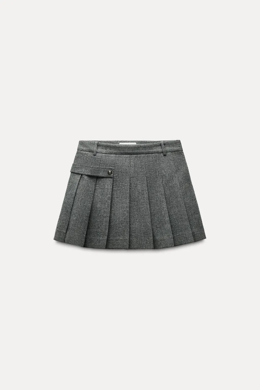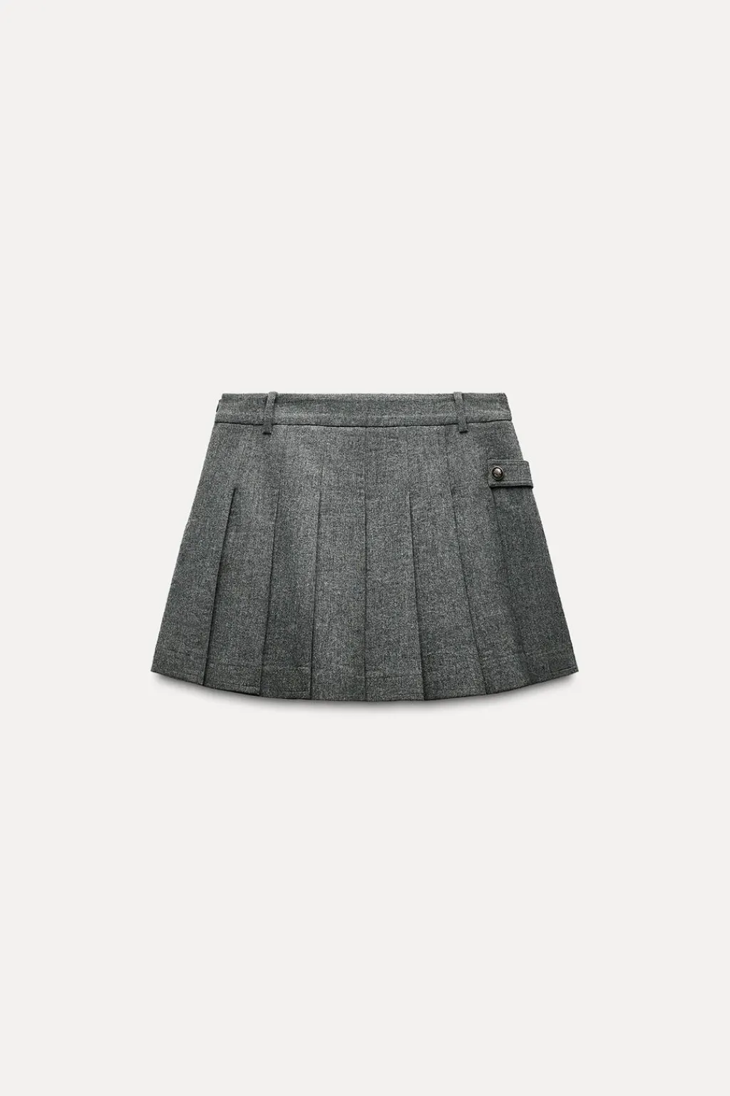 Falda corta confeccionada en hilatura con lana. Tiro medio y cintura con trabillas. Detalle de tira en mismo tejido con botón metálico en relieve.Bajo acabado en tablas. Cierre lateral con cremallera oculta en costura.