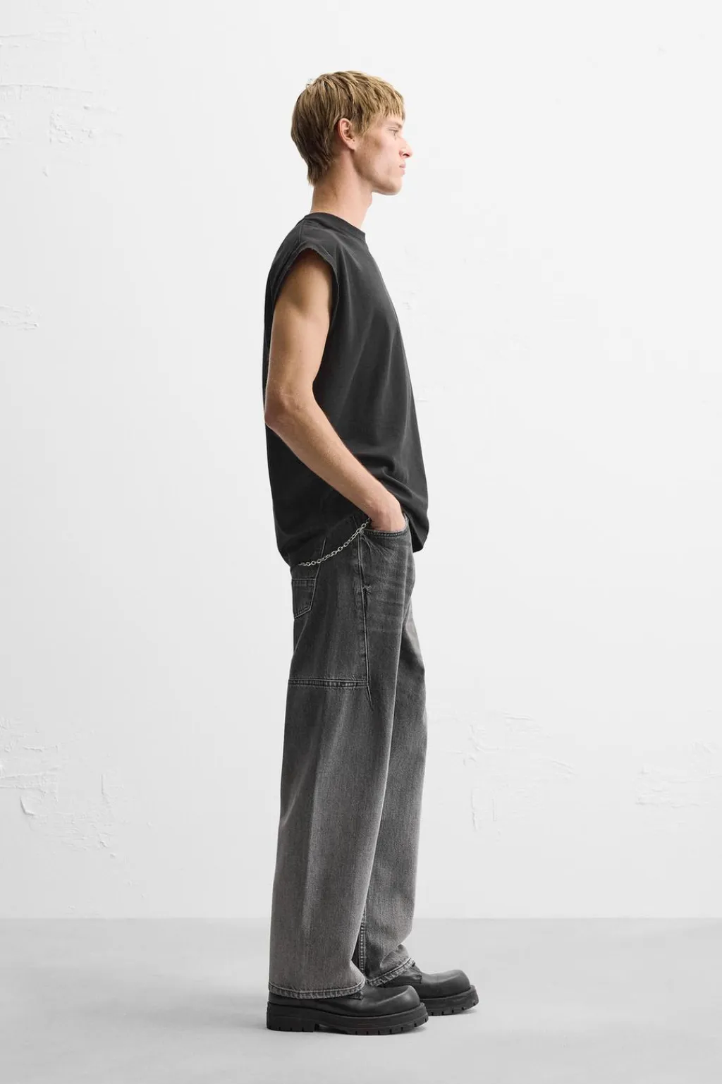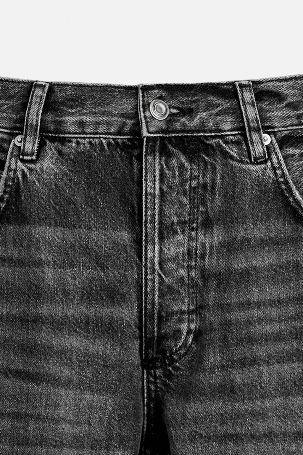 Jeans straight loose fit. Cinco bolsillos. Detalle de costuras con acabados irregulares. Efecto lavado. Cierre frontal con cremallera y botón.