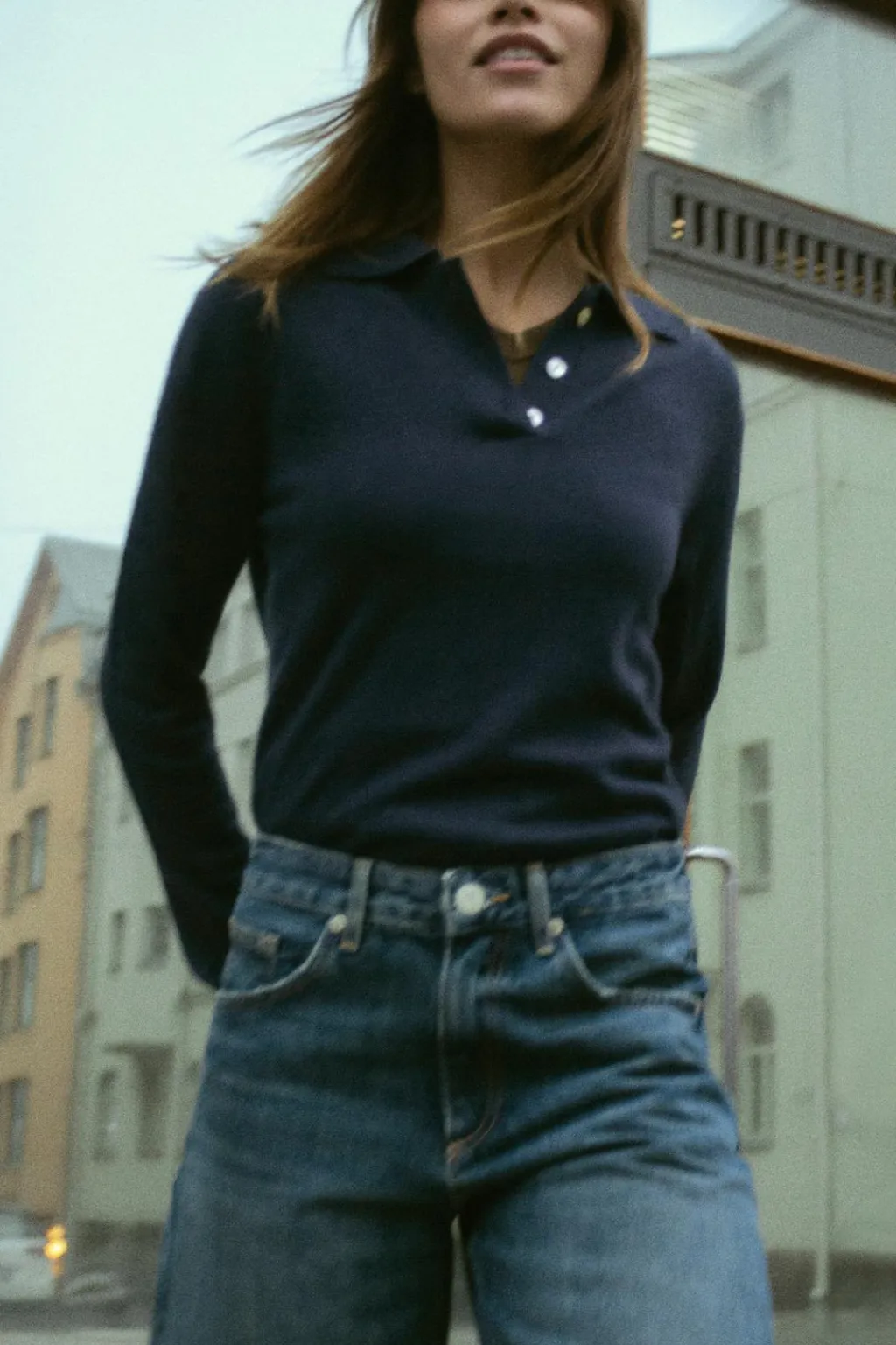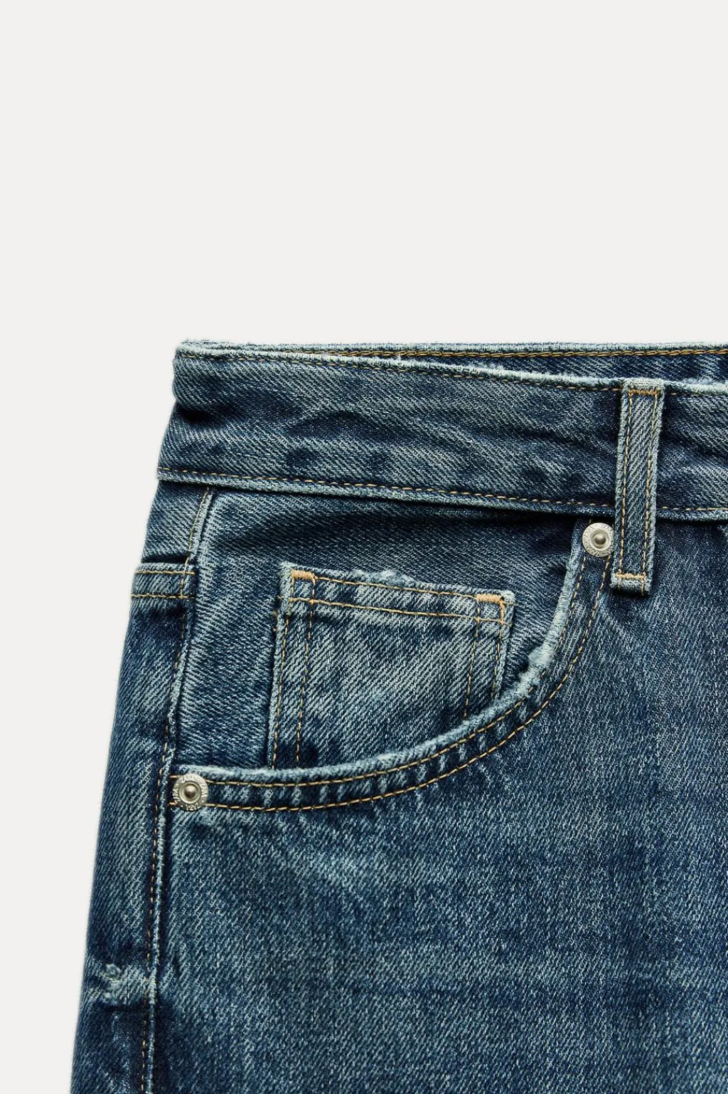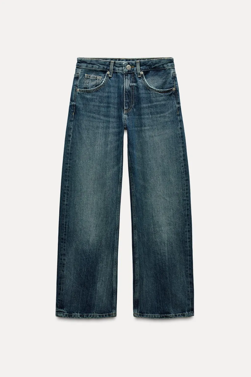 Jeans de tiro medio con trabillas y cinco bolsillos. Efecto lavado. Cierre frontal con cremallera y botón metálico.