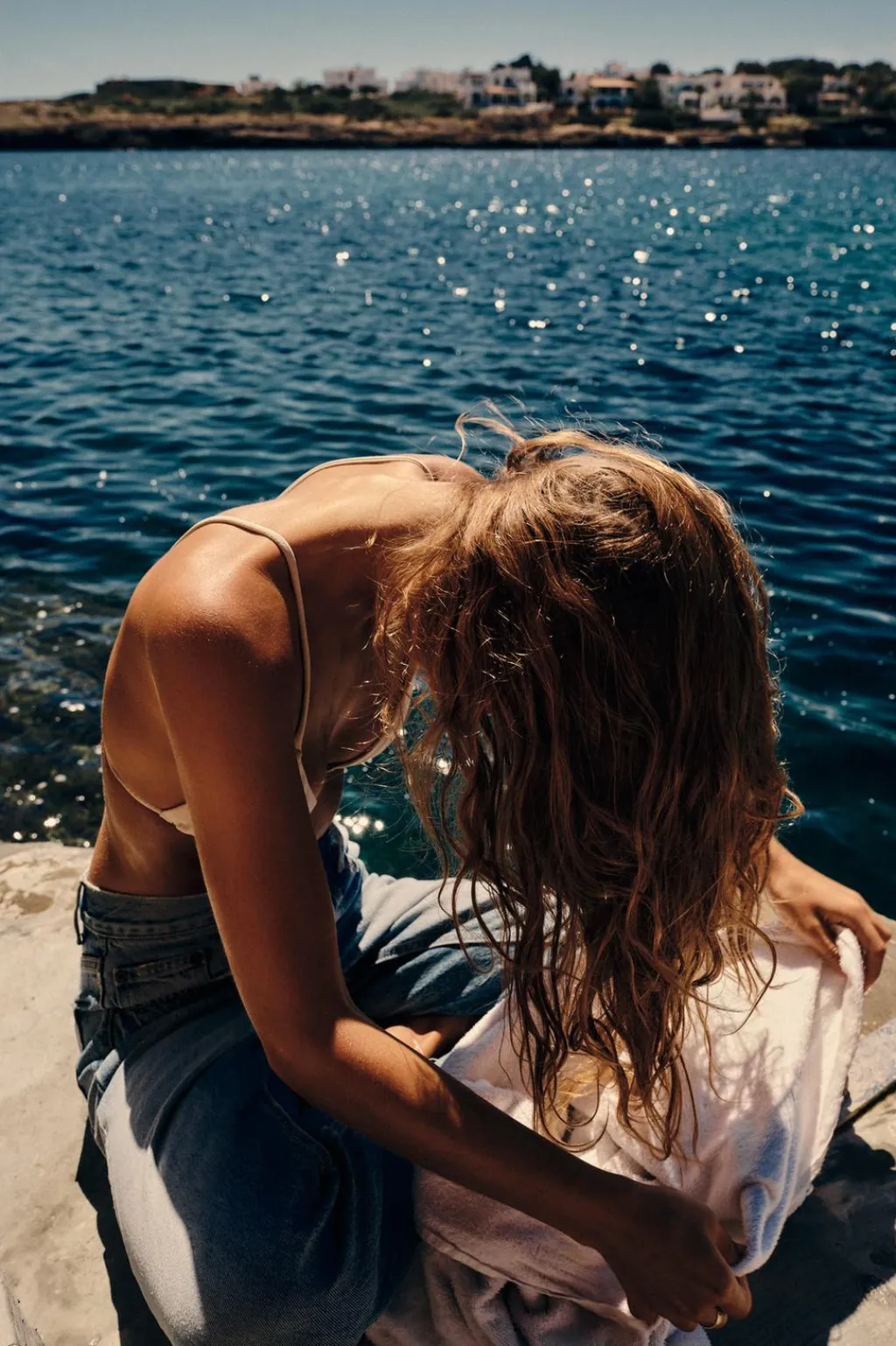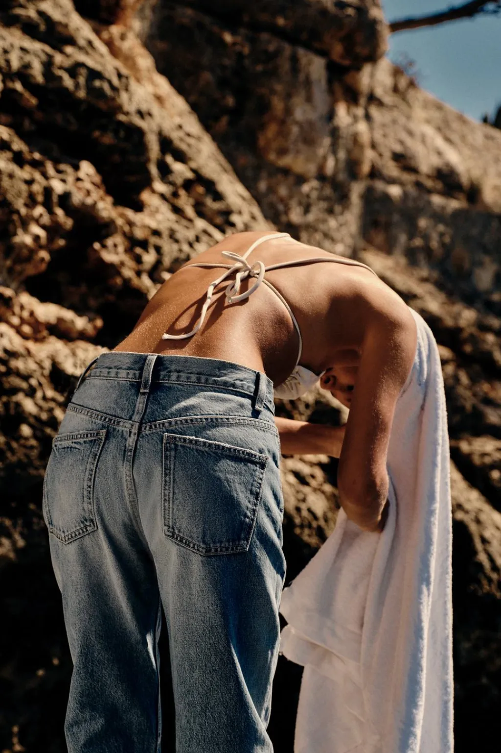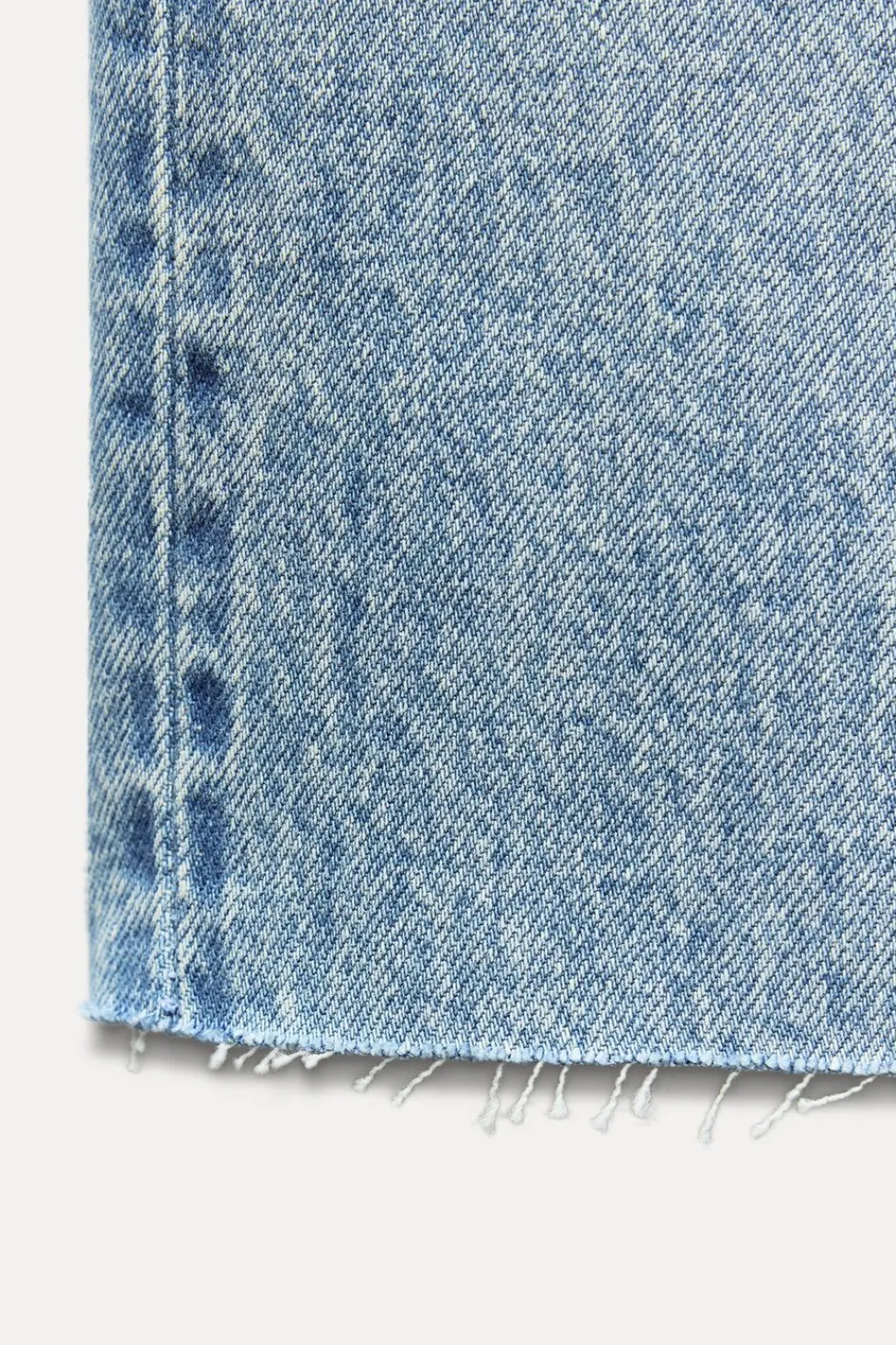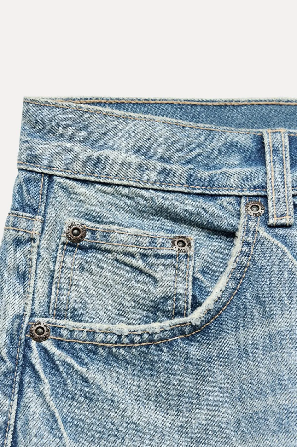 Jeans de tiro alto con cinco bolsillos. Efecto lavado. Bajos acabados sin costura. Cierre frontal con cremallera y botón metálico.