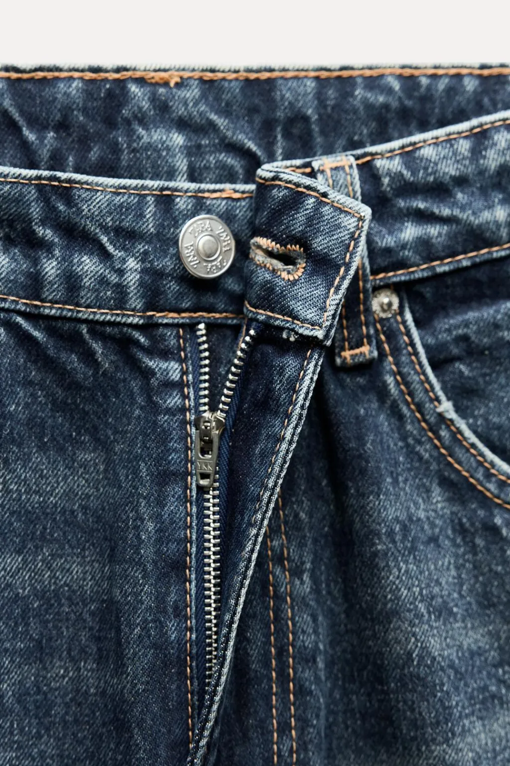 Jeans de tiro alto con cinco bolsillos. Efecto lavado. Cierre frontal con cremallera y botón.