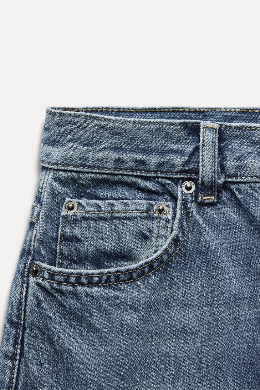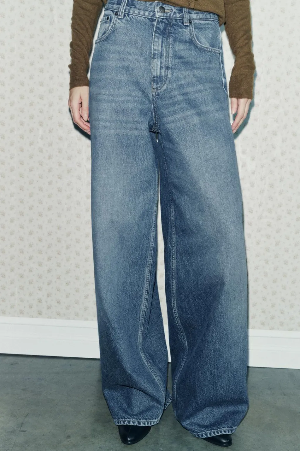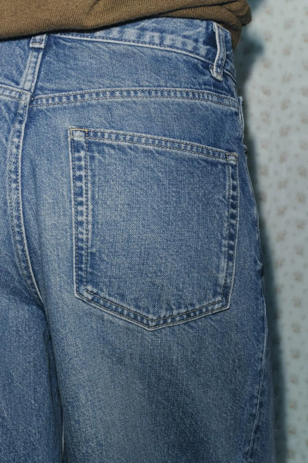 Jeans de tiro medio y cintura con trabillas. Cinco bolsillos. Efecto lavado. Pierna ancha. Cierre frontal con cremallera y botón.