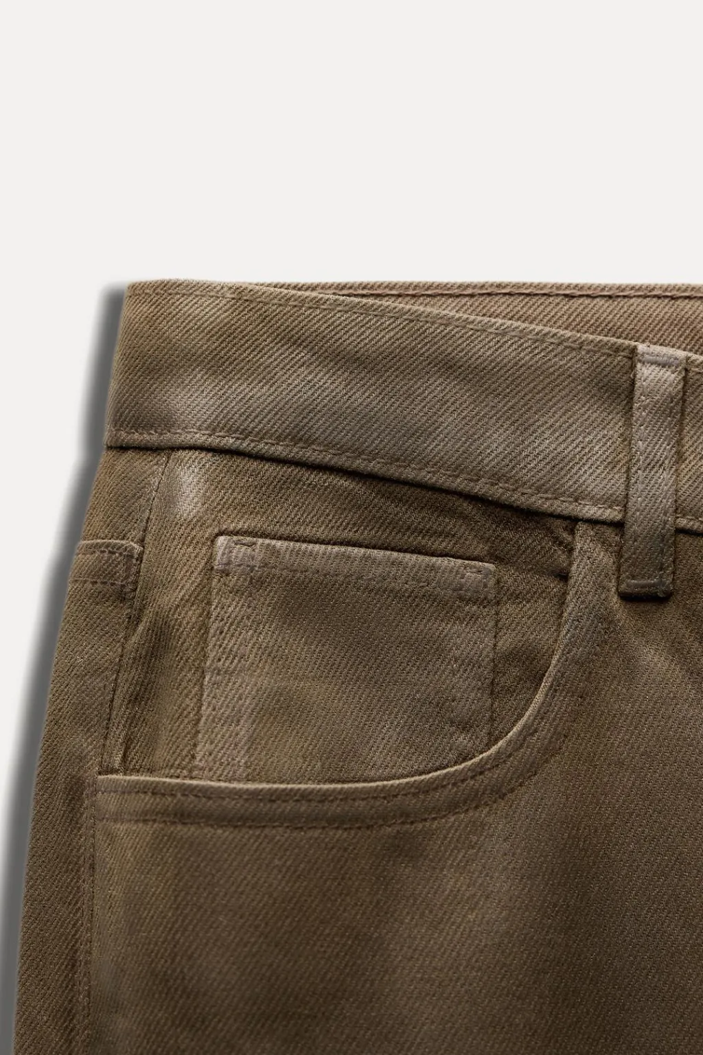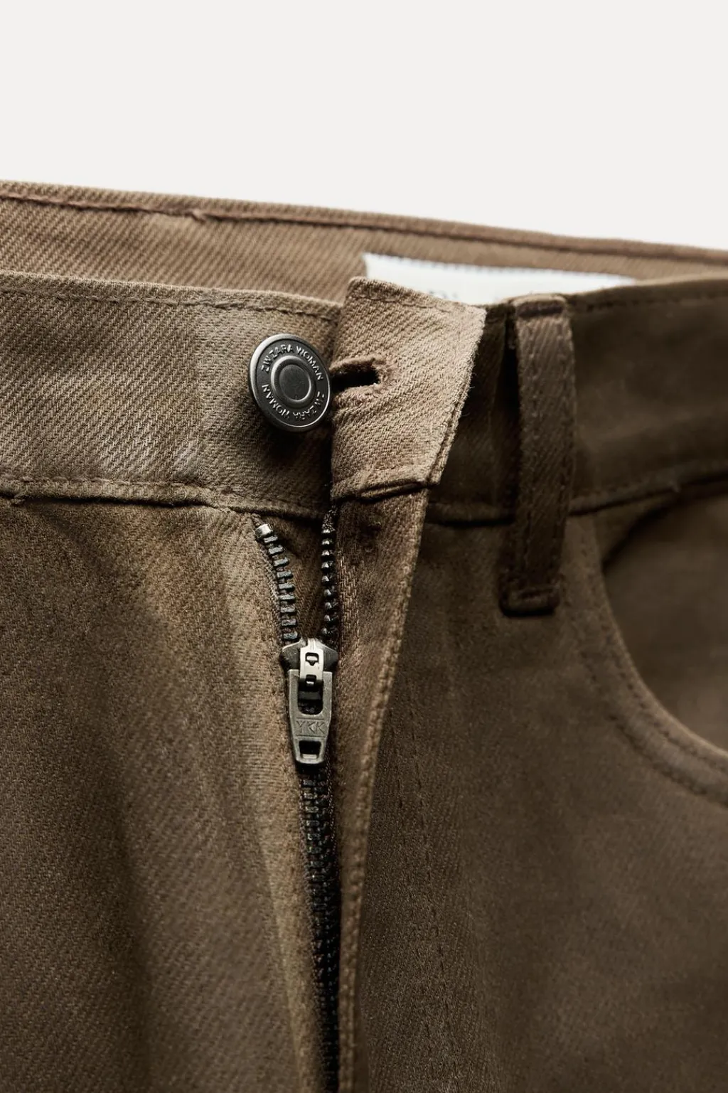 Jeans de tiro medio y cintura con trabillas. Cinco bolsillos. Pierna recta. Cierre frontal con cremallera y botón.