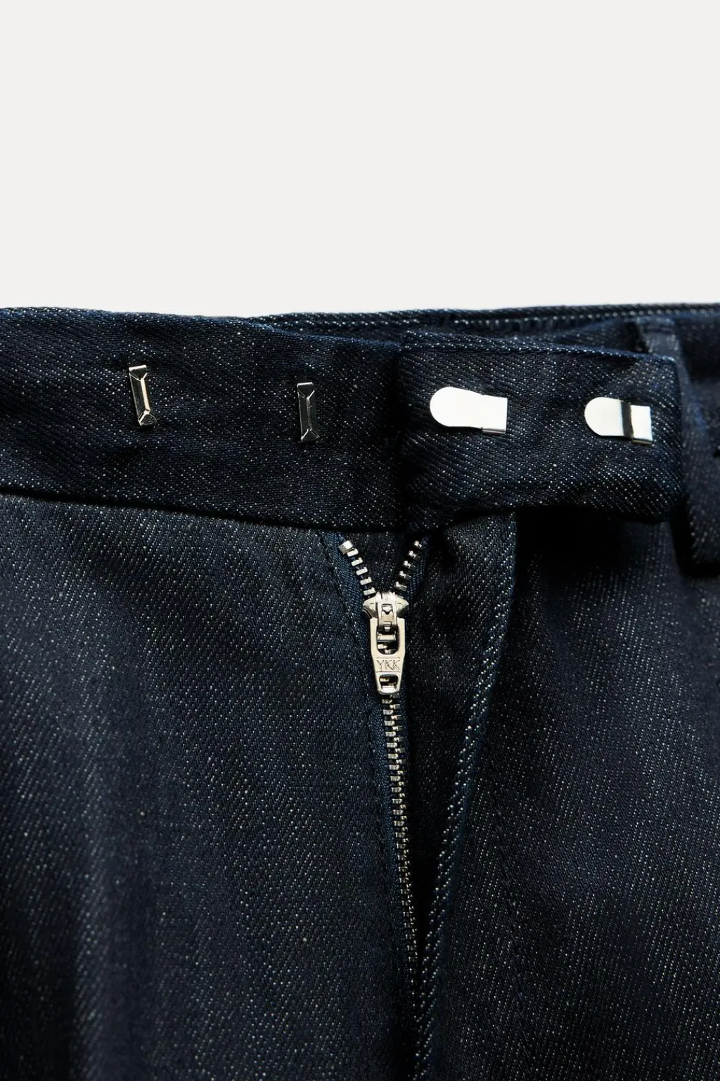 Jeans de tiro medio y cintura con trabillas. Bolsillos laterales ocultos en costura. Detalle de raya planchada en delantero. Cierre frontal con cremallera, botón y gancho metálico.
