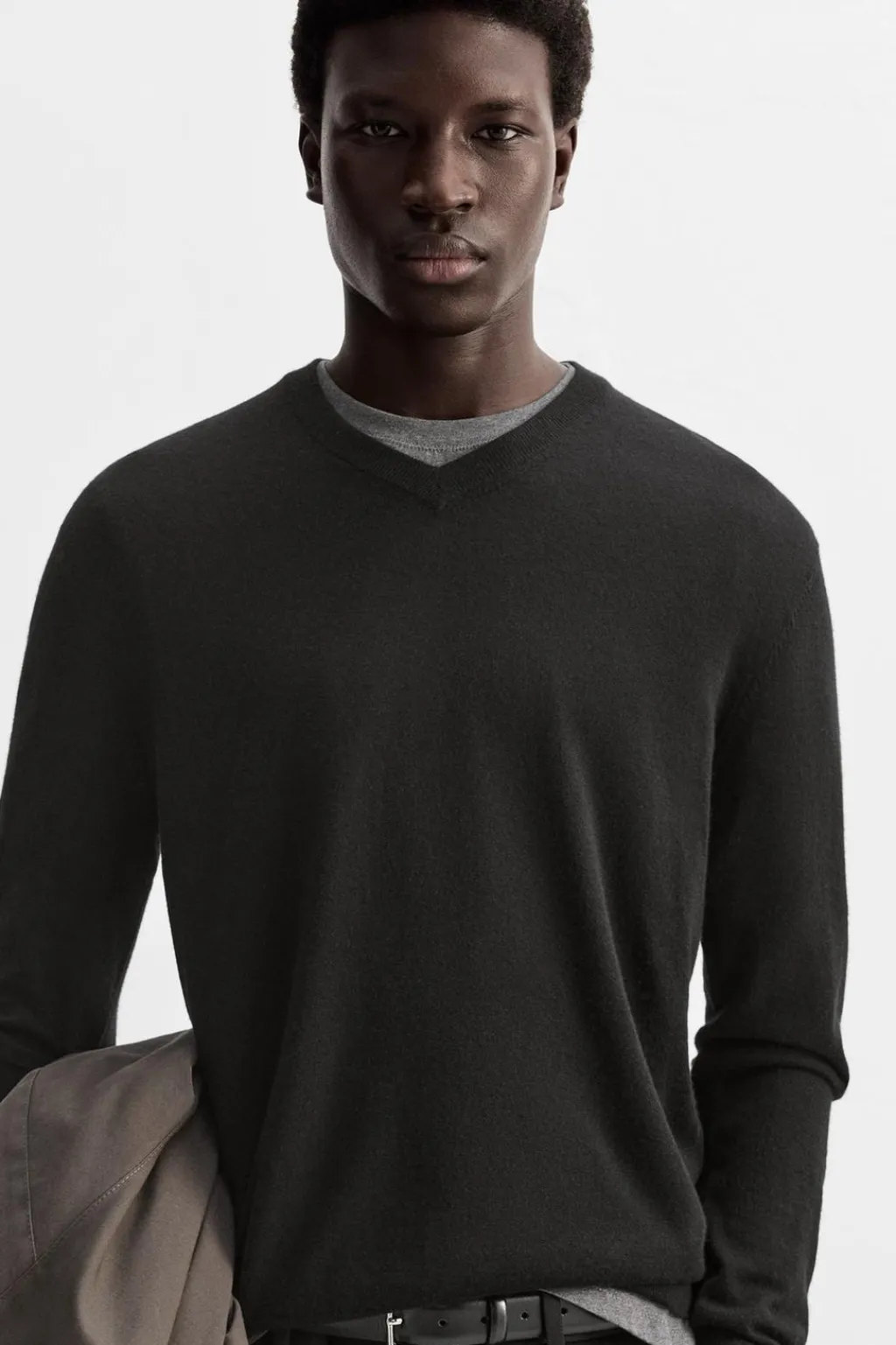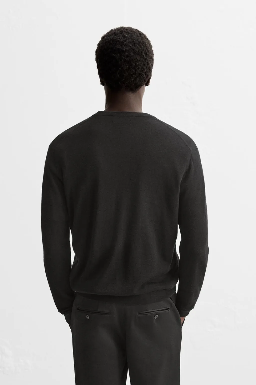 Jersey regular fit de punto ligero tejido en hilatura con mezcla de de lana merino y cashmere. Cuello pico y manga larga. Acabados en rib.