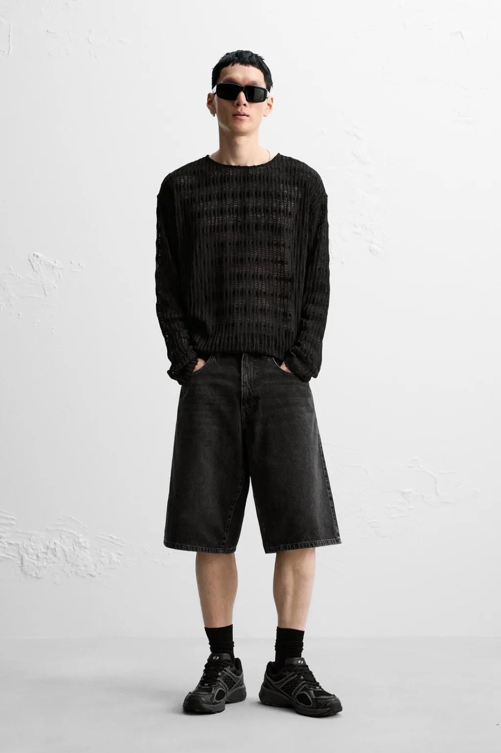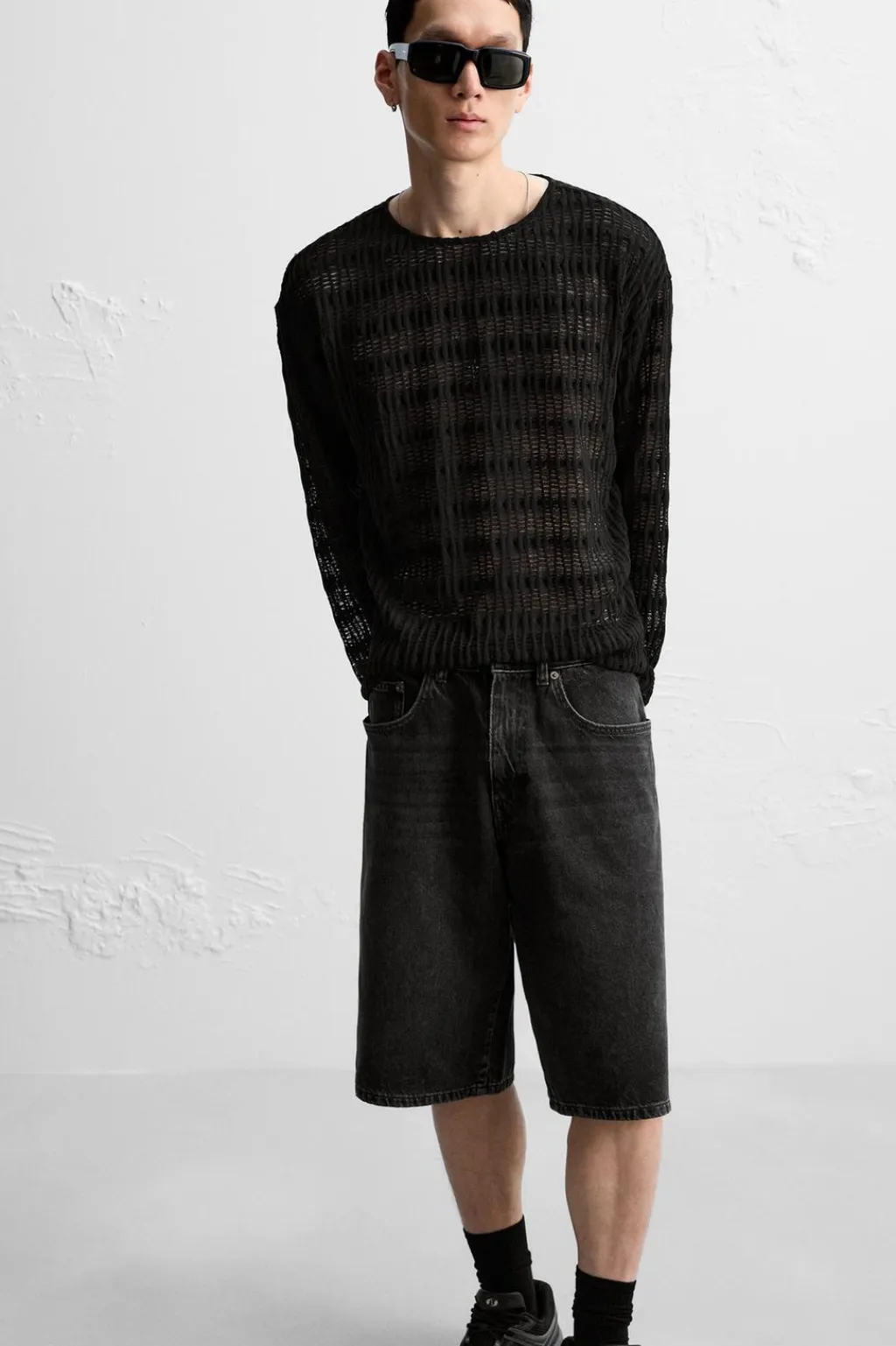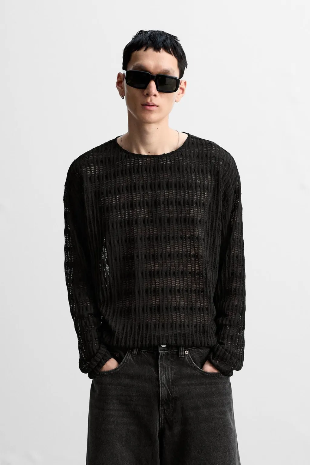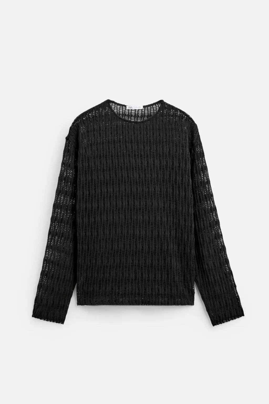 Jersey tejido en hilatura con algodón y estructura abierta. Cuello redondo y manga larga.