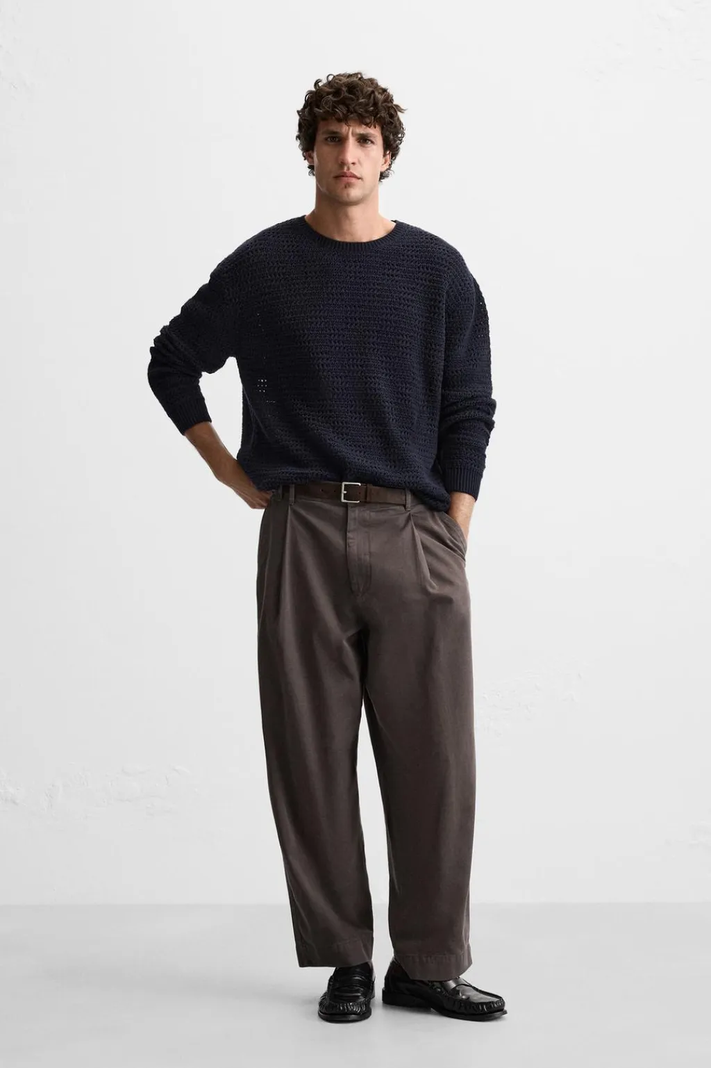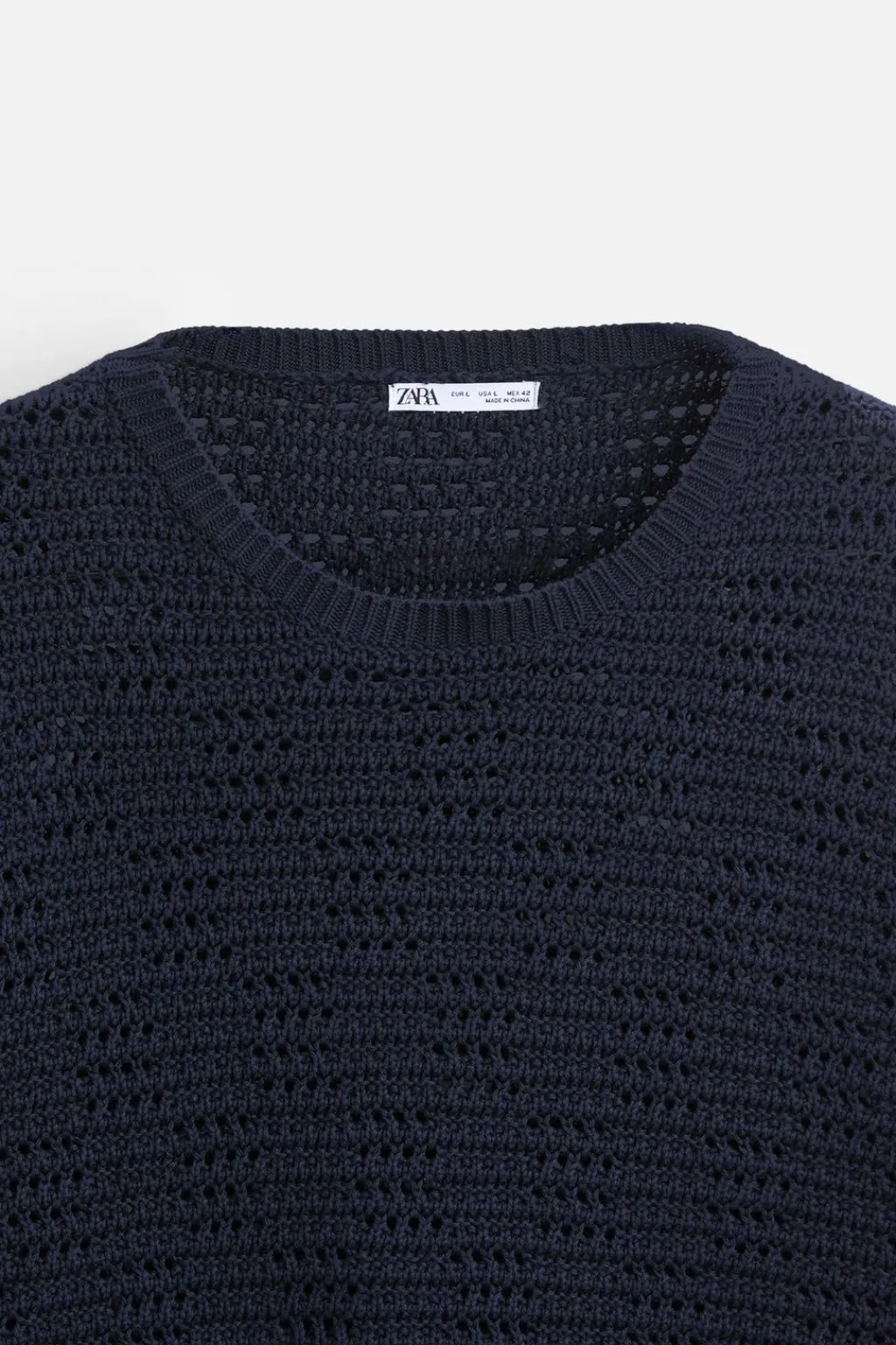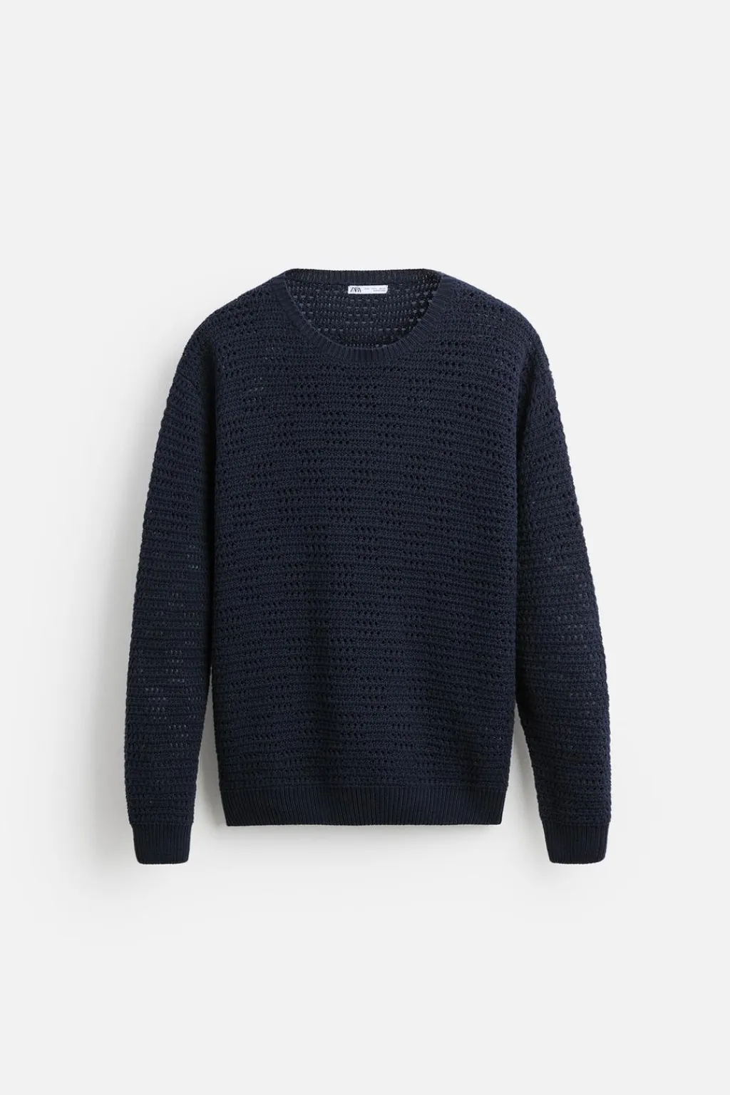 Jersey tejido en hilatura de algodón y estructura abierta. Cuello redondo y manga larga. Acabados con rib.