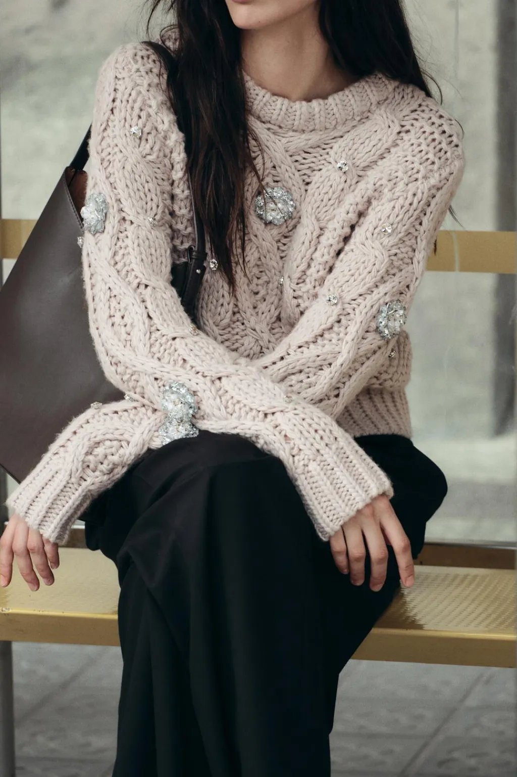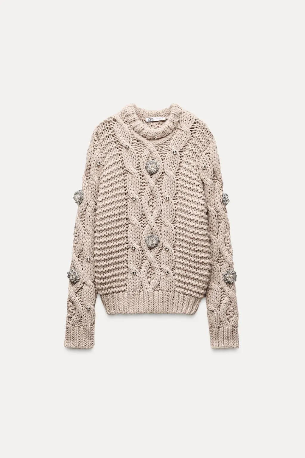 Jersey de cuello redondo y manga larga. Detalle aplicación de abalorios joya. Acabados en rib.