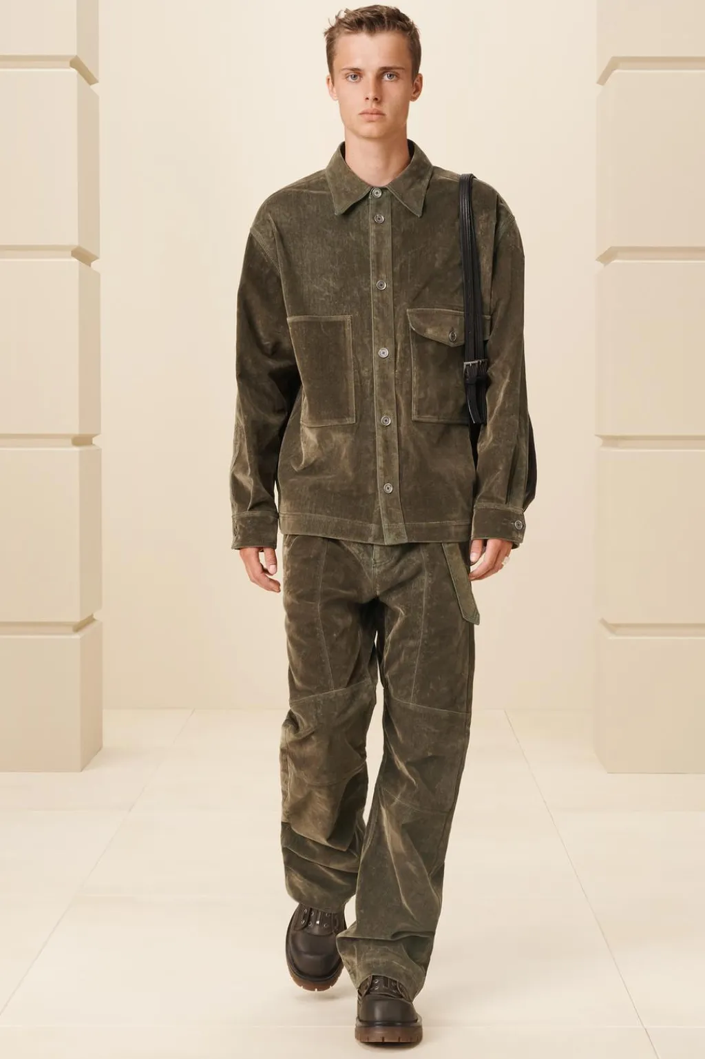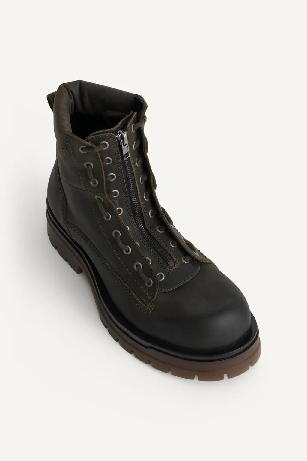 Bota fabricada en piel con cierre central con cremallera. Los cordones sirven para fijar la lengüeta con cremallera a los laterales de la bota. Plantilla en piel. Horma cuadrada. Suela con volumen y piso track.