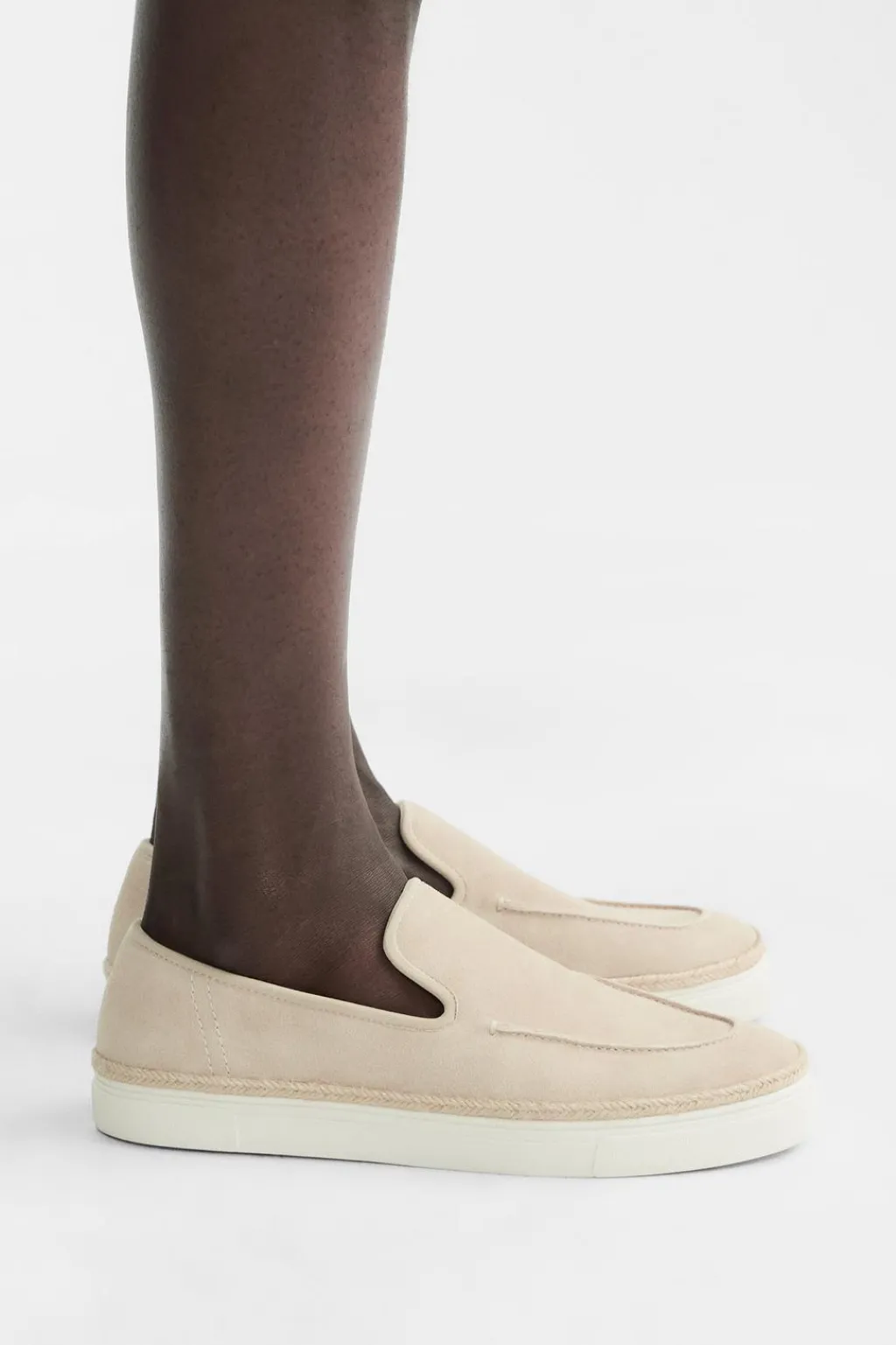 Mocasín casual. Parte superior fabricada en piel con acabado serraje. Detalle de bordón en el empeine. Piso con detalle de yute y suela estilo zapatilla deportiva.