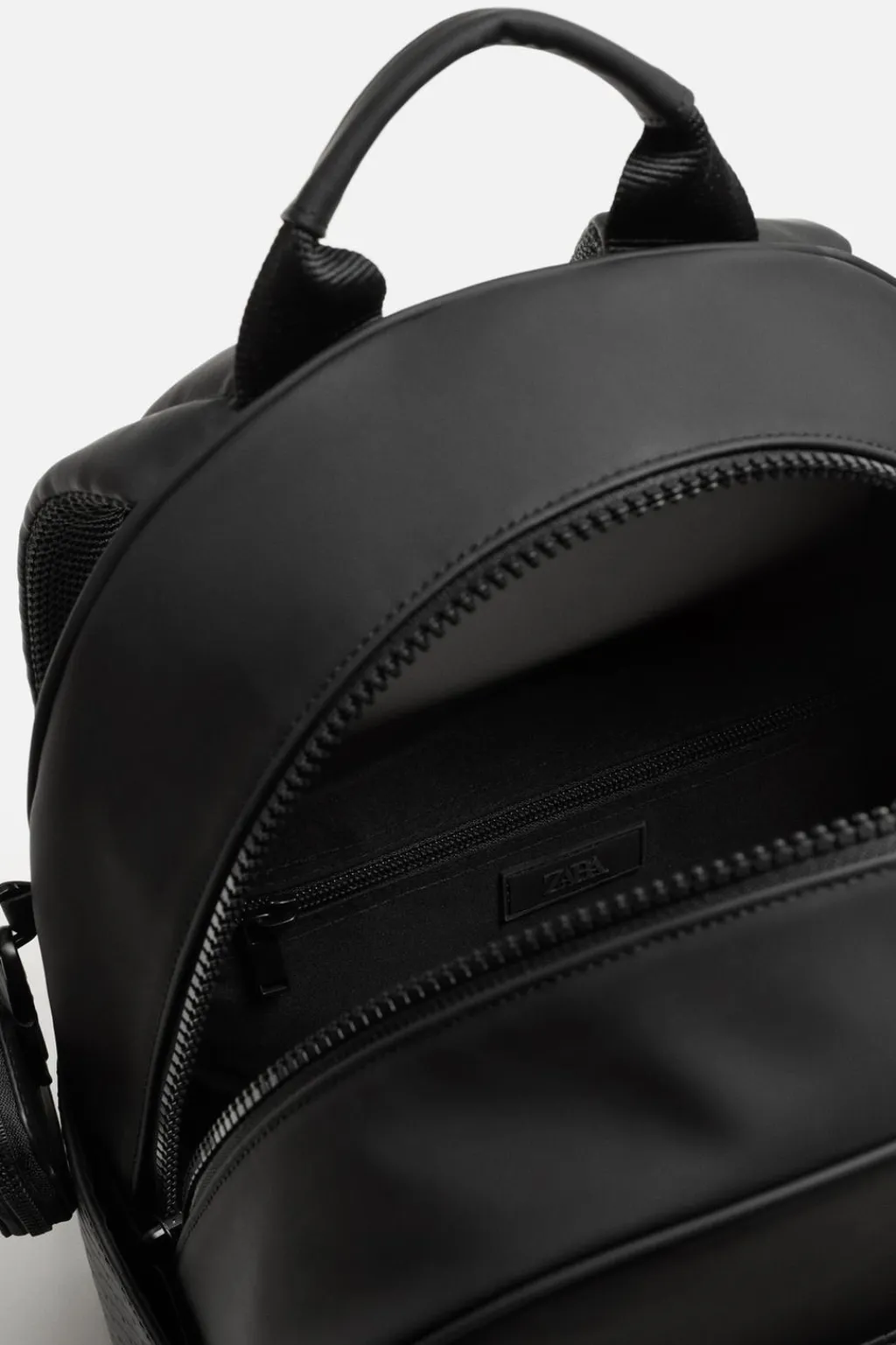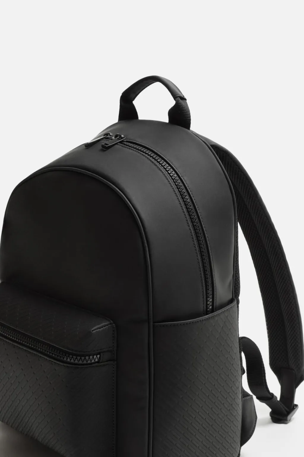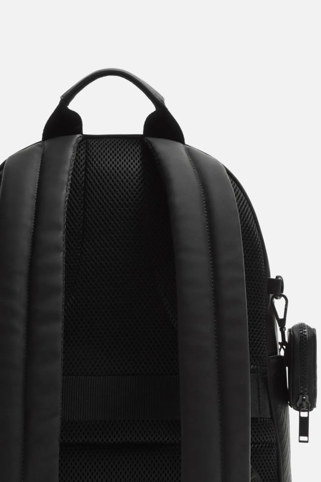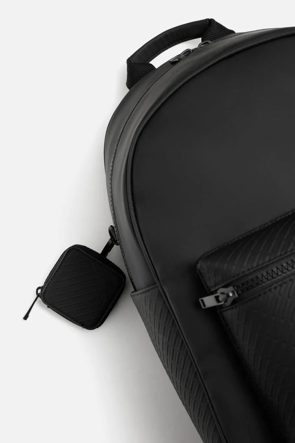 Mochila de acabado engomado con monedero. Compartimento principal con cierra mediante cremallera, cuenta con un espacio para dispositivos electrónicos de hasta 13 pulgadas y con un bolsillo con cierre mediante cremallera. Parte frontal tiene un bolsillo con cierre mediante cremallera. Bolsillos planos en los laterales. El respaldo es acolchado y cuenta con sujeción para adaptarlo a equipajes. Asa de mano y dos asas de hombro ajustables y acolchadas.