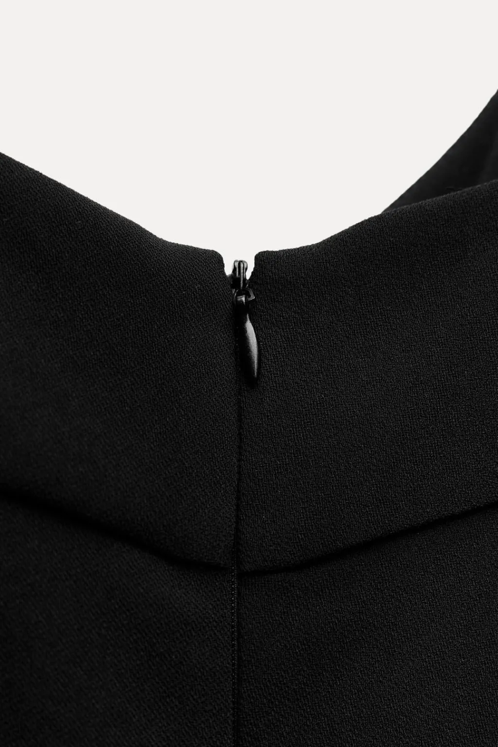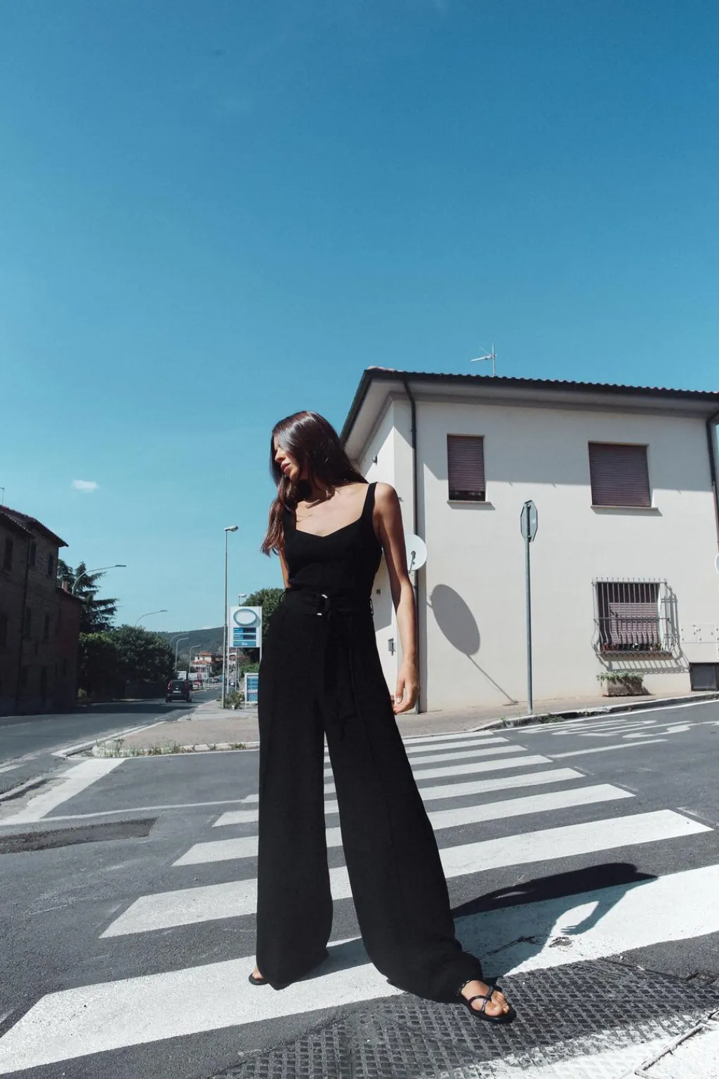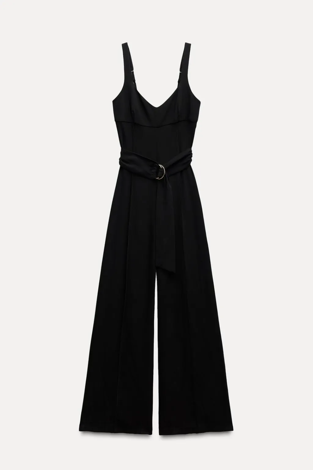 Mono de escote redondo y tirantes finos ajustables. Detalle de cinturón del mismo tejido con doble hebilla dorada. Pernera ancha. Cierre en espalda con cremallera oculta en costura.