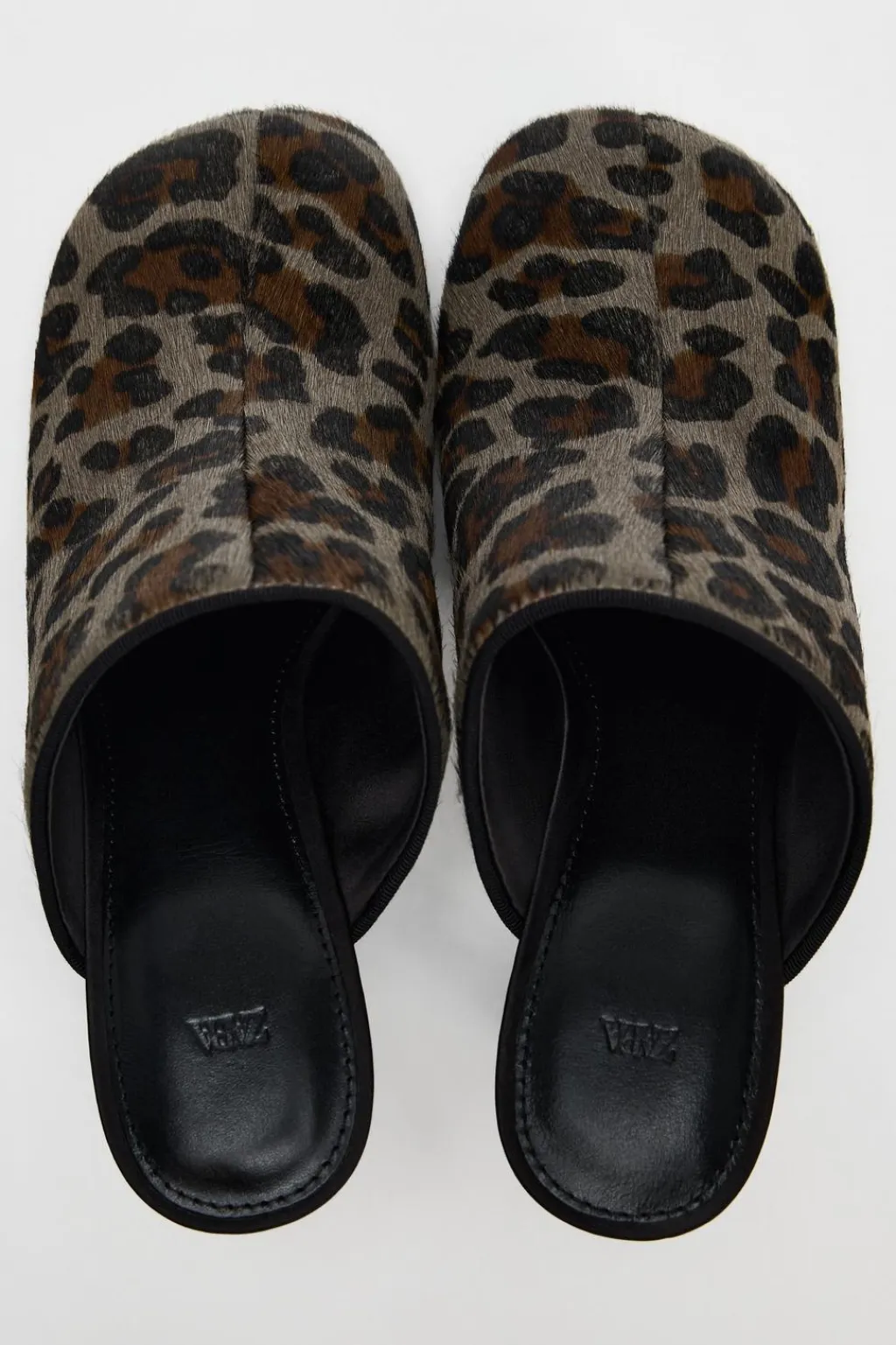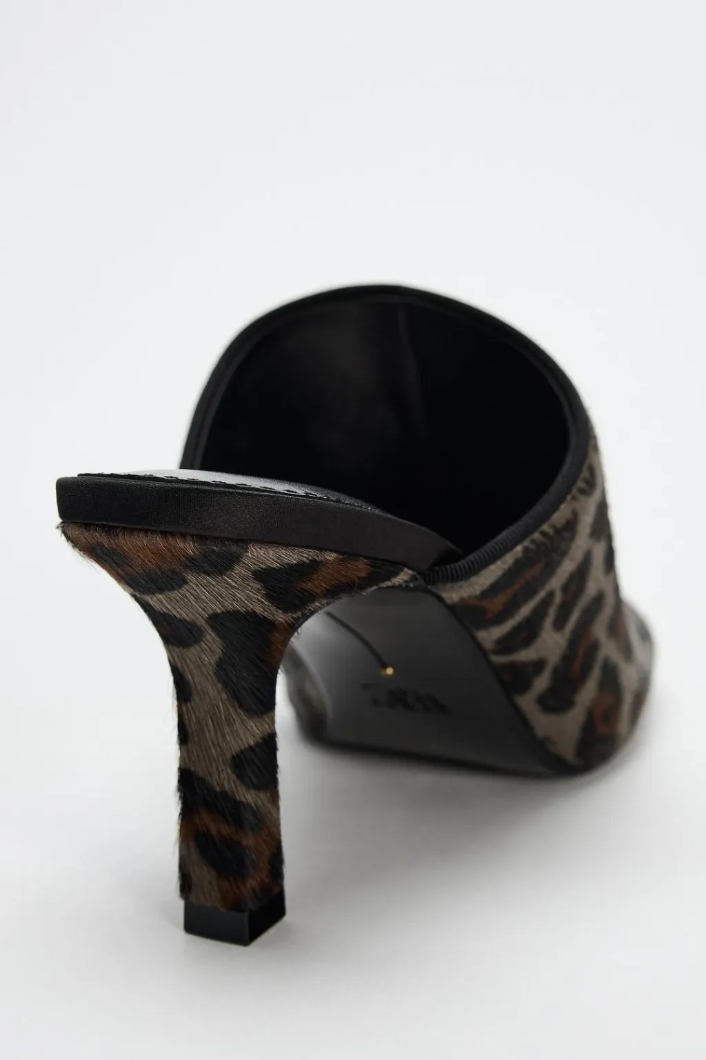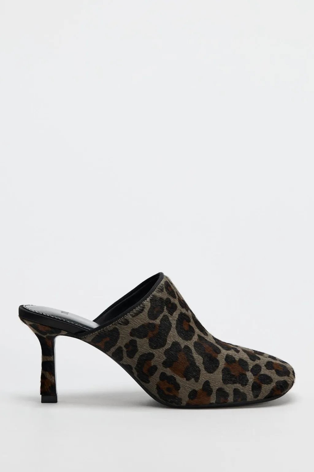 Zapato tacón destalonado tipo mule de piel con pelo. Estampado animal. Acabado en punta cuadrada.
