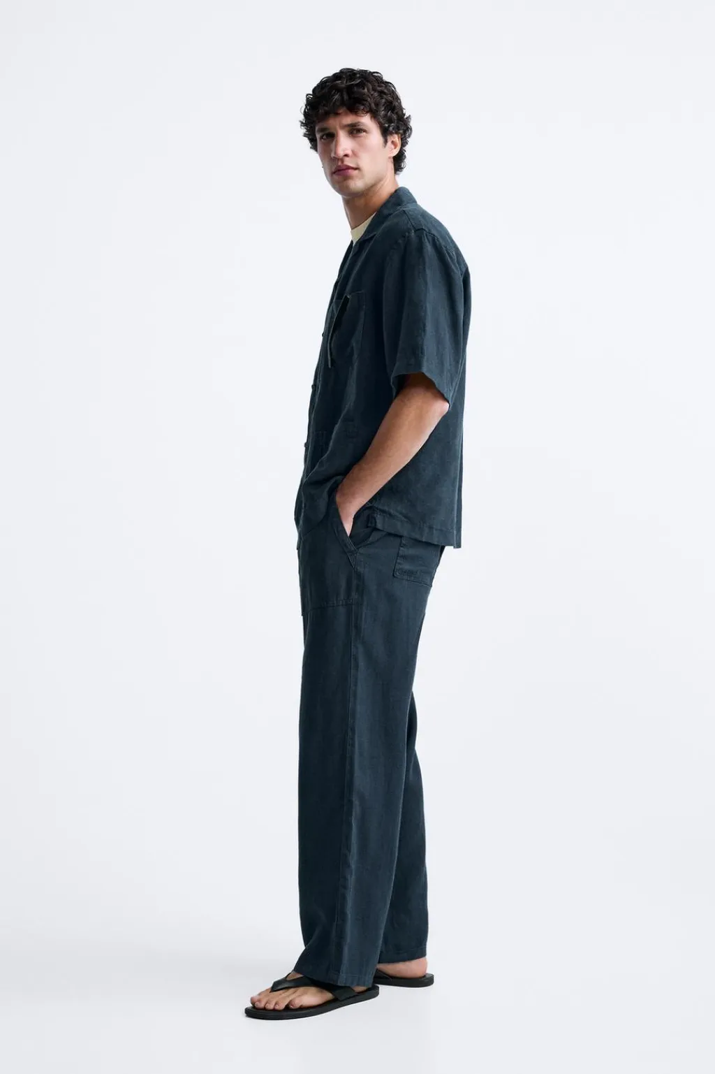 Pantalón regular fit confeccionado en tejido de lino. Cintura elástica ajustable con cordón. Bolsillos frontales y detalle de bolsillos traseros de plastrón con solapa. Efecto lavado.
